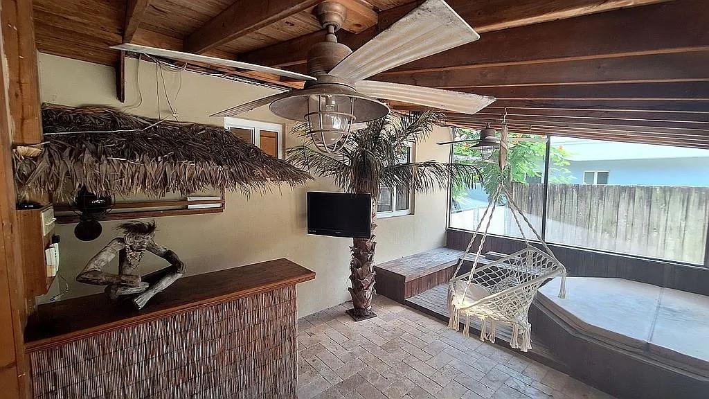 Charming 3-Bedroom, 2-Bath Home on a Spacious Lot! Welcome to this beautifully maintained home featuring vaulted wood-beam ceilings with skylights, a cozy wood-burning fireplace, and a warm blend of hardwood, travertine marble, and tile flooring throughout. Enjoy Florida living at its finest with a covered screened patio, complete with a tiki bar and jacuzzi, overlooking a uniquely designed saltwater pool. The large lot provides ample off-street parking, abundant storage—including a sizable shed—and endless possibilities. This home also offers a versatile layout with the potential for a private suite with its own separate entry. Located in a fantastic neighborhood, just minutes from Port Everglades, the airport, beaches, and major highways. Best of all, it’s not in a flood zone!