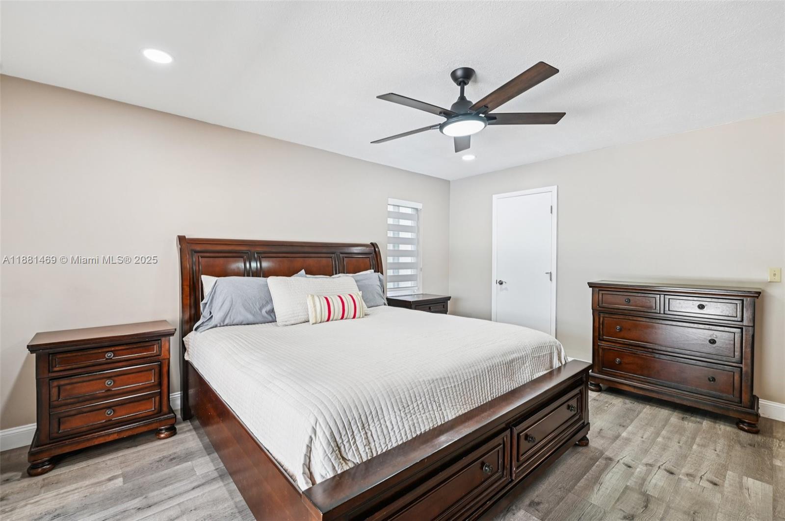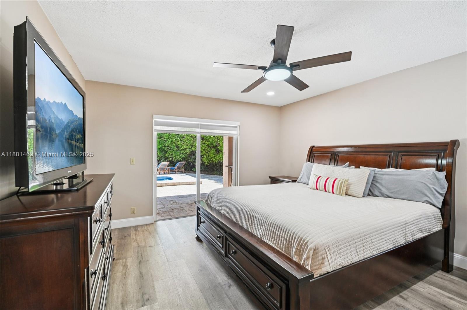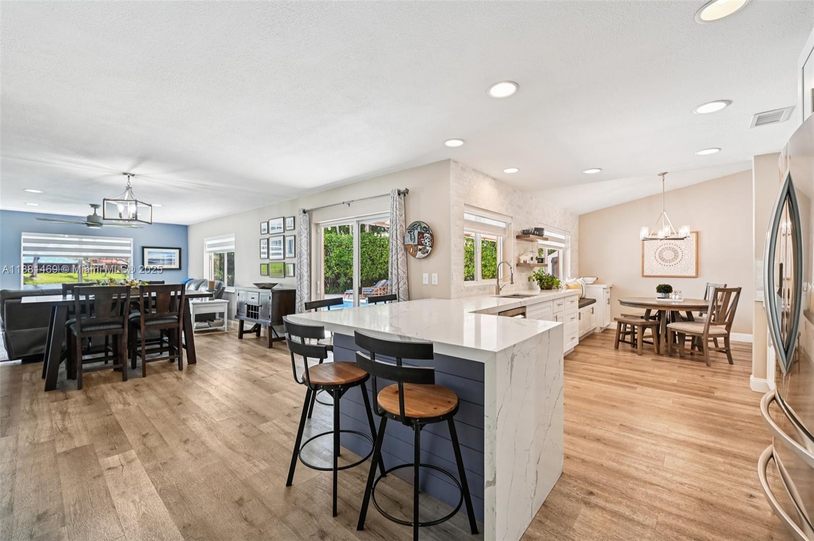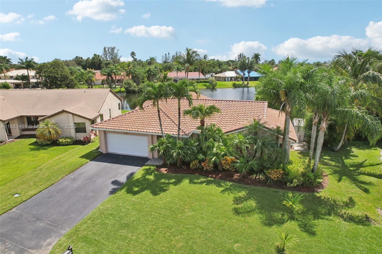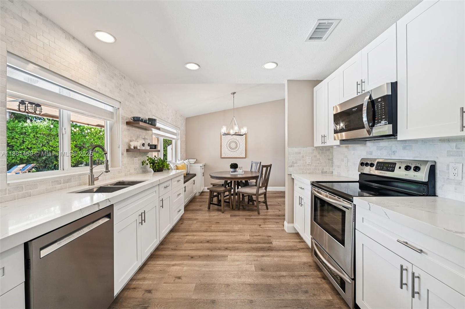 This stunning 4-bedroom, 2-bathroom pool home is situated on a serene lake in sought-after West Davie. Enjoy piece of mind with a 2024 ROOF and IMPACT WINDOWS AND DOORS. Inside, you'll find a spacious, remodeled kitchen with white shaker cabinets, quartz countertops with a waterfall edge, and convenient seating. The bathrooms have been tastefully updated with modern finishes, and luxury vinyl flooring flows throughout the home. The primary suite includes a large walk-in closet with custom built-ins, and zebra blinds add a contemporary touch to every room. The garage includes built-in cabinets for extra storage. Outside, enjoy a large, resurfaced pool, travertine deck and tranquil lake views. Zoned for A-rated schools and a low annual HOA of just $350, this move-in-ready home has it all.