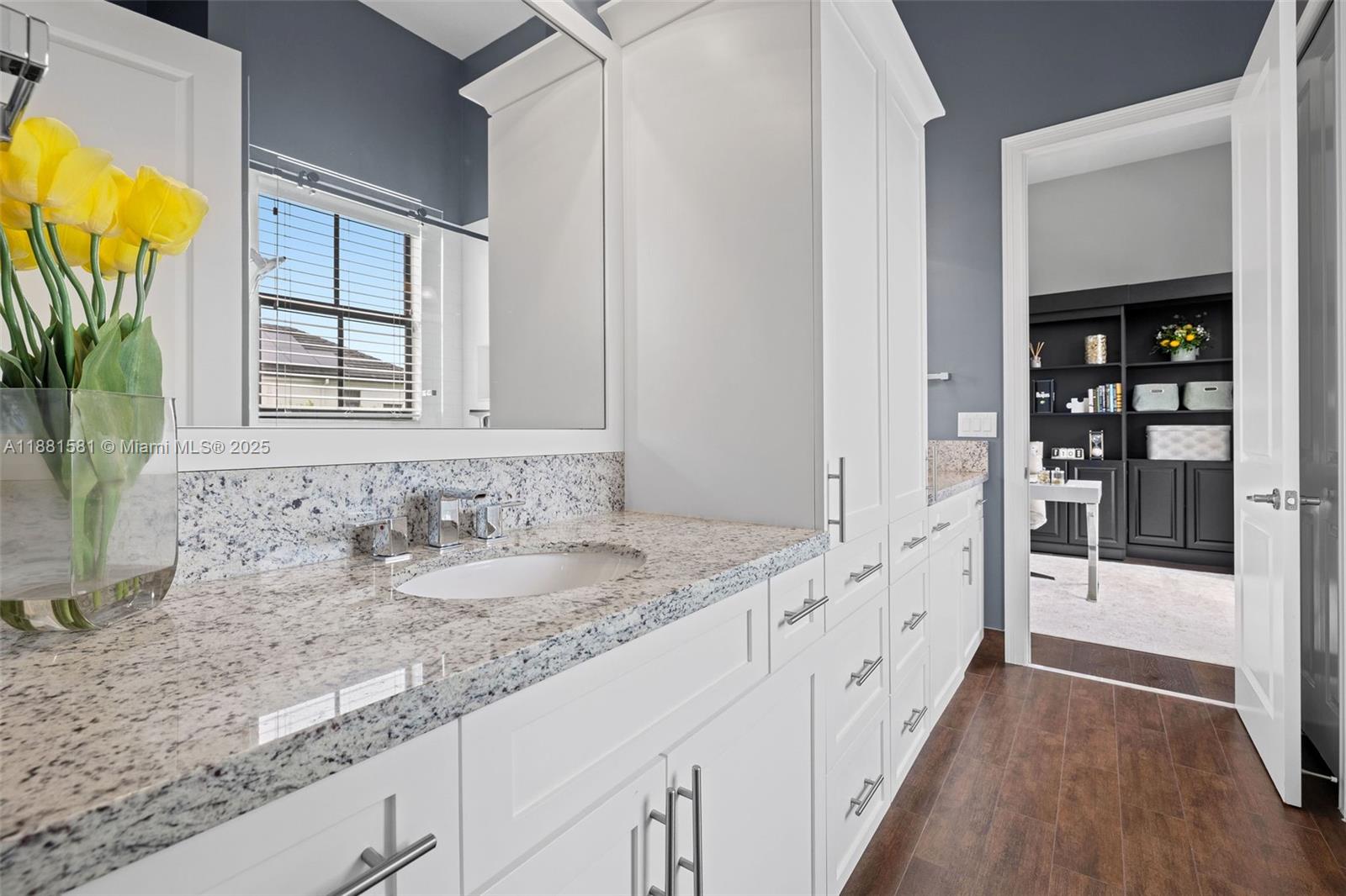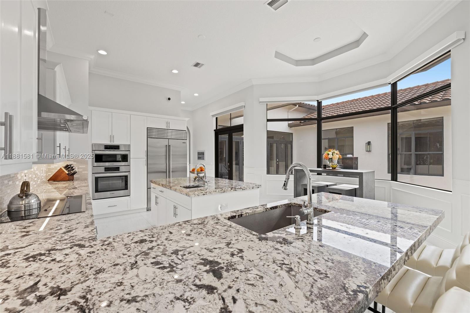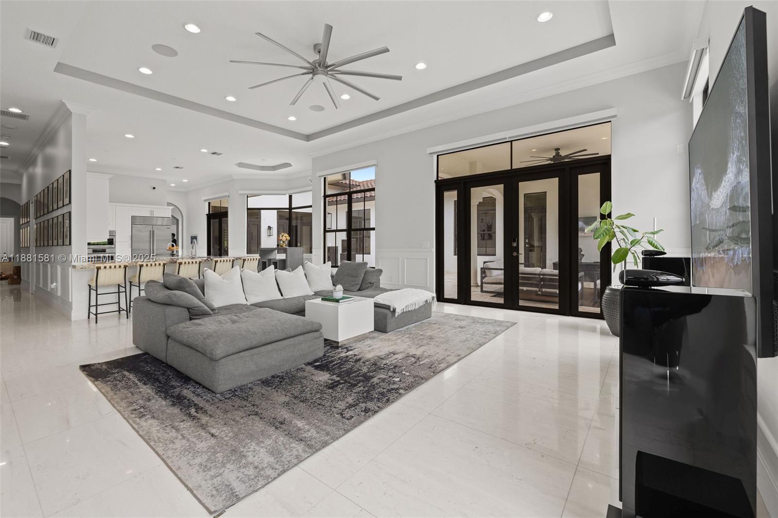 Contemporary Mediterranean estate in gated Camelot Estates, an Enclave of only 19 homes. Set on a builder's acre, this single-story residence centers around a private courtyard with custom water feature, covered lanai, and 2021 beach-entry pool & spa. Interiors feature 12-16 ft ceilings, 36x36 marble floors, crown moldings, and wide-plank hardwood in the primary suite and flex room. Chef's kitchen with SubZero refrigeration, Bosch appliances, granite counters, and reverse osmosis filtration. Oversized primary suite with seating area and spa bath with dual marble sinks, soaking tub, and walk-in shower. Additional highlights include 5-ensuite bedrooms + flex room, motorized window treatments, built-in speakers, 2 AC units (2022), 3-car garage, impact glass, & newer water heater (2024).