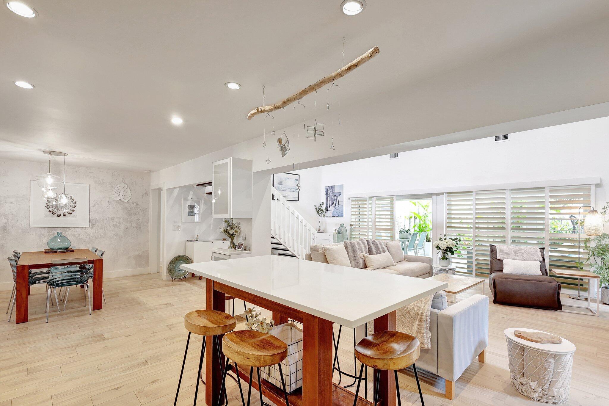 Discover the gated seaside community of Xanadu by the Sea. This move-in ready single-family home offers 3 bedrooms, 2 baths, a bonus loft, and a 2-car garage. The open-concept design showcases soaring cypress-clad ceilings, plantation shutters, and wood-look porcelain tile and laminate flooring. The bright kitchen features a center island, quartz countertops, and plenty of storage. The primary suite includes a newly renovated modern bath, while impact windows/doors and a 2023 aluminum metal roof provide peace of mind. Additional highlights include two newer tankless water heaters, high-efficiency AC, and lush tropical landscaping. Relax on the shaded patio with cedar ceiling or stroll via the private walkway to Carlin Park, beaches, jogging trails, tennis, pickleball, and nearby dining.
