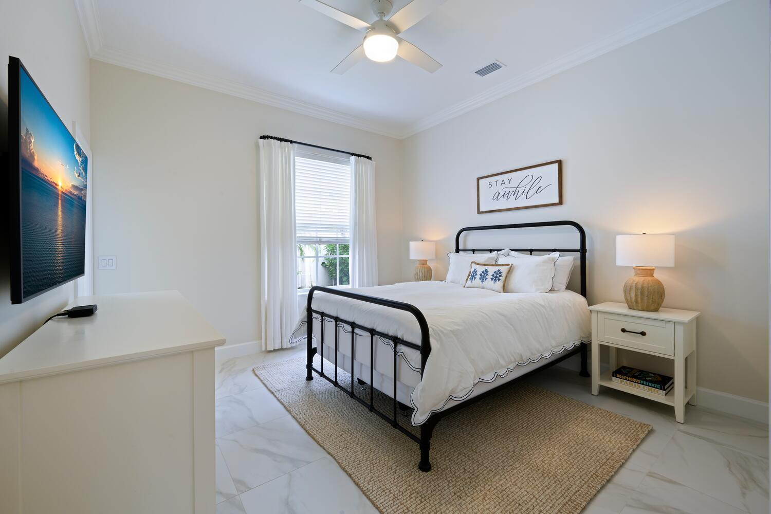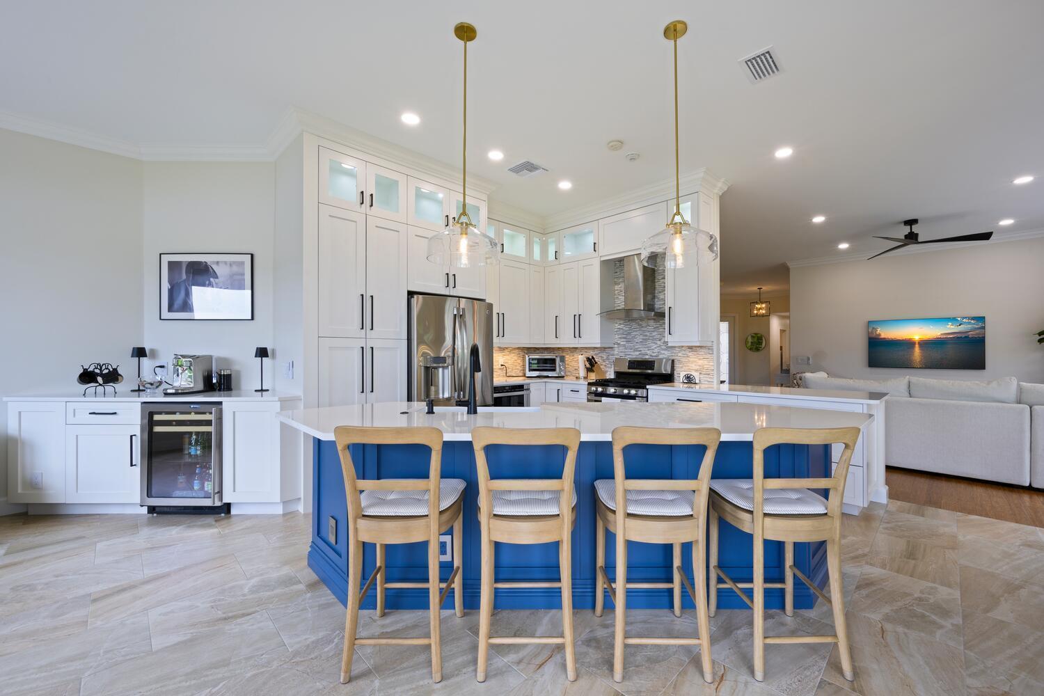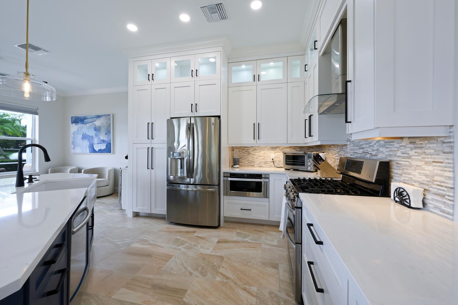 STUNNING 3-BED, 3-BATH HOME, meticulously renovated from top to bottom. Enjoy breathtaking water views from nearly every room. Features include gleaming bamboo floors, a state-of-the-art kitchen with high-end stainless steel appliances, quartz countertops, a farmhouse sink, and a stylish built-in bar. Spa-inspired bathrooms, elegant crown molding throughout, and impact-resistant windows add sophistication and security. Relax on the expansive screened porch overlooking a serene lake and the prestigious PGA National Clubhouse. Situated on an oversized, beautifully landscaped lot with ample space for a pool. Perfect for the most discerning buyer.