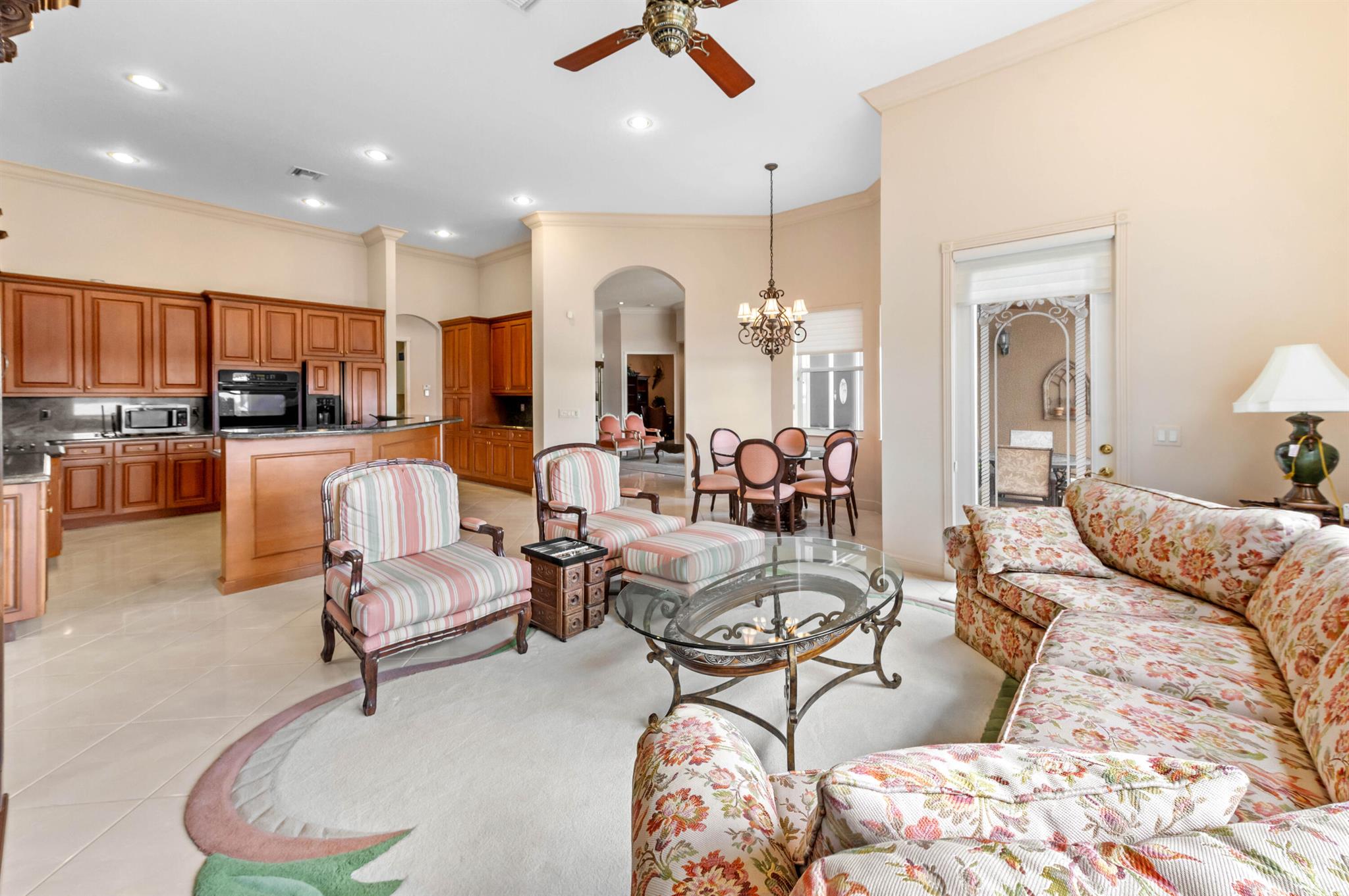Discover your private oasis in the exclusive, resort-style community of Bellaggio. This stunning one-story lakefront home is perfectly situated on the best lot in the community, surrounded by breathtaking water views on a quiet cul-de-sac. Offering 2,831 sq. ft. of living space, this residence features 4 bedrooms and 3 full bathrooms, providing plenty of room for both relaxation and entertaining.Step through impressive double entry doors into a welcoming foyer that sets the tone for the home's elegant design. The chef-inspired kitchen is both stylish and functional, boasting a cooktop, wall oven, microwave, refrigerator, granite countertops, a spacious island with bar seating, and abundant cabinetry. The open-concept living and dining areas flow seamlessly, enhanced by sliding glass doors