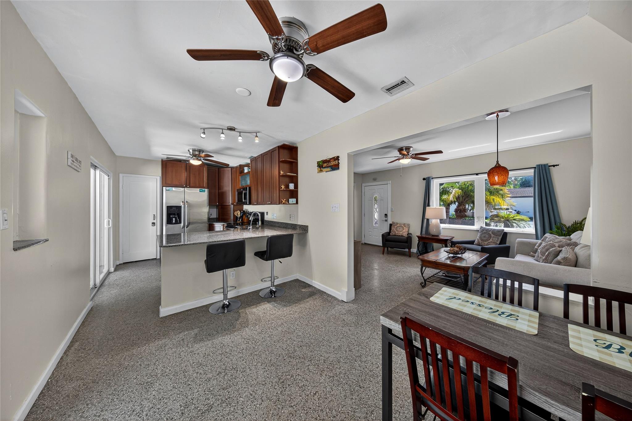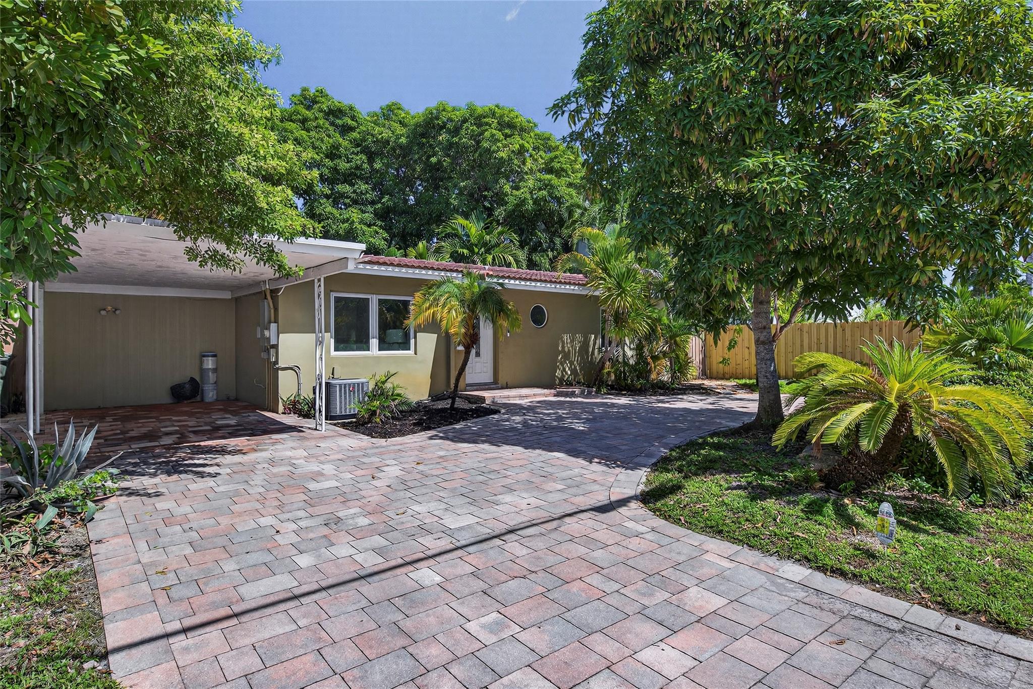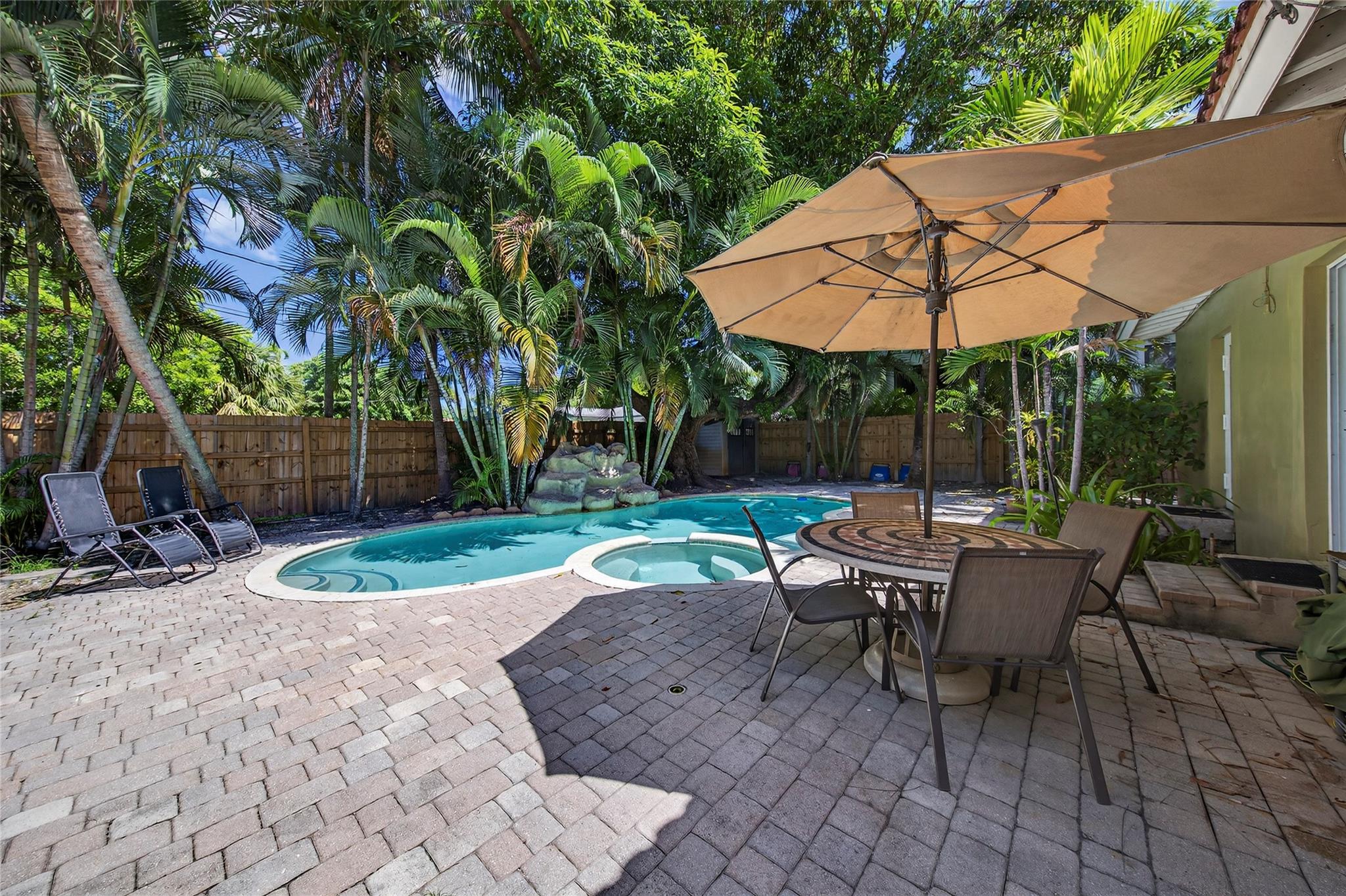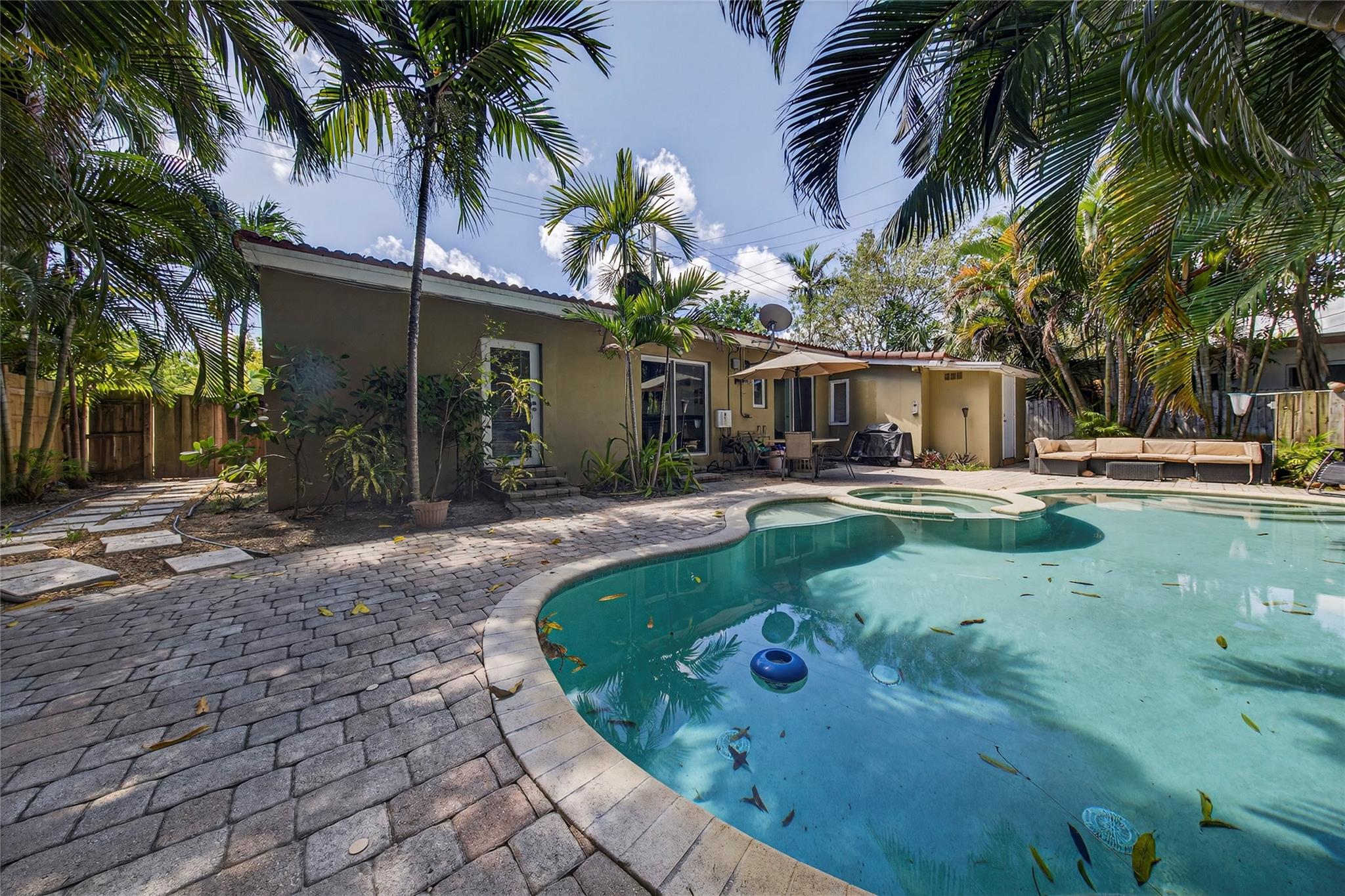 HIGHLY desired Poinsettia Heights neighborhood gem! Updated kitchen with granite counters, large pantry and snack counter facing the beautiful pool area. Primary suite offers renovated bathroom with walk-in shower and walk-in closet split from the other two bedrooms. Nicely updated guest bathroom has a tub and shower combination and large linen closet. Extra closet in the hallway. VERY good condition terrazo flooring throughout. Large heated pool with relaxing WATERFALL FEATURE and hot tub are in a VERY private backyard. Home offers a ton of natural light, a carport and a nice circular driveway made out of pavers. Ideal for a primary home, second home or short term rentals! No HOA. Close to the beach, downtown and 15 mins to the airport.