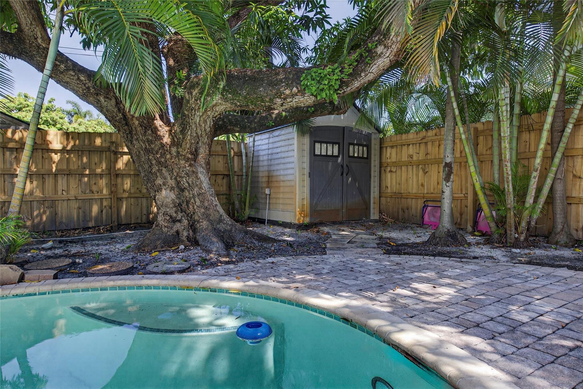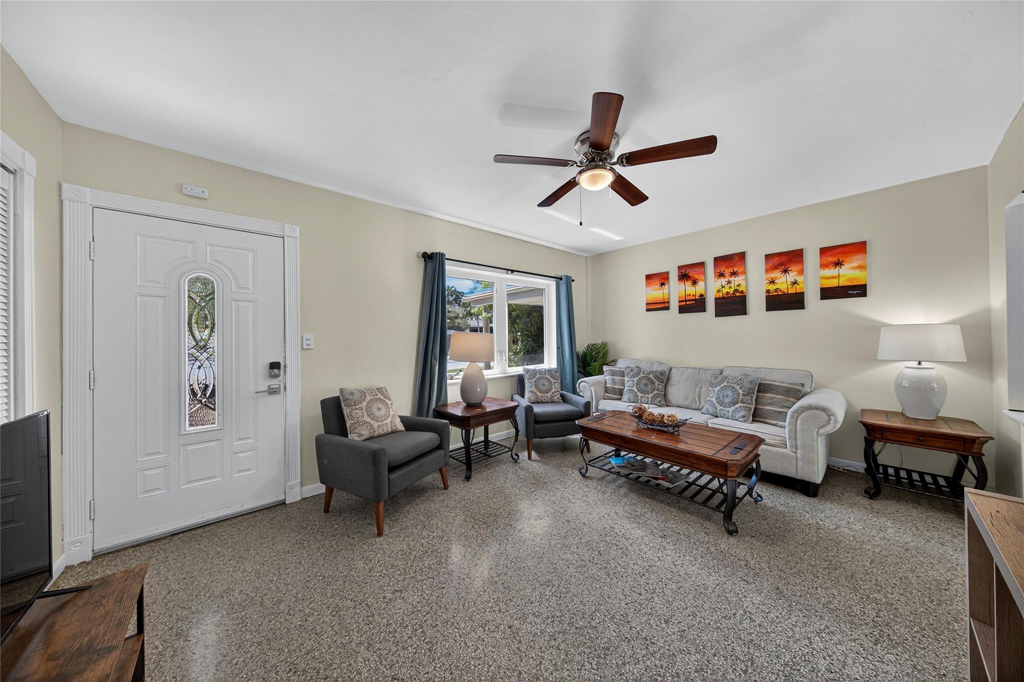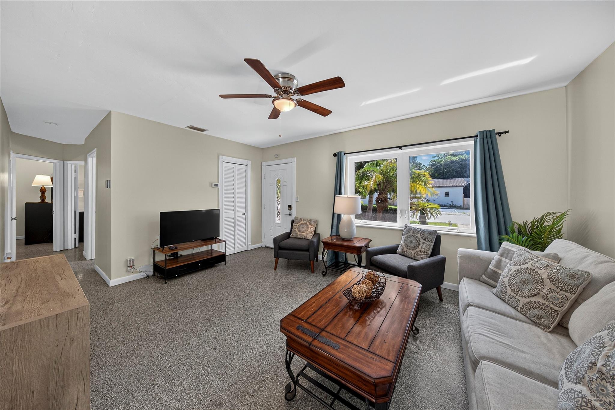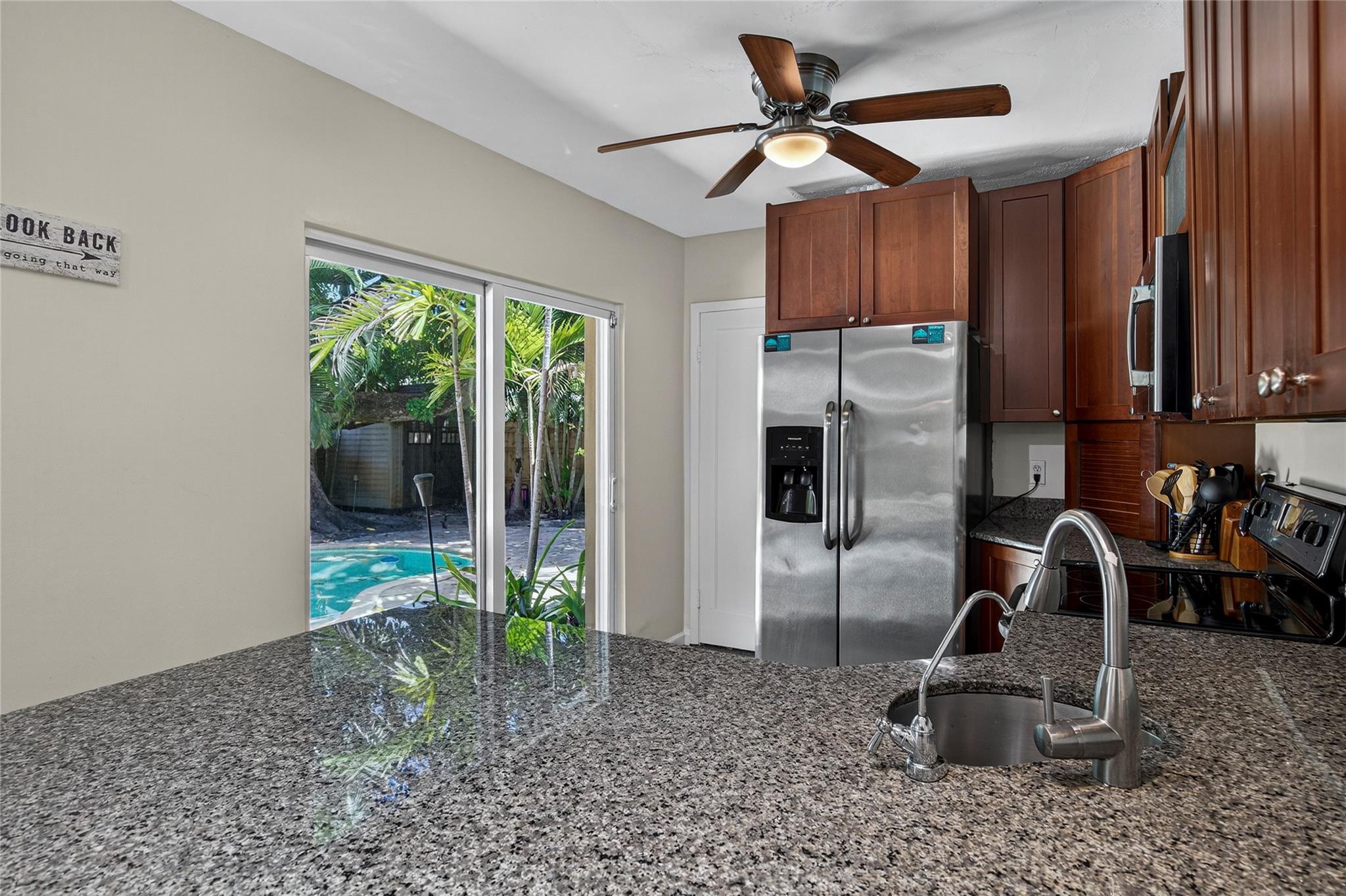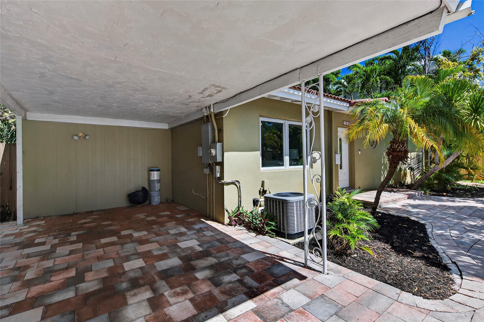 HIGHLY desired Poinsettia Heights neighborhood gem! Updated kitchen with granite counters, large pantry and snack counter facing the beautiful pool area. Primary suite offers renovated bathroom with walk-in shower and walk-in closet split from the other two bedrooms. Nicely updated guest bathroom has a tub and shower combination and large linen closet. Extra closet in the hallway. VERY good condition terrazo flooring throughout. Large heated pool with relaxing WATERFALL FEATURE and hot tub are in a VERY private backyard. Home offers a ton of natural light, a carport and a nice circular driveway made out of pavers. Ideal for a primary home, second home or short term rentals! No HOA. Close to the beach, downtown and 15 mins to the airport.