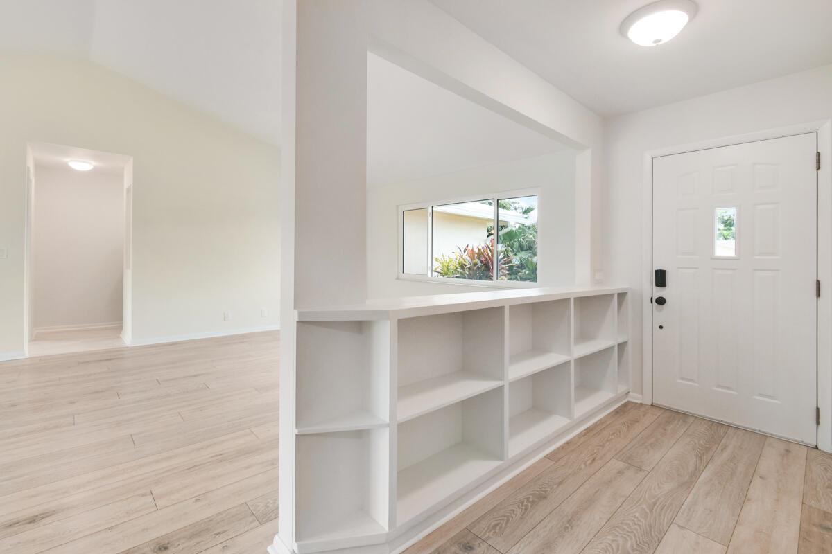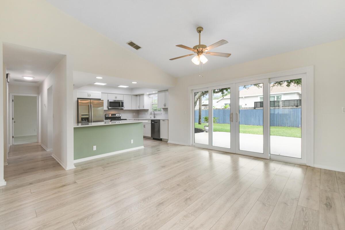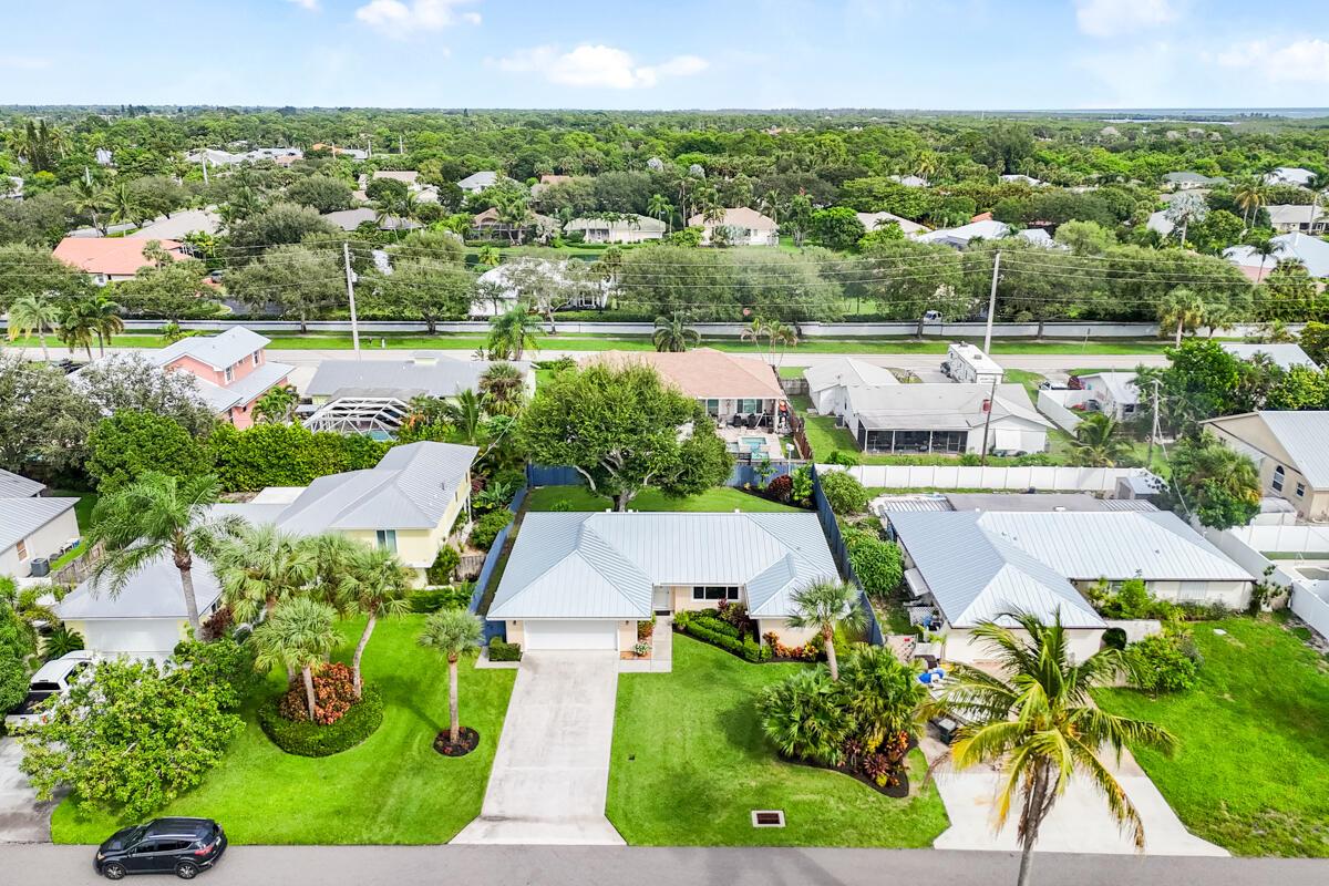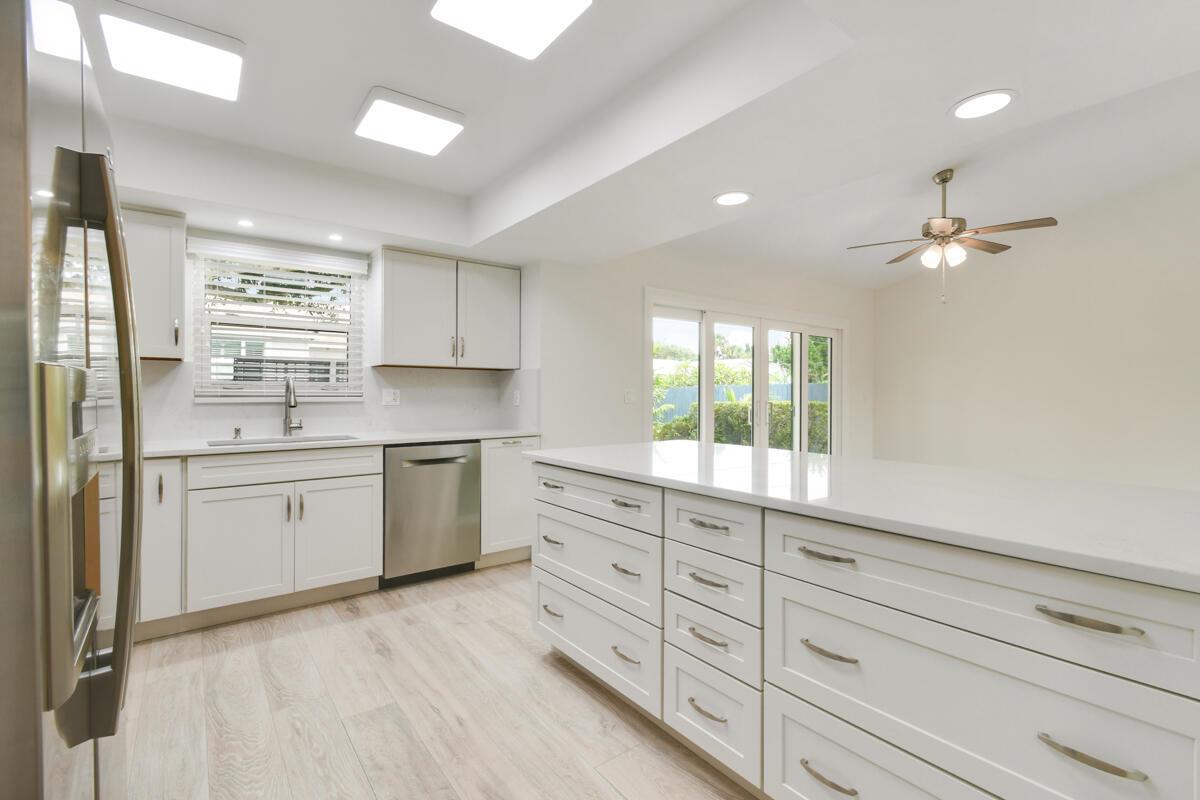 Completely Remodeled & Move-In Ready! This Light & Bright 3 bedroom, 2 bath home offers modern coastal living just 3.7 miles from Hobe Sound Beach and Downtown. Step inside through the covered entry to find an open floor plan filled with natural light, new light wood laminate flooring, and a spacious living/dining area that flows seamlessly to the outdoors. The fully remodeled kitchen boasts Quartz countertops and backsplash, Shaker-style cabinetry, stainless steel appliances, and a large island with seating perfect for entertaining. Both bathrooms have been beautifully updated with wood vanities, tile flooring, and lighted fog-free mirrors. Enjoy indoor-outdoor living with impact sliding glass doors leading to a private, fenced backyard with tropical landscaping and generous patio
