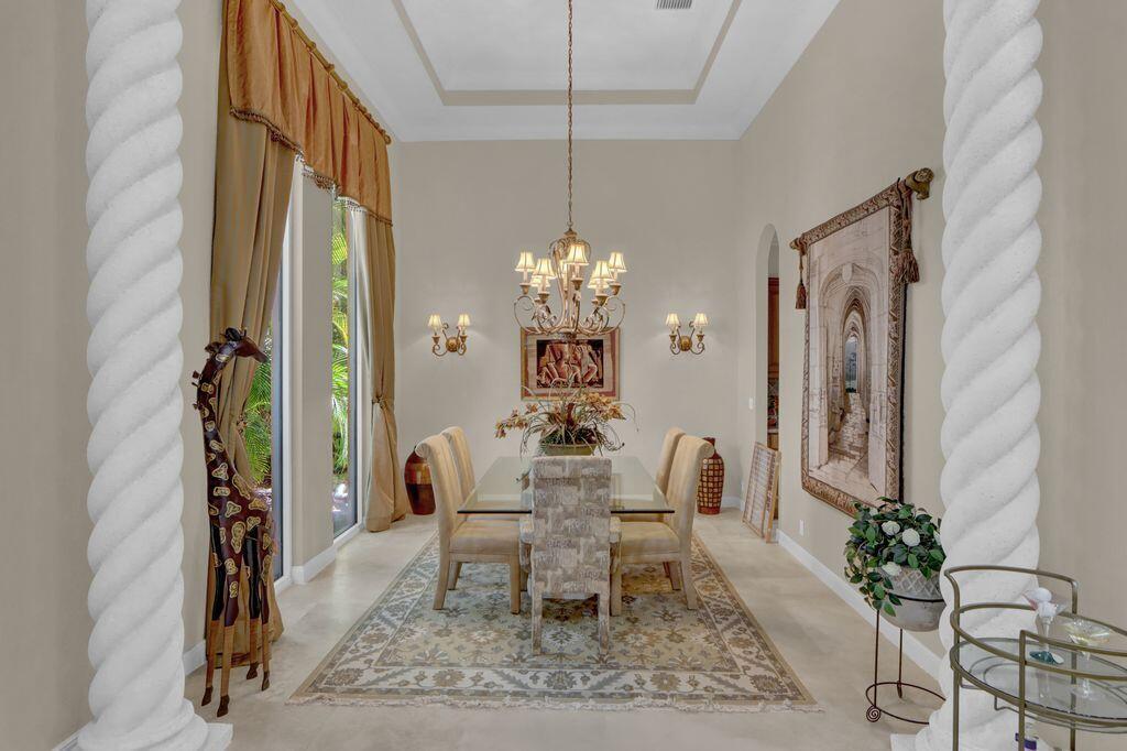 GOLF MEMBERSHIP AVAILABLE & CAN CLOSE BY OCT 31! Don't miss this opportunity for a GOLF MEMBERSHIP DAY 1 before the increase in initiation & transferability. This charming one-story courtyard of 3 bedrooms + office, 31/2 baths & 3-car garage is elegant & tastefully appointed featuring volume ceilings with crown moldings; Saturnia marble floors & neutral carpet; an inviting Living Room with an electric fireplace & wet bar; Family Room entertainment center; built-in office in Bedroom 4; solid core molded doors; custom window drapes & shades.The kitchen features maple cabinetry, granite counters,tumbled marble backsplash,butler's pantry and charming breakfast nook. Roof-2022; water heater-2023; pool resurfaced & tiles-2023; circular driveway;epoxy garage floor; accordion hurricane shutters.