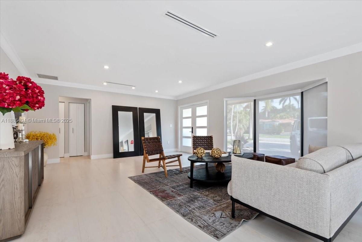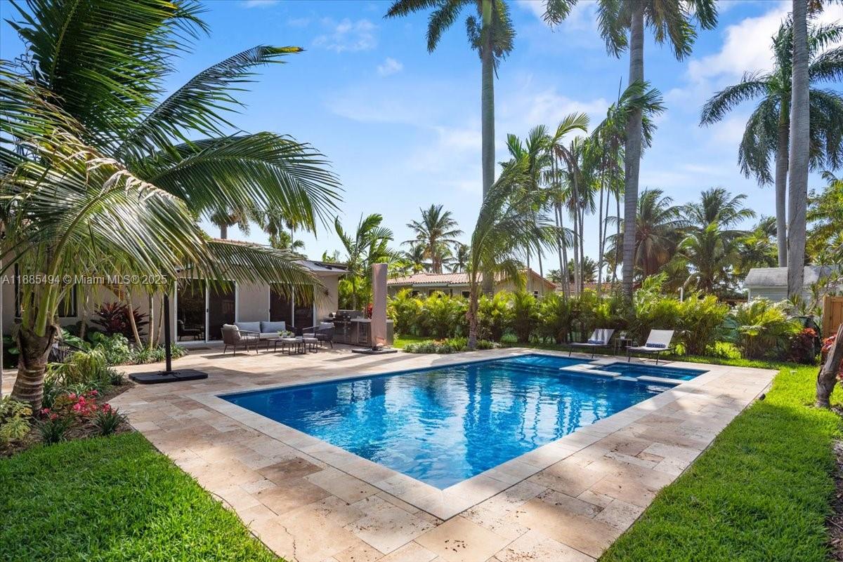 Framed by breathtaking, professionally designed landscaping, this 2,700 sq ft custom residence in the highly desirable Hollywood Lakes neighborhood is truly one of a kind. Rebuilt with designer-appointed finishes, it offers 4 bedrooms and 4 baths, highlighted by large-format porcelain floors and custom double frosted entry doors. The chef’s kitchen features wood cabinetry, quartz countertops, breakfast bar, and premium stainless appliances including a 5-burner gas range. The primary suite opens to a heated pool with spa, travertine deck, and full outdoor kitchen for seamless entertaining. With oversized mechanical systems, a Florida room, and every detail carefully curated, this home is both elegant and inviting.
