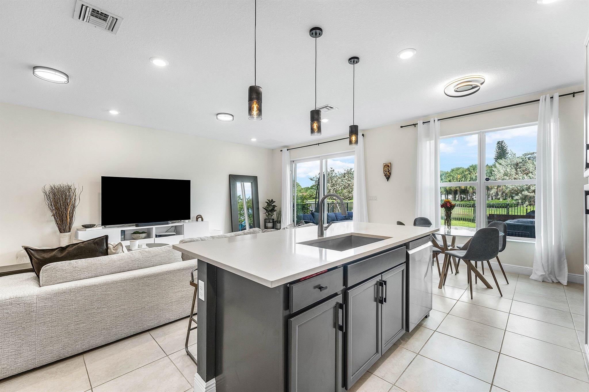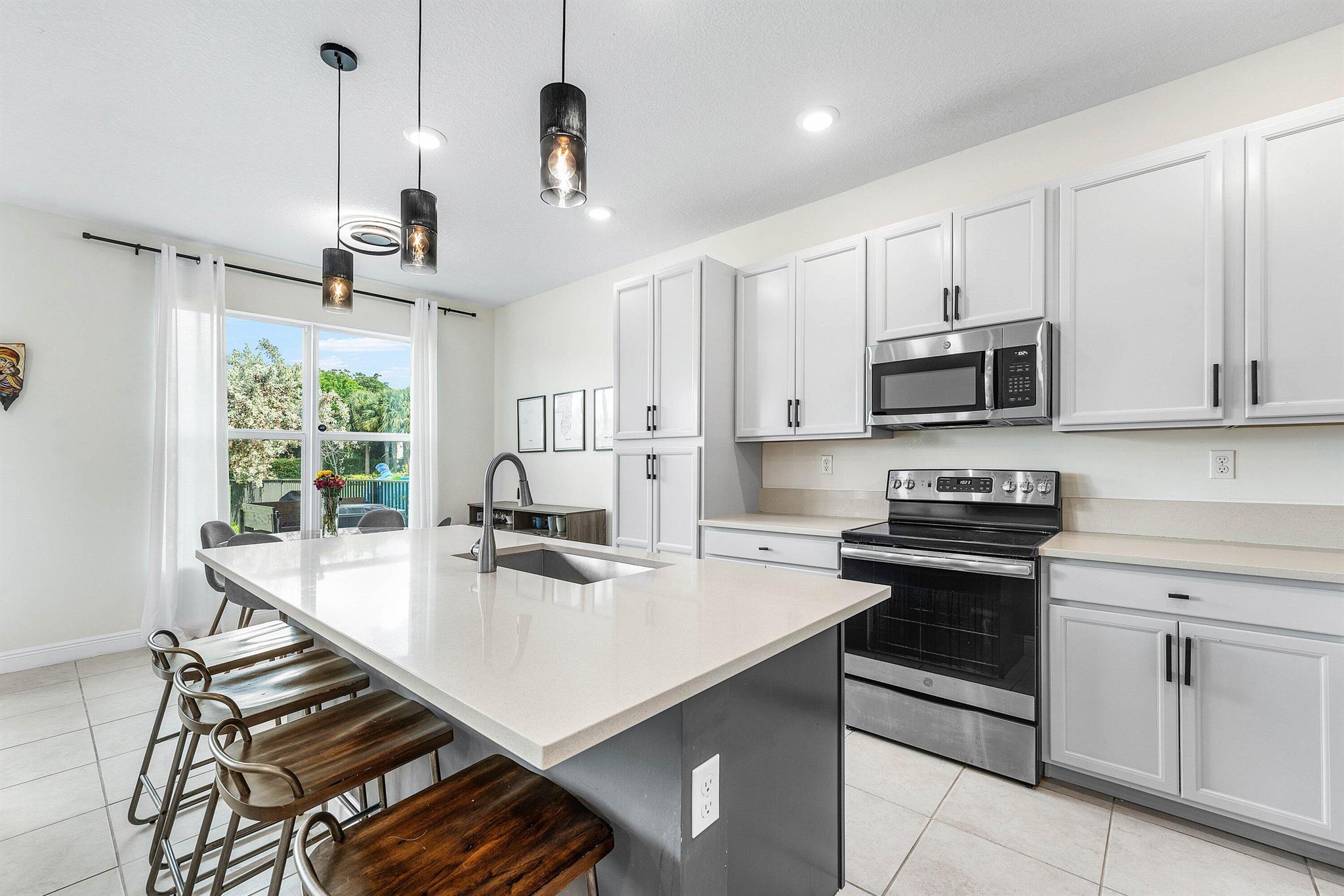 Enjoy stunning lake views from this modern townhouse, built in 2020 by Lennar. Featuring 3 bedrooms and 2.5 bathrooms, this home is designed with style and functionality in mind. The kitchen boasts quartz countertops, soft-close cabinetry, a new dishwasher, and a spacious island with seating--perfect for entertaining. The open-concept living area includes additional storage tucked behind the staircase.Upstairs, you'll find all bedrooms with new flooring along with a convenient laundry room featuring a new washer and dryer. Every window is protected with hurricane-impact glass for peace of mind.