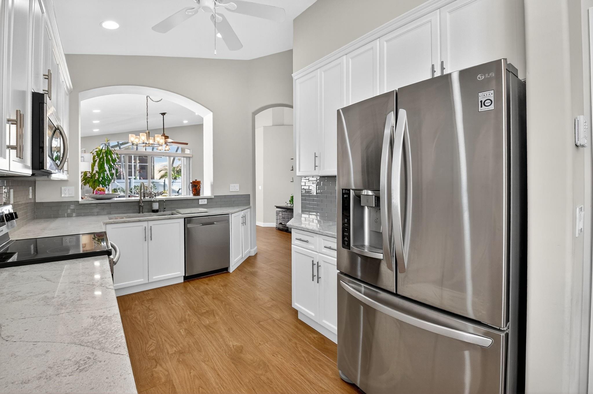 RARE UPDATED home in this price range! Major UPDATES include kitchen cabinets, quartz counter tops , wood-grain ceramic flooring, new vanities, frameless shower, garage storage, AC 2025, water, heater 2021, 2 walk-in closets, storm shutters. Vizcaya is pet friendly allowing 2 pets! Enjoy the expanded, screened/covered patio while entertaining. Cable, internet, exterior painting (Oct 2025), roof maintenance, and landscaping are included in the low monthly HOA fees of $485. Roads paved in 2023. At the clubhouse, you'll find pickleball, tennis, heated pool, bocce ball, card rooms, fitness center and more. This is a 55+ gated community on Atlantic Ave close to places of worship, shopping, theater, nightlife, and easy access to the FL Turnpike and I95!