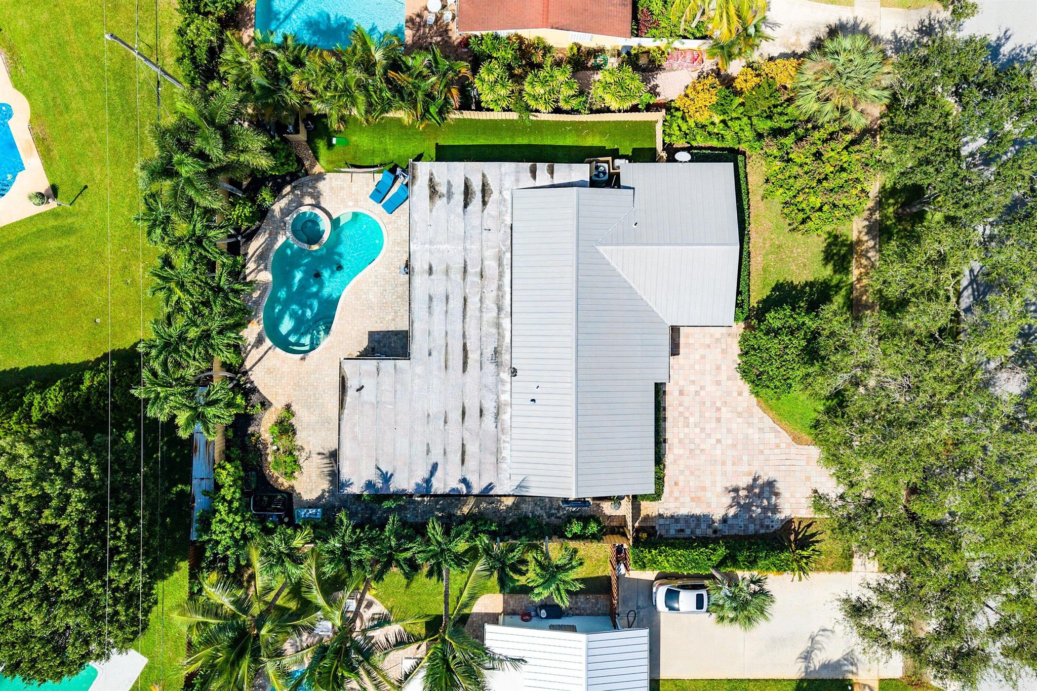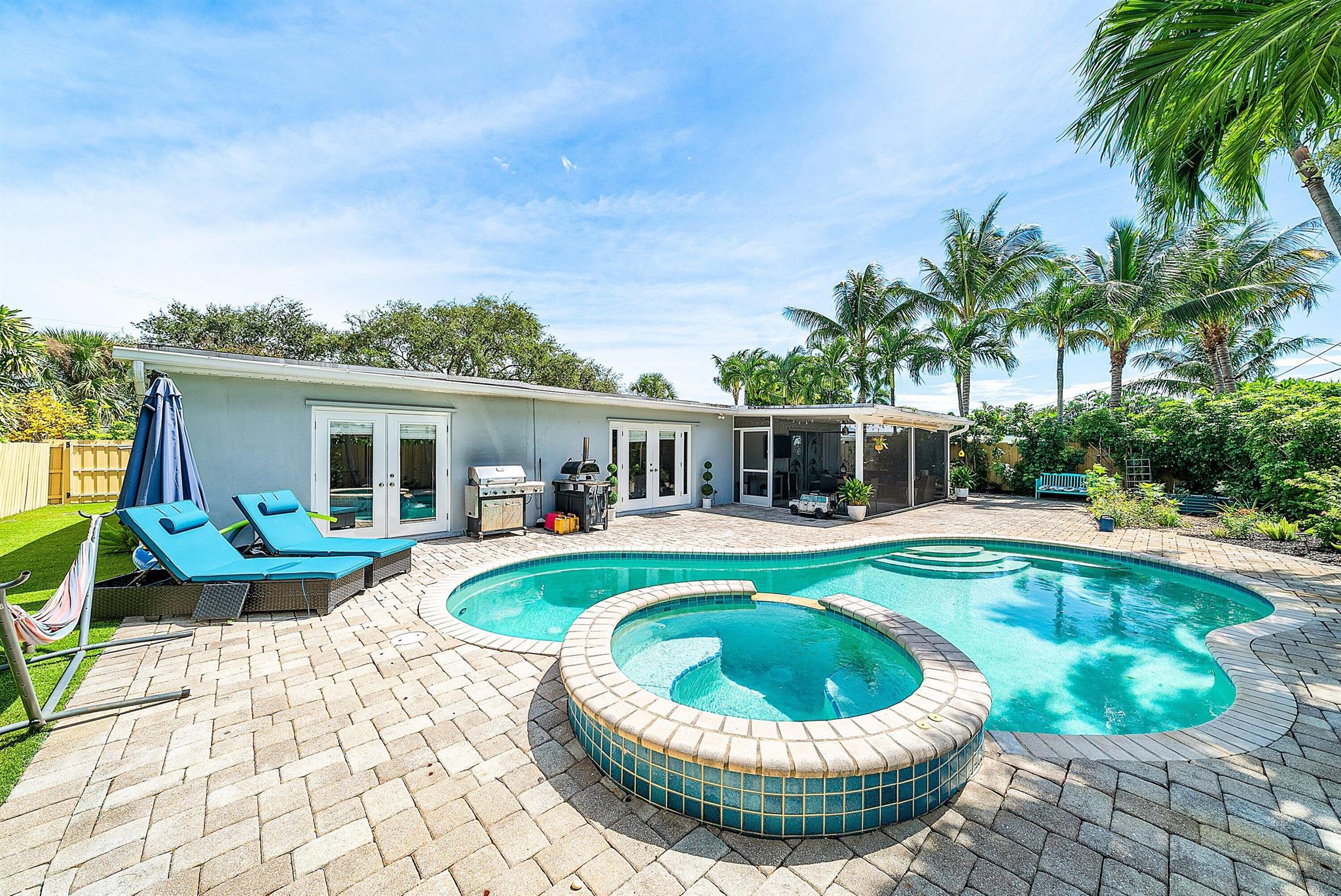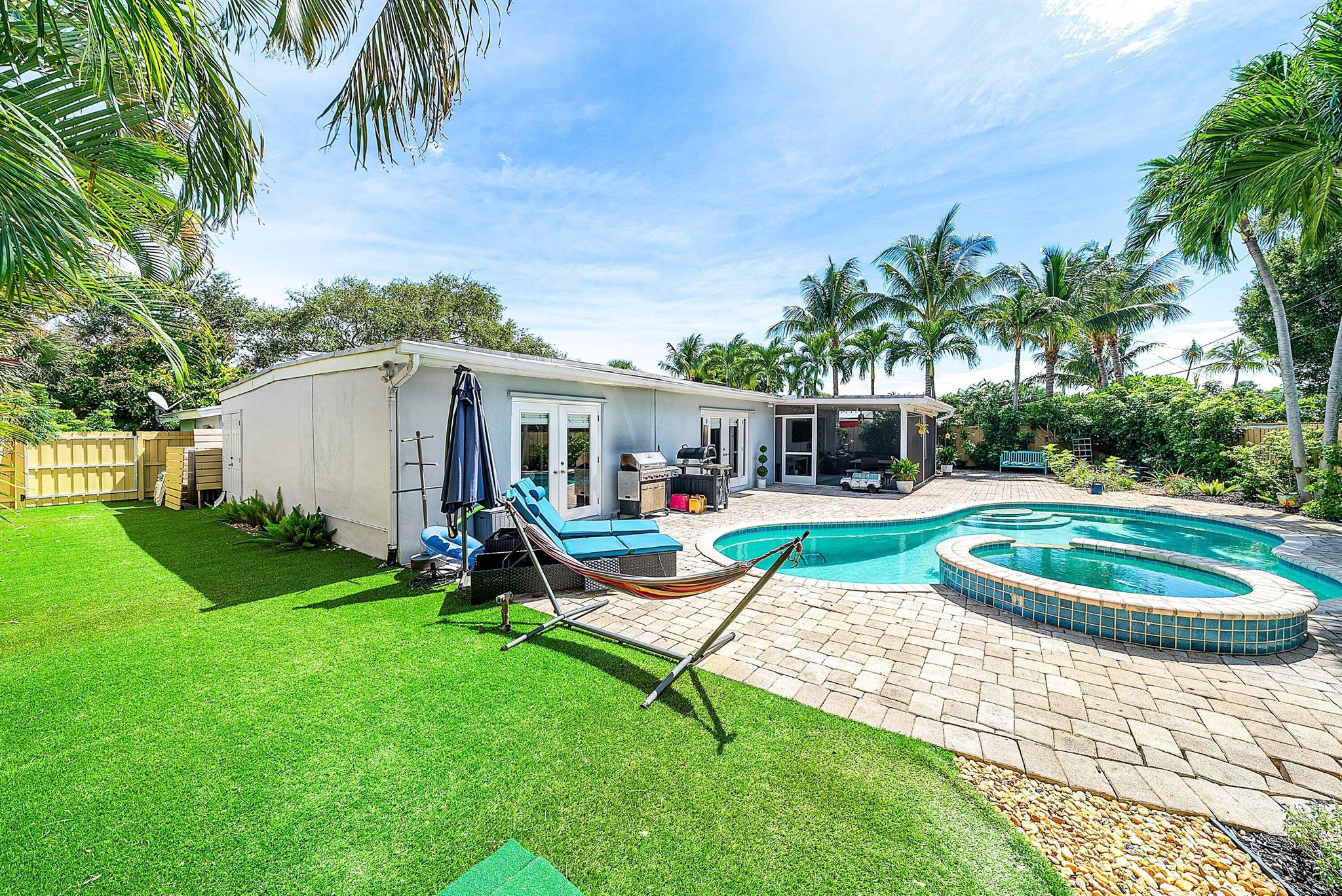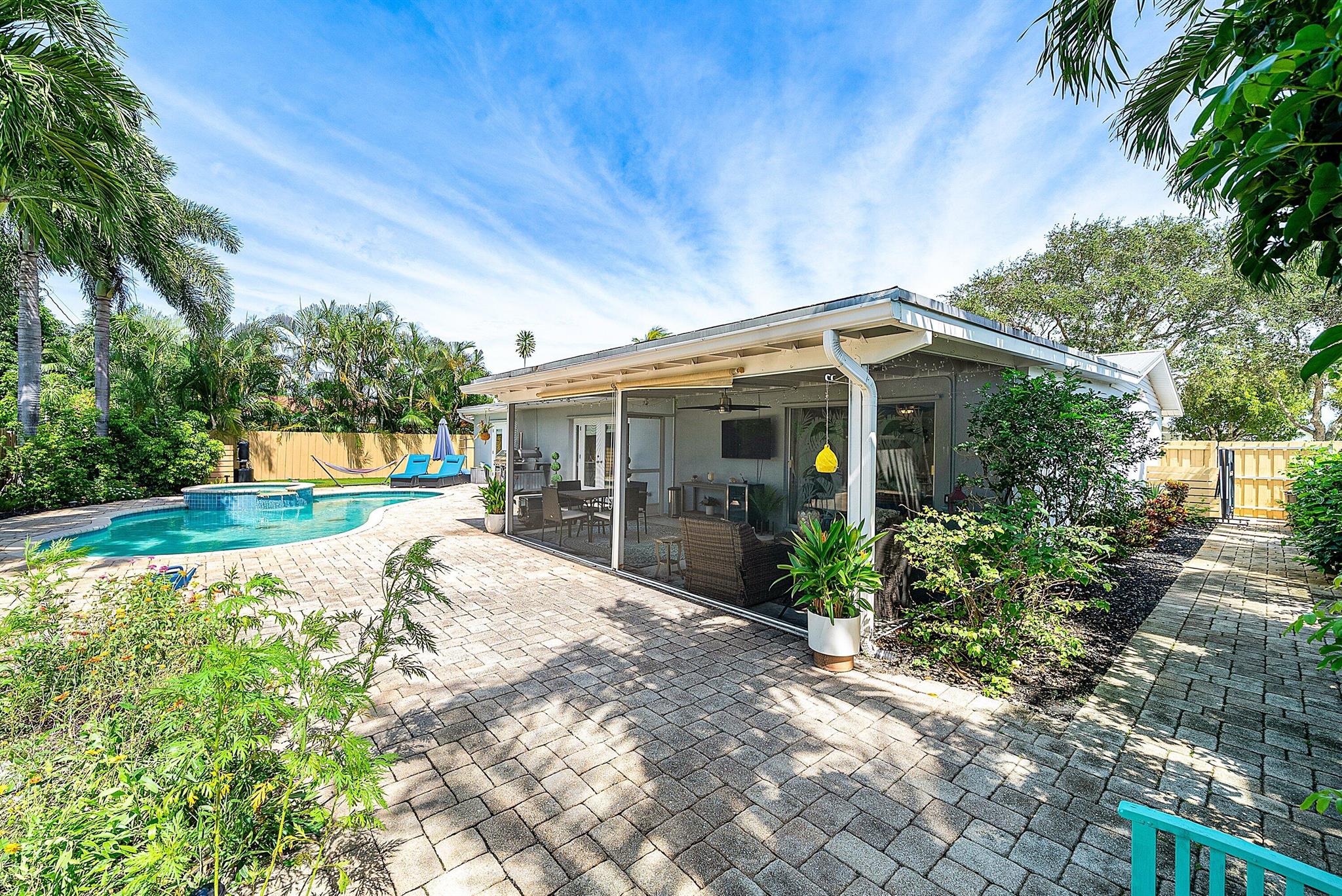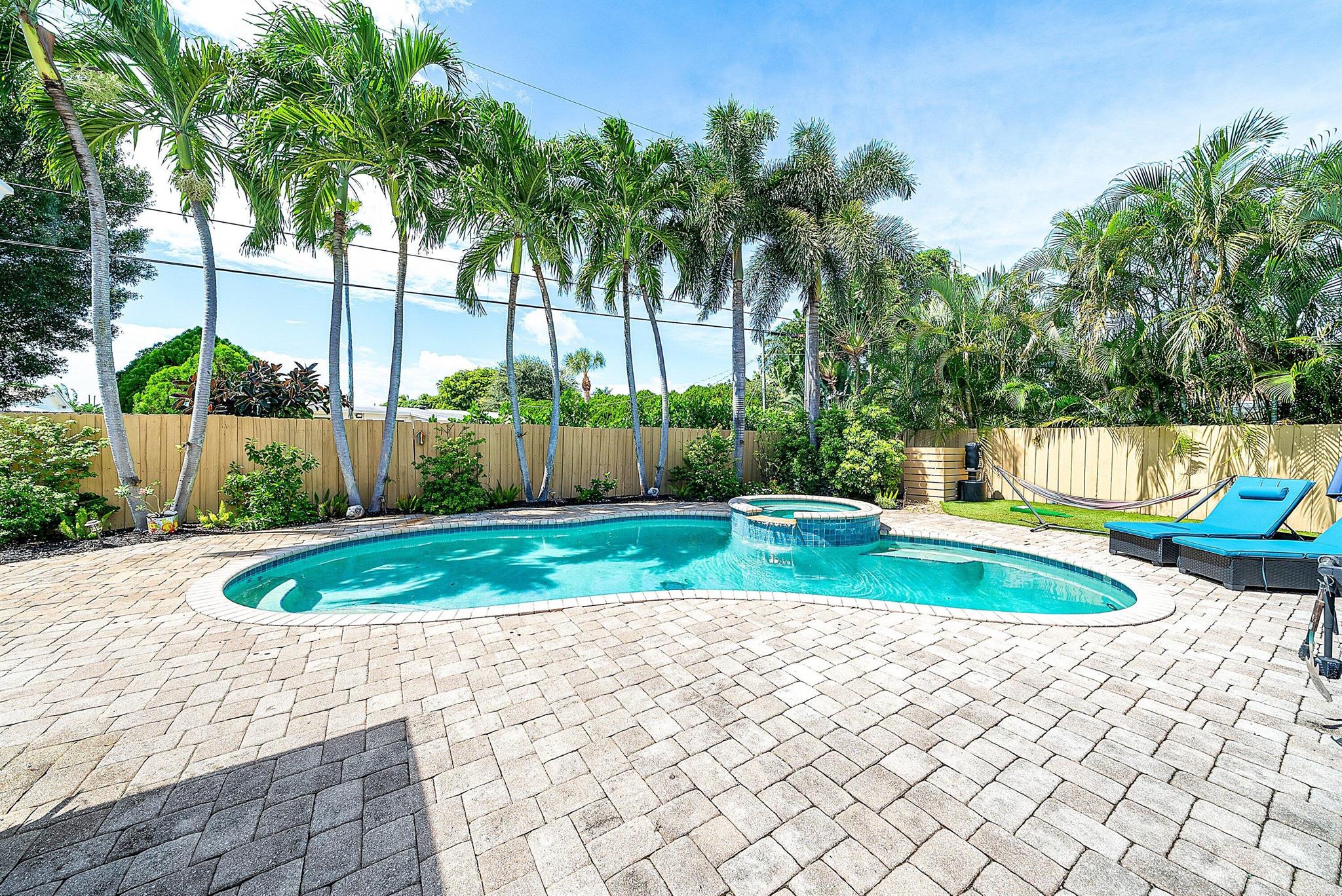 Coastal living in the Village of North Palm Beach! This updated 4-bed, 2-bath single-story home offers an easy indoor-outdoor lifestyle. A wide paver drive and shady oak canopy welcome you to a bright, open living area that flows to a private tropical backyard. Enjoy a free-form pool + raised spa, expansive paver patio, and lush palms--perfect for relaxing or entertaining. The light exterior palette, metal-look roofline, and blue shutters give timeless curb appeal, while a fenced yard keeps pets and play secure. Inside, large windows bring in natural light; a split-bedroom layout provides flexibility for guests or a home office. Home has a wonderful floorplan with 2 living spaces, dining area, and has additional storage/workshop area accesible from the exterior. One-car garage plus