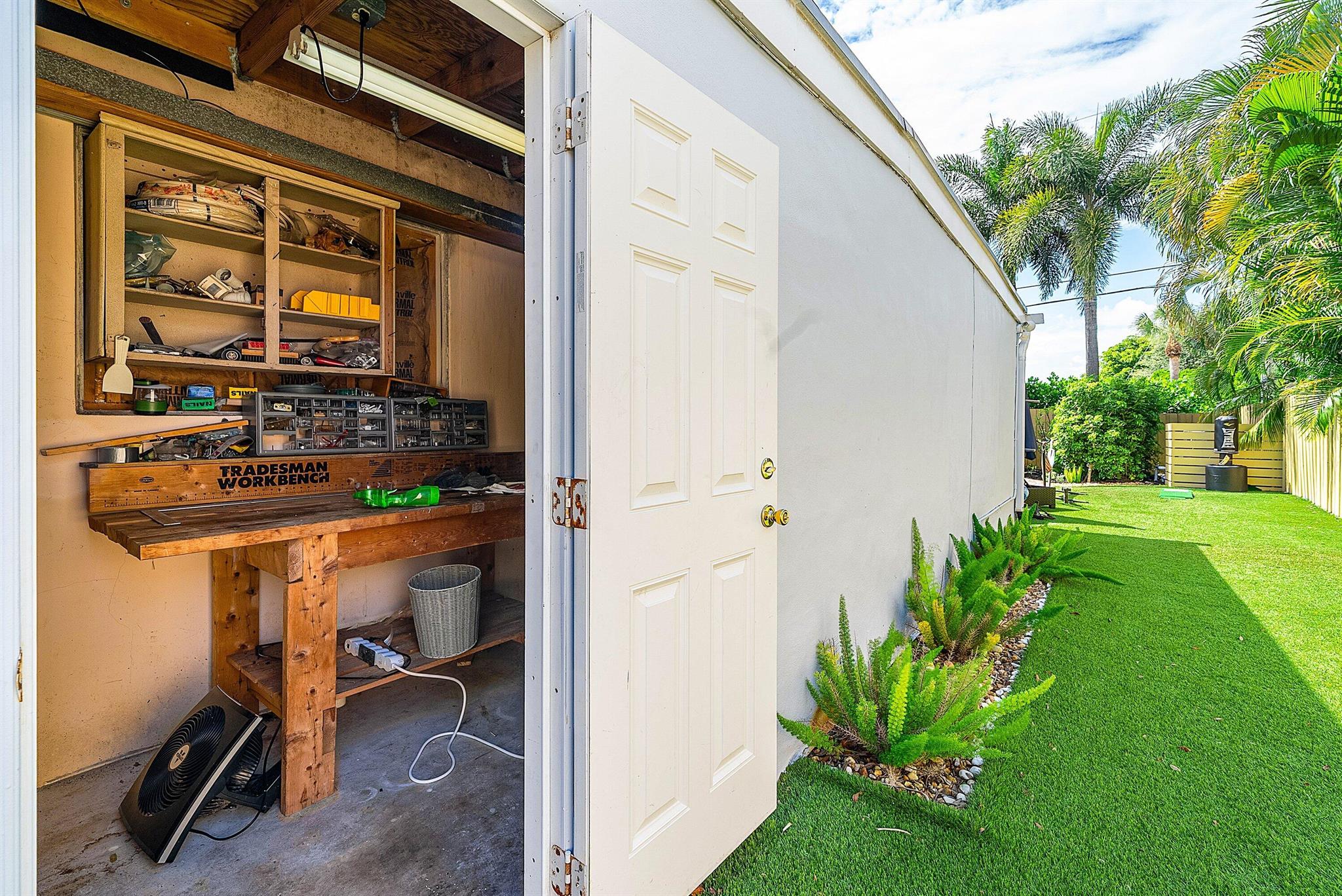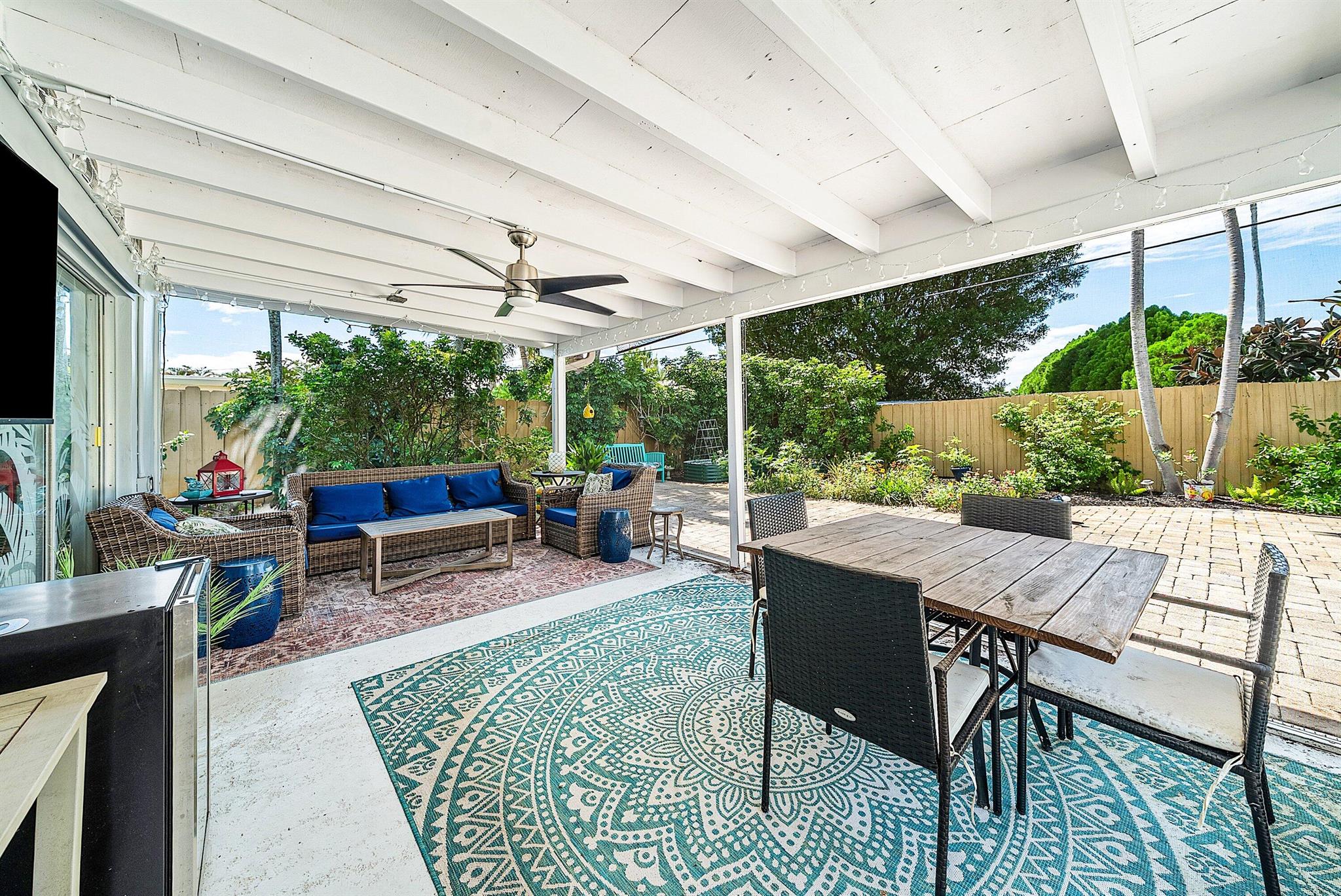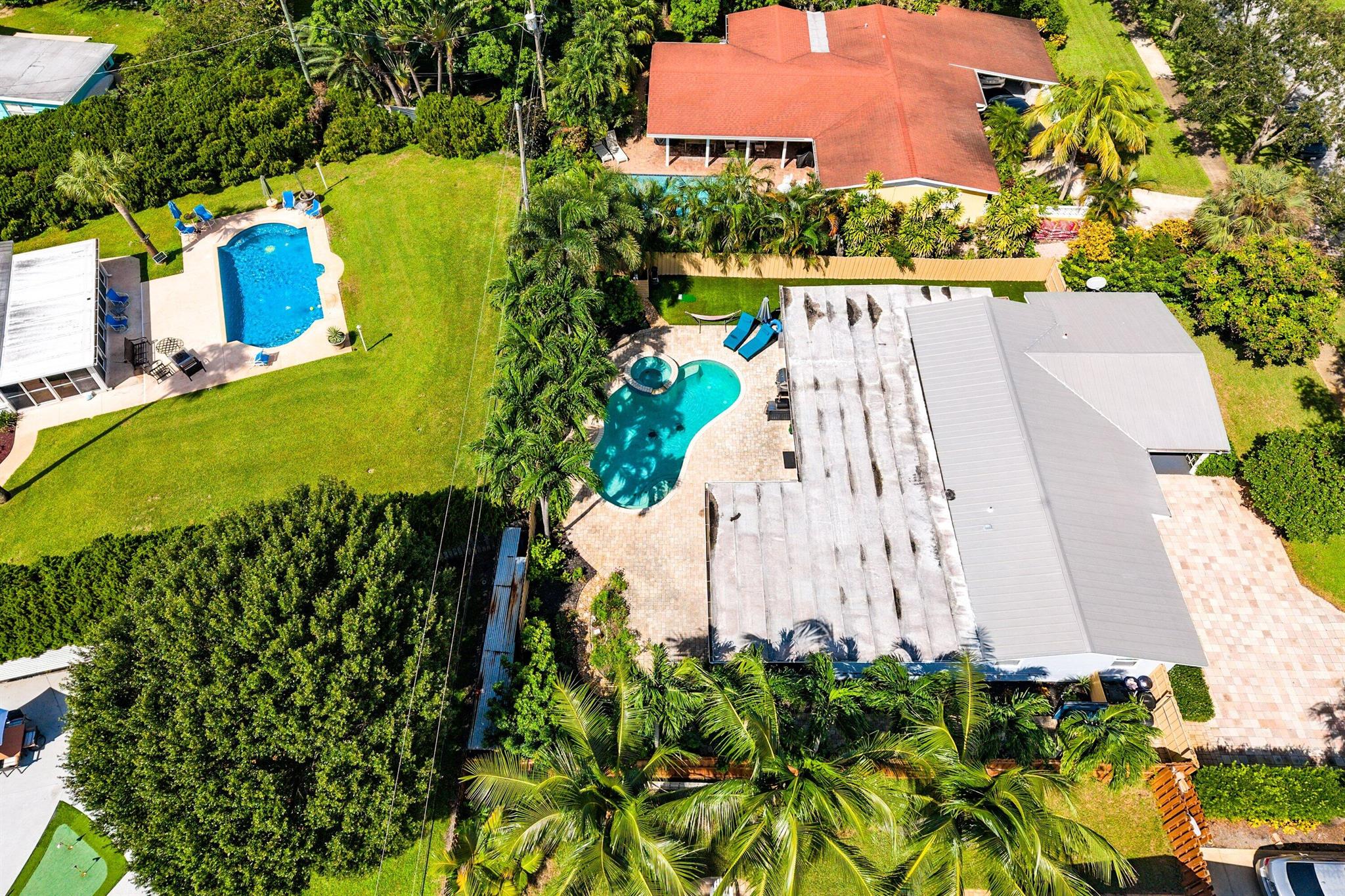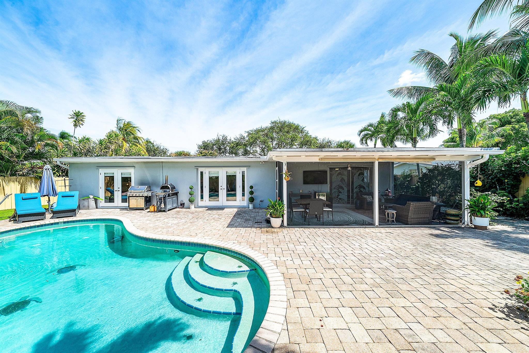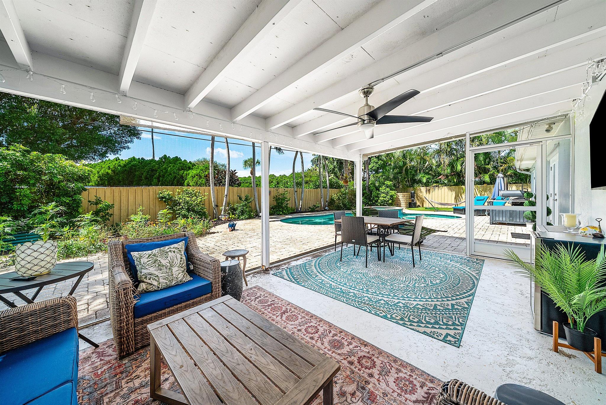 Coastal living in the Village of North Palm Beach! This updated 4-bed, 2-bath single-story home offers an easy indoor-outdoor lifestyle. A wide paver drive and shady oak canopy welcome you to a bright, open living area that flows to a private tropical backyard. Enjoy a free-form pool + raised spa, expansive paver patio, and lush palms--perfect for relaxing or entertaining. The light exterior palette, metal-look roofline, and blue shutters give timeless curb appeal, while a fenced yard keeps pets and play secure. Inside, large windows bring in natural light; a split-bedroom layout provides flexibility for guests or a home office. Home has a wonderful floorplan with 2 living spaces, dining area, and has additional storage/workshop area accesible from the exterior. One-car garage plus
