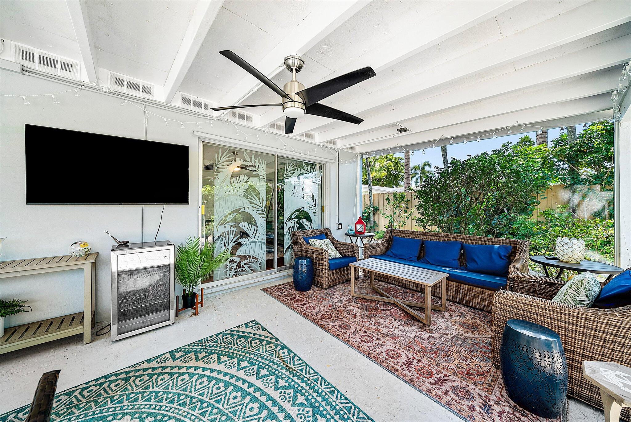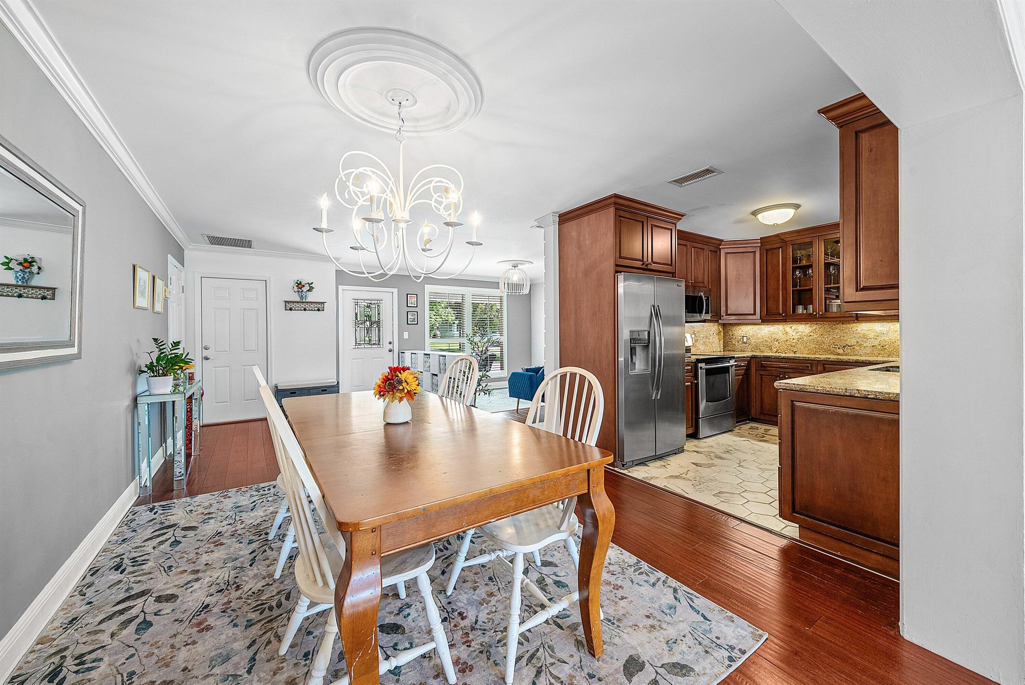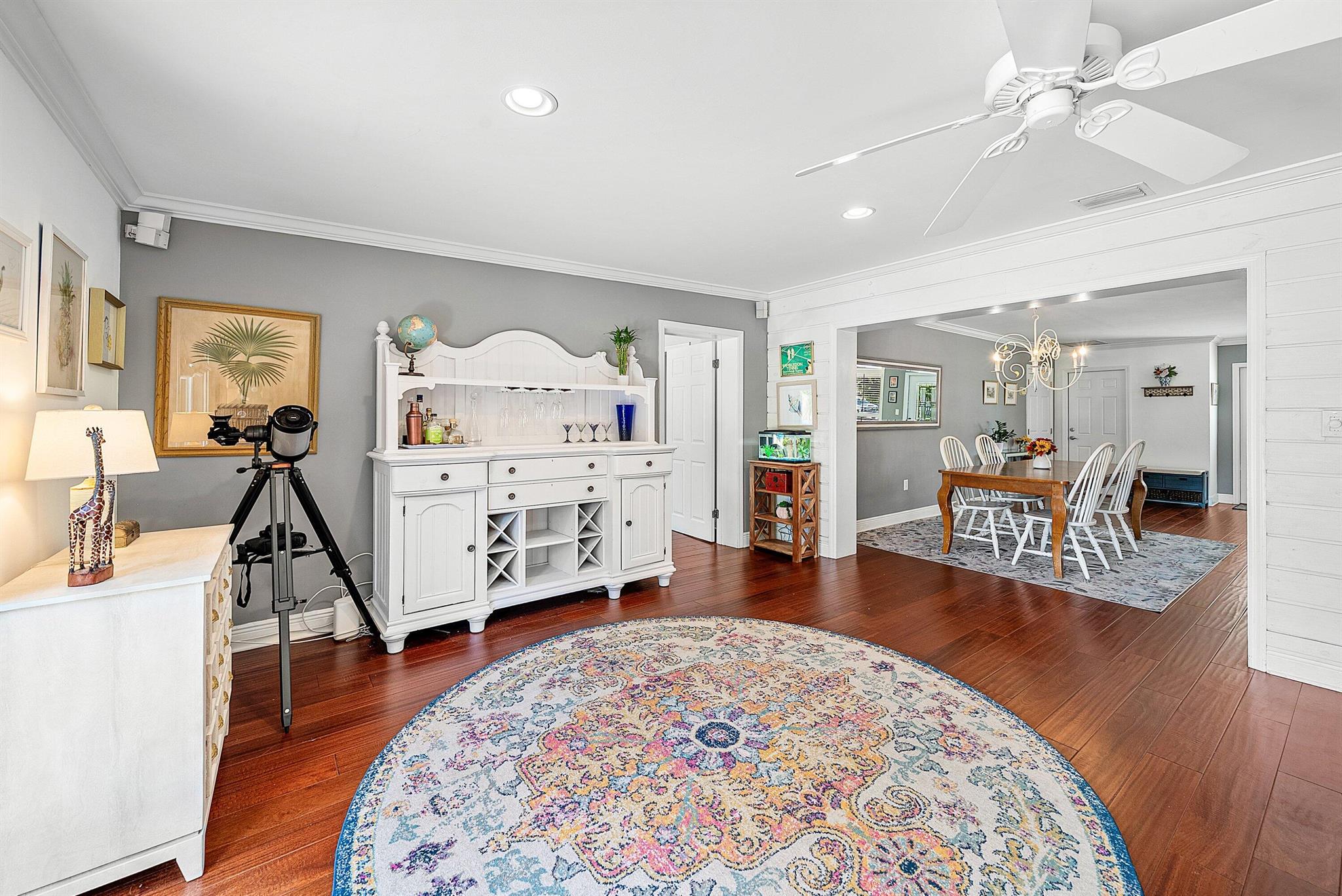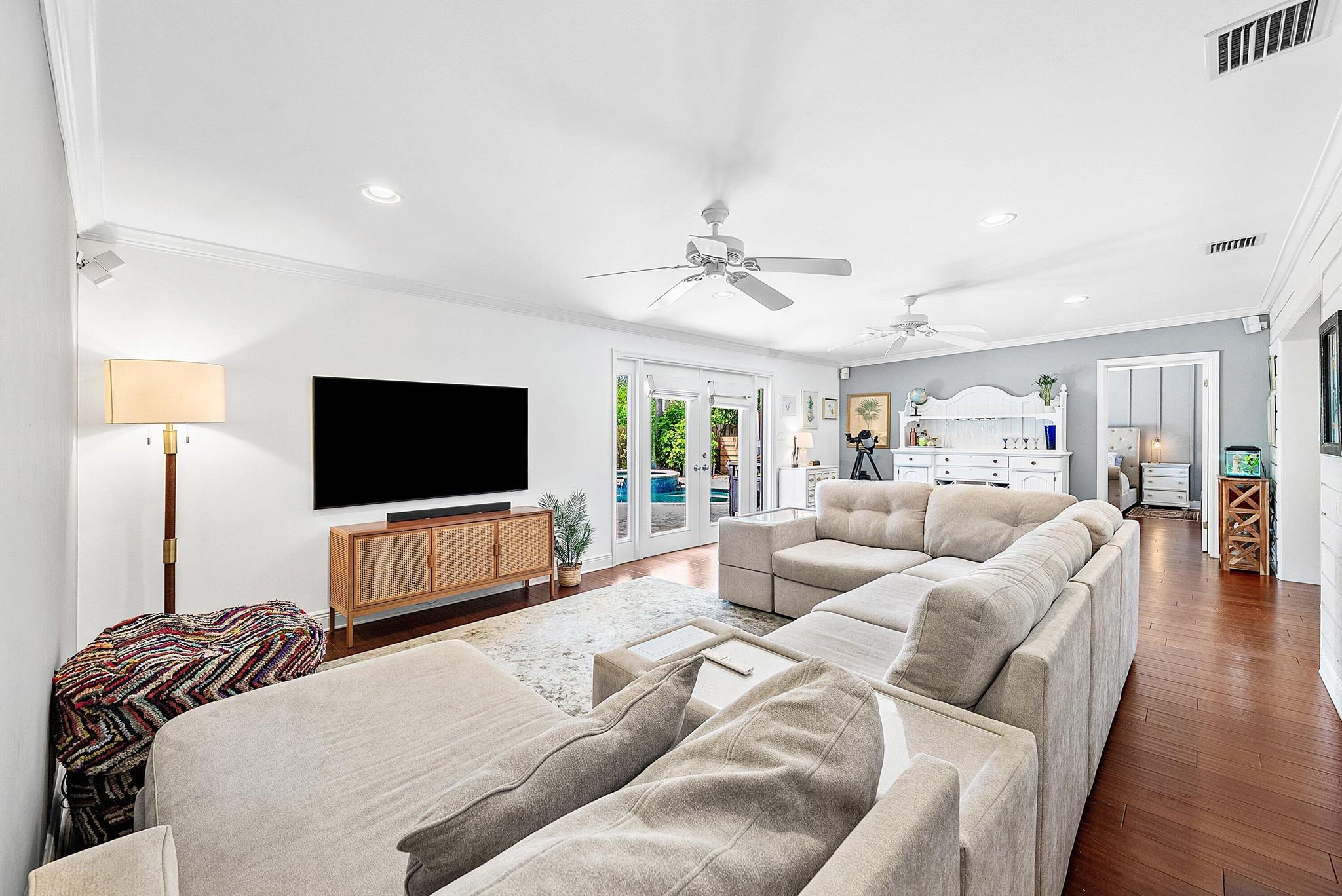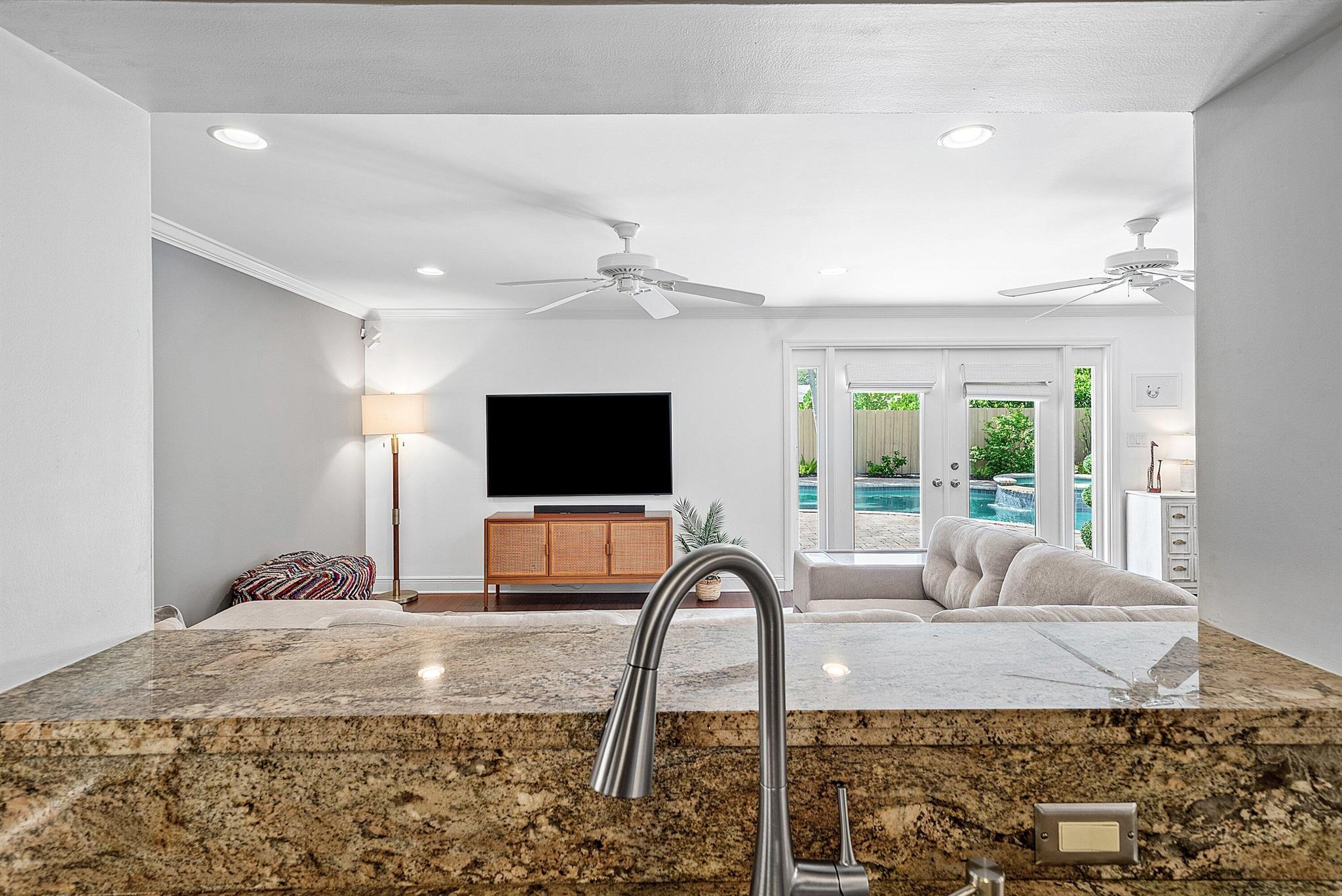 Coastal living in the Village of North Palm Beach! This updated 4-bed, 2-bath single-story home offers an easy indoor-outdoor lifestyle. A wide paver drive and shady oak canopy welcome you to a bright, open living area that flows to a private tropical backyard. Enjoy a free-form pool + raised spa, expansive paver patio, and lush palms--perfect for relaxing or entertaining. The light exterior palette, metal-look roofline, and blue shutters give timeless curb appeal, while a fenced yard keeps pets and play secure. Inside, large windows bring in natural light; a split-bedroom layout provides flexibility for guests or a home office. Home has a wonderful floorplan with 2 living spaces, dining area, and has additional storage/workshop area accesible from the exterior. One-car garage plus