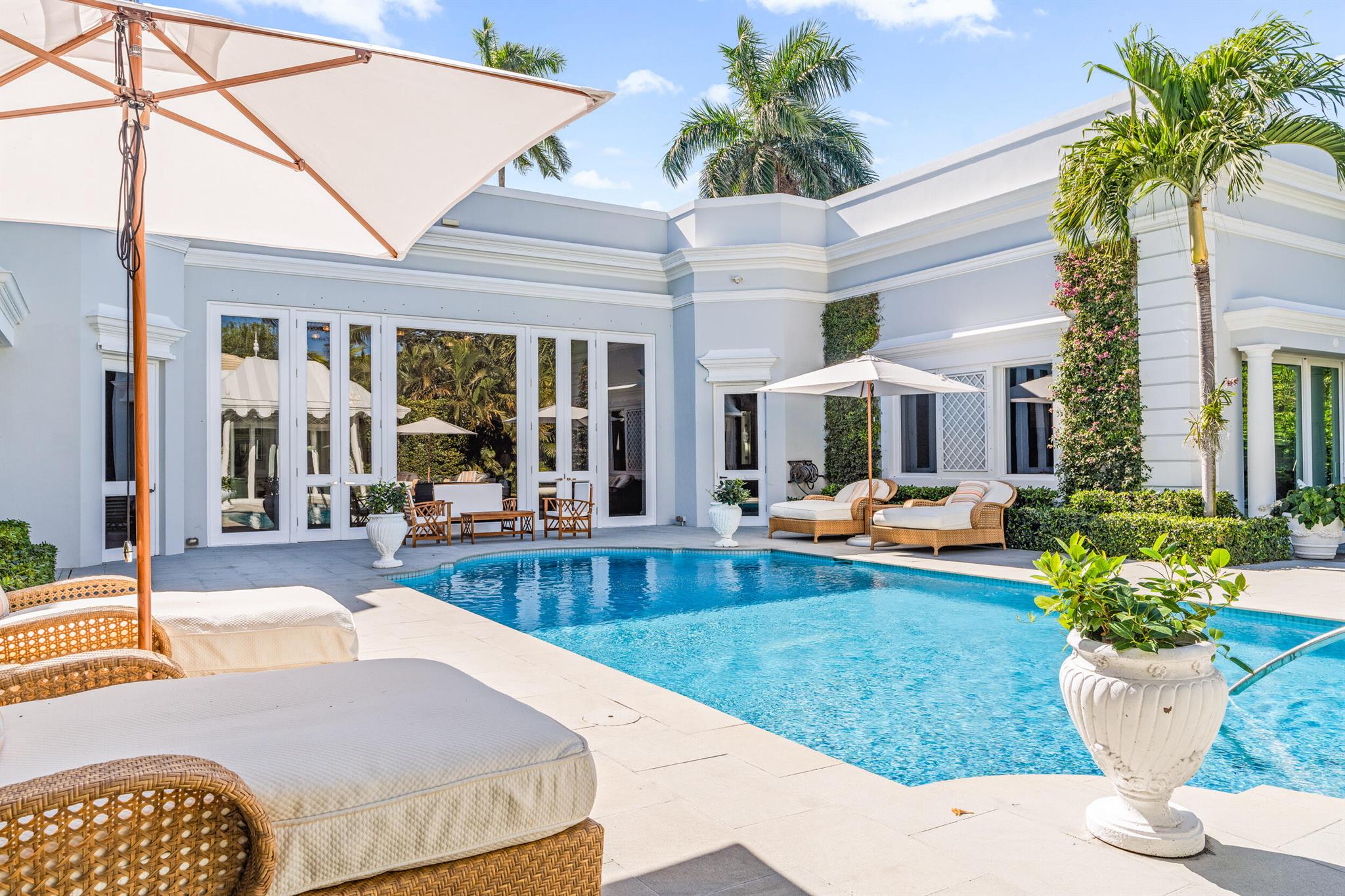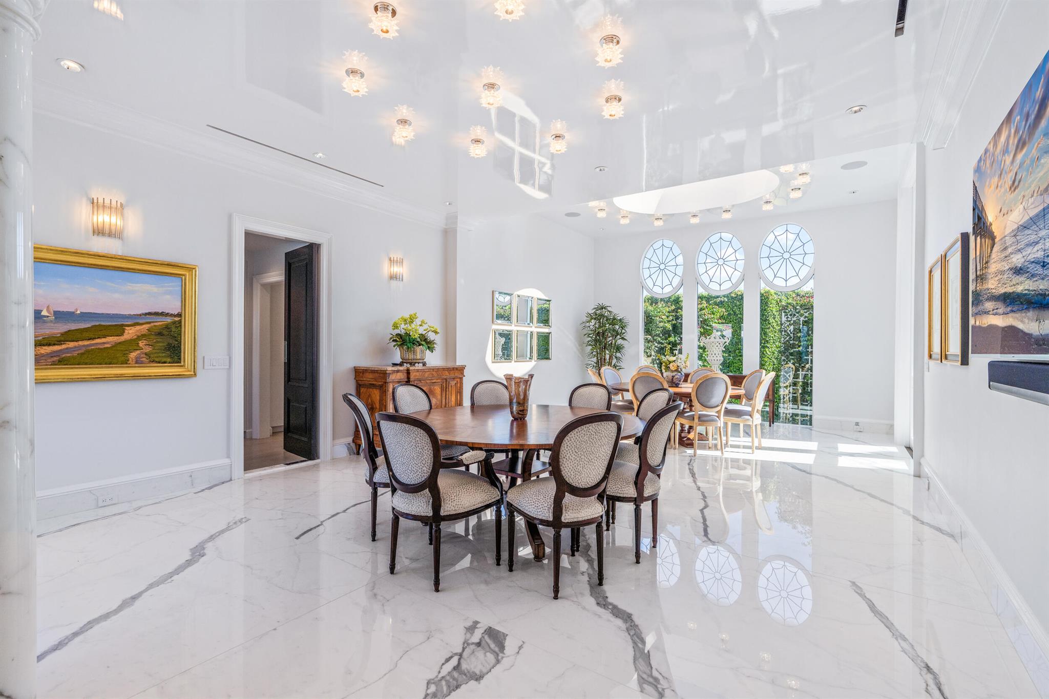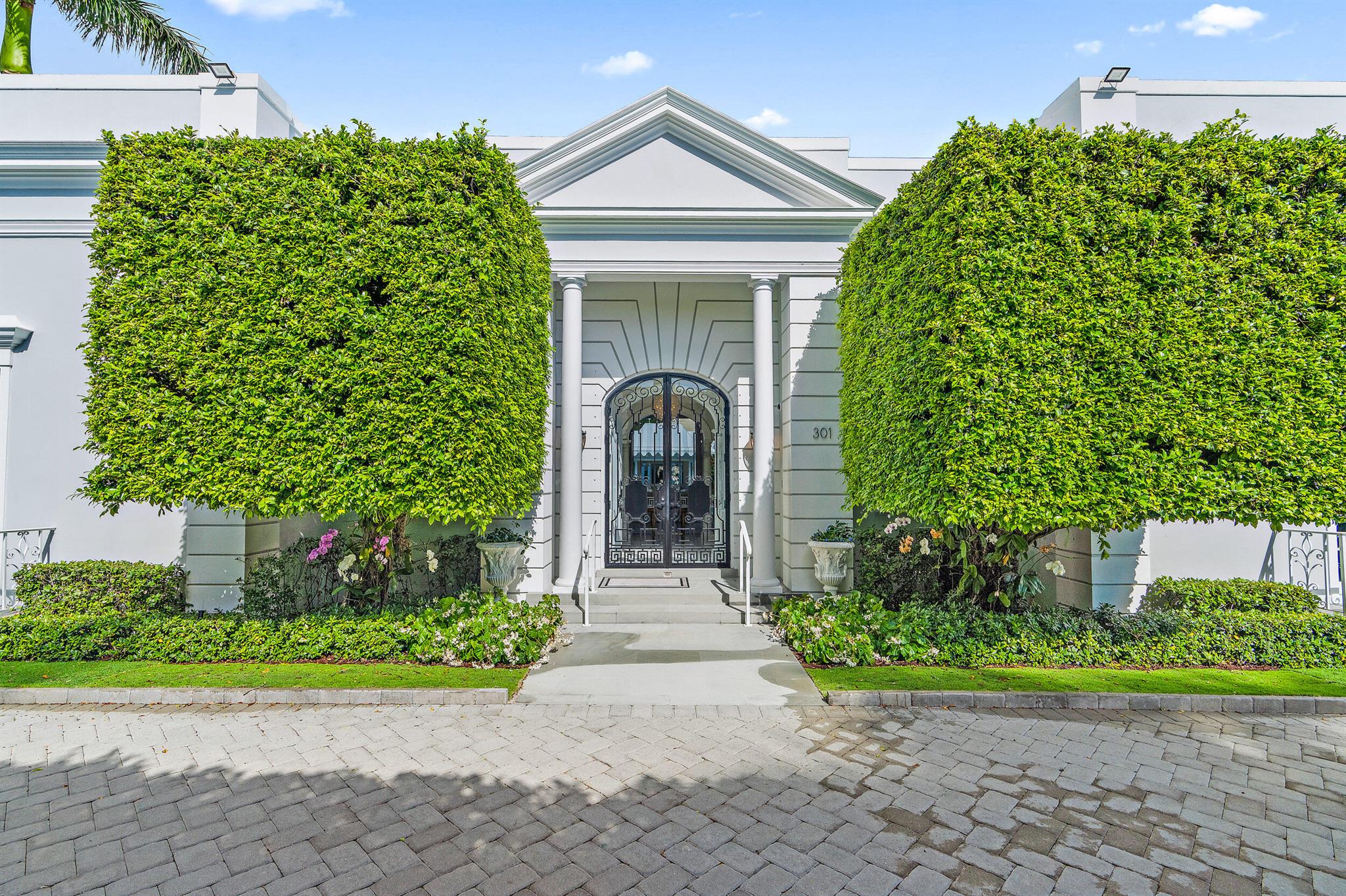 Regally elevated on over half acre this very proper Palm Beach residence showcases quintessential Palladian architecture set within beautifully landscaped pool gardens. Featuring hallmarks such as symmetry and proportion, the home offers very generous room sizes, ceiling heights, floor to ceiling windows and doors, an abundance of natural light from the many skylights throughout the home. Formal living and dining rooms are balanced with warm, inviting family gathering areas and spacious guest suites and quiet, lovely views from every window. Perfectly manicured landscaping envelopes the home, and the cabana with full guest suite anchors the north side of the grand heated swimming pool. A 3-car attached garage and plenty of driveway parking completes this wonderful north end offering.