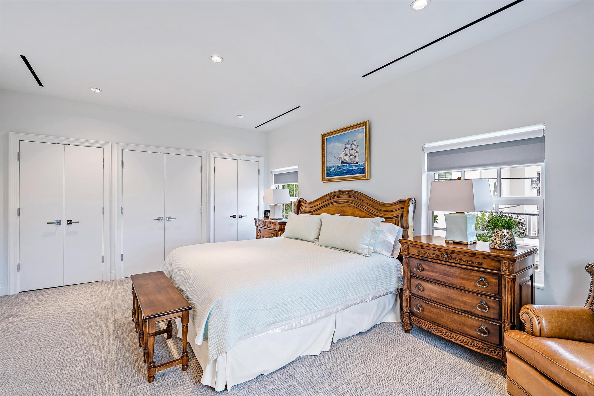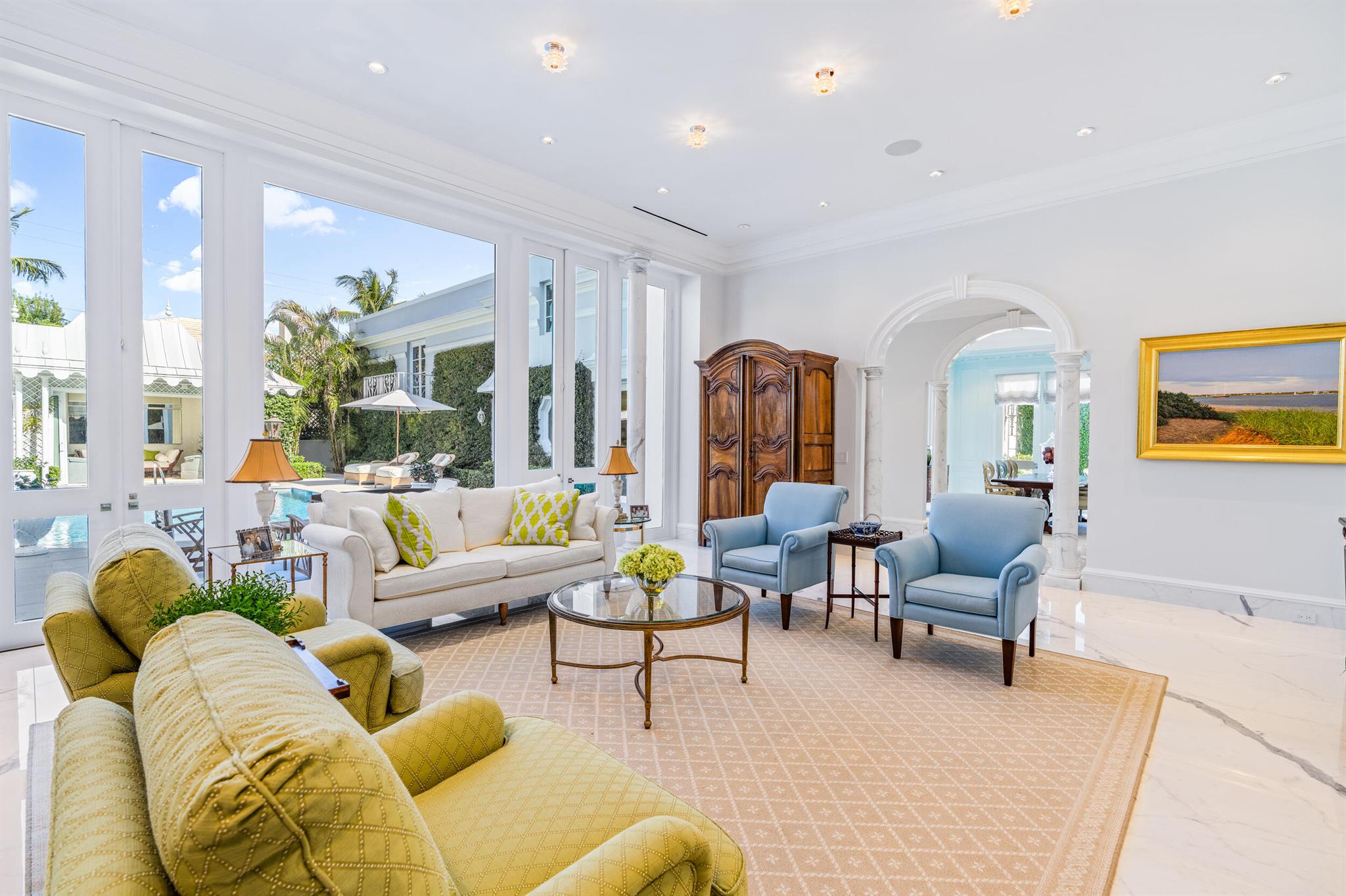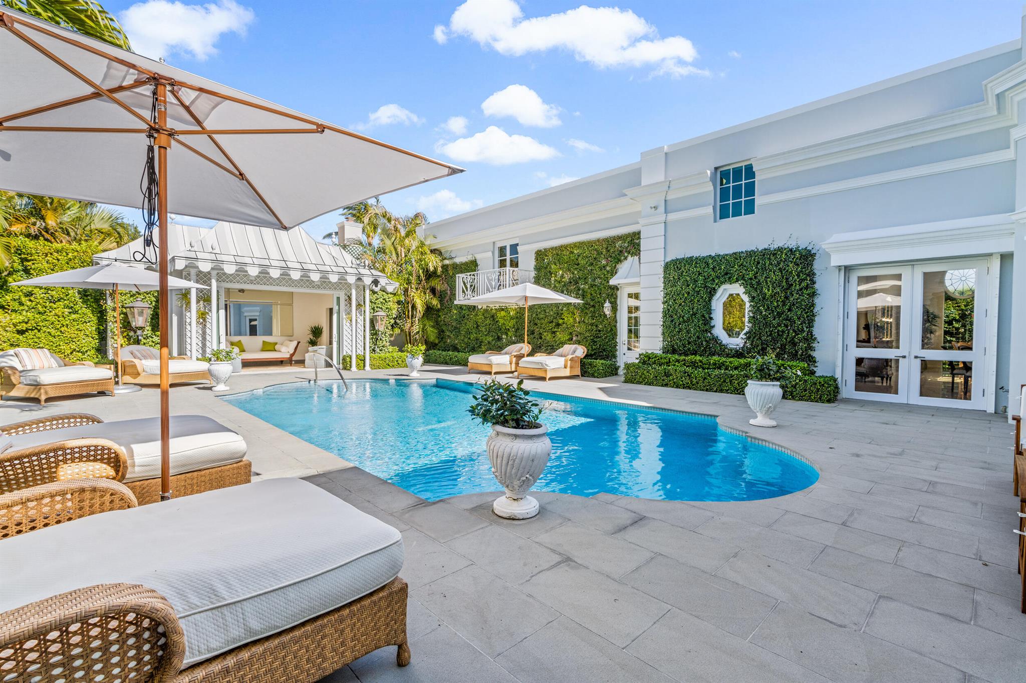 Regally elevated on over half acre this very proper Palm Beach residence showcases quintessential Palladian architecture set within beautifully landscaped pool gardens. Featuring hallmarks such as symmetry and proportion, the home offers very generous room sizes, ceiling heights, floor to ceiling windows and doors, an abundance of natural light from the many skylights throughout the home. Formal living and dining rooms are balanced with warm, inviting family gathering areas and spacious guest suites and quiet, lovely views from every window. Perfectly manicured landscaping envelopes the home, and the cabana with full guest suite anchors the north side of the grand heated swimming pool. A 3-car attached garage and plenty of driveway parking completes this wonderful north end offering.