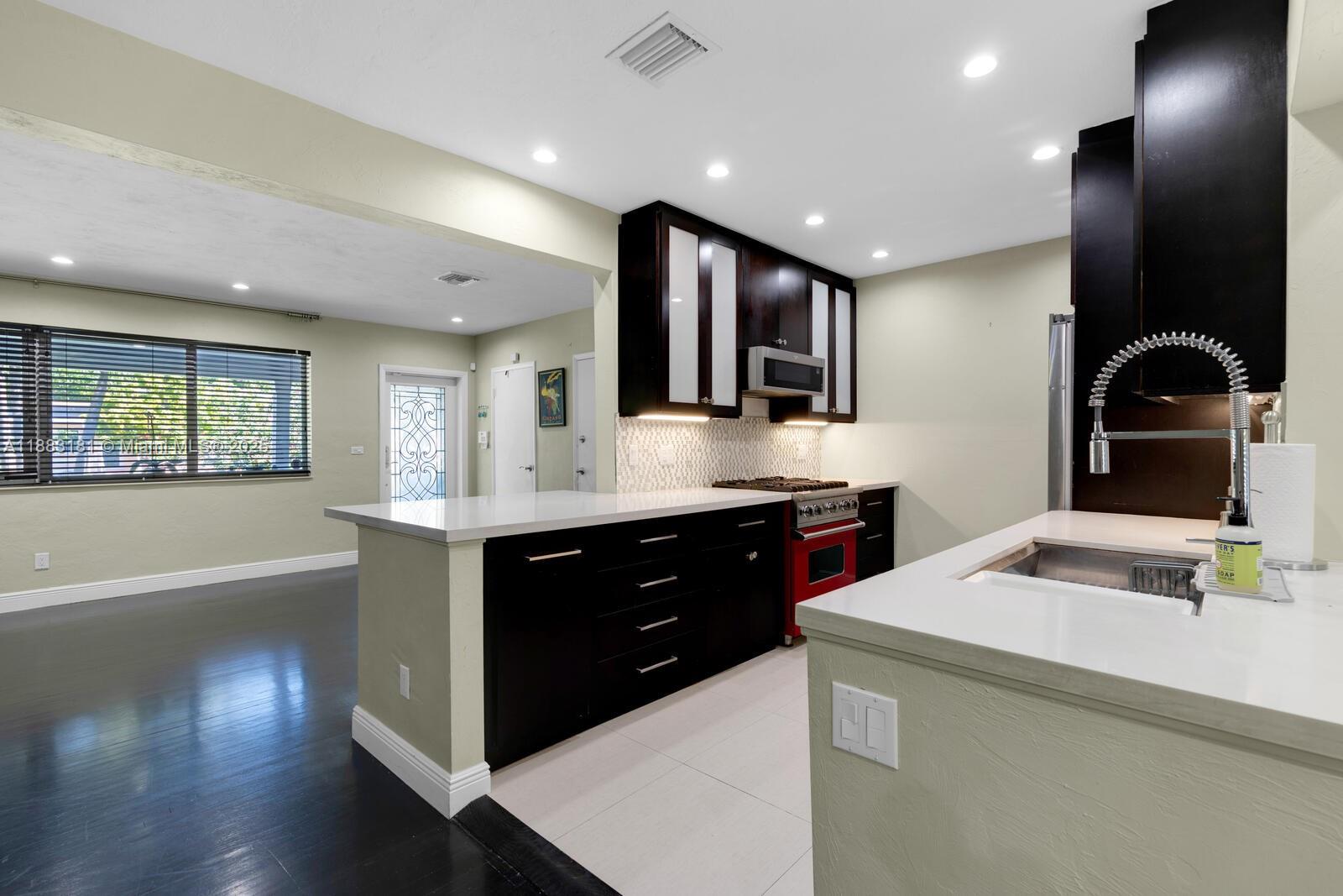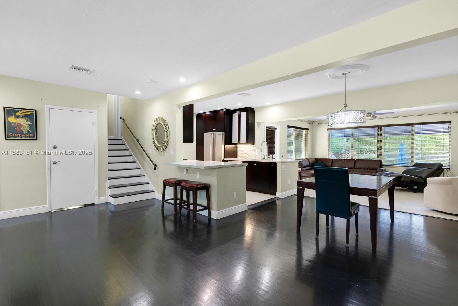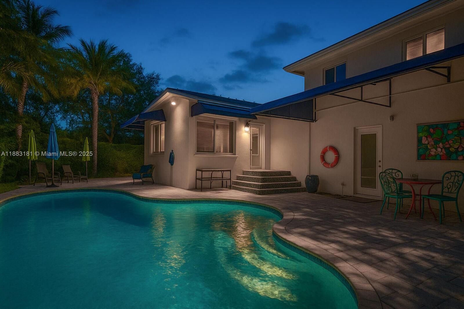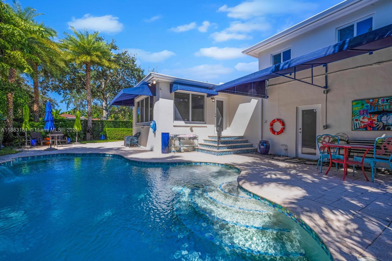 First time on the market in 57 years. House has 3/2, 1 bedroom on the first level with room for a 4th potential bedroom or living area making it ideal for growing families or those needing extra space. Florida room with panoramic view of sunlit pool and garden paradise. Spacious indoor laundry room with built in cabinets. Situated on a corner lot, the home features expertly maintained tropical landscaping that enhances curb appeal. The outdoor area is highlighted by an exquisite salt water pool and large patio, perfect for relaxation, entertaining, & enjoying the outdoors year round. Inside, the kitchen has been updated w/modern amenities including large quartz counters, S/S appliances,Viking gas stove. Hurricane impact windows and doors. Updated plumbing and electric, a/c 2016.