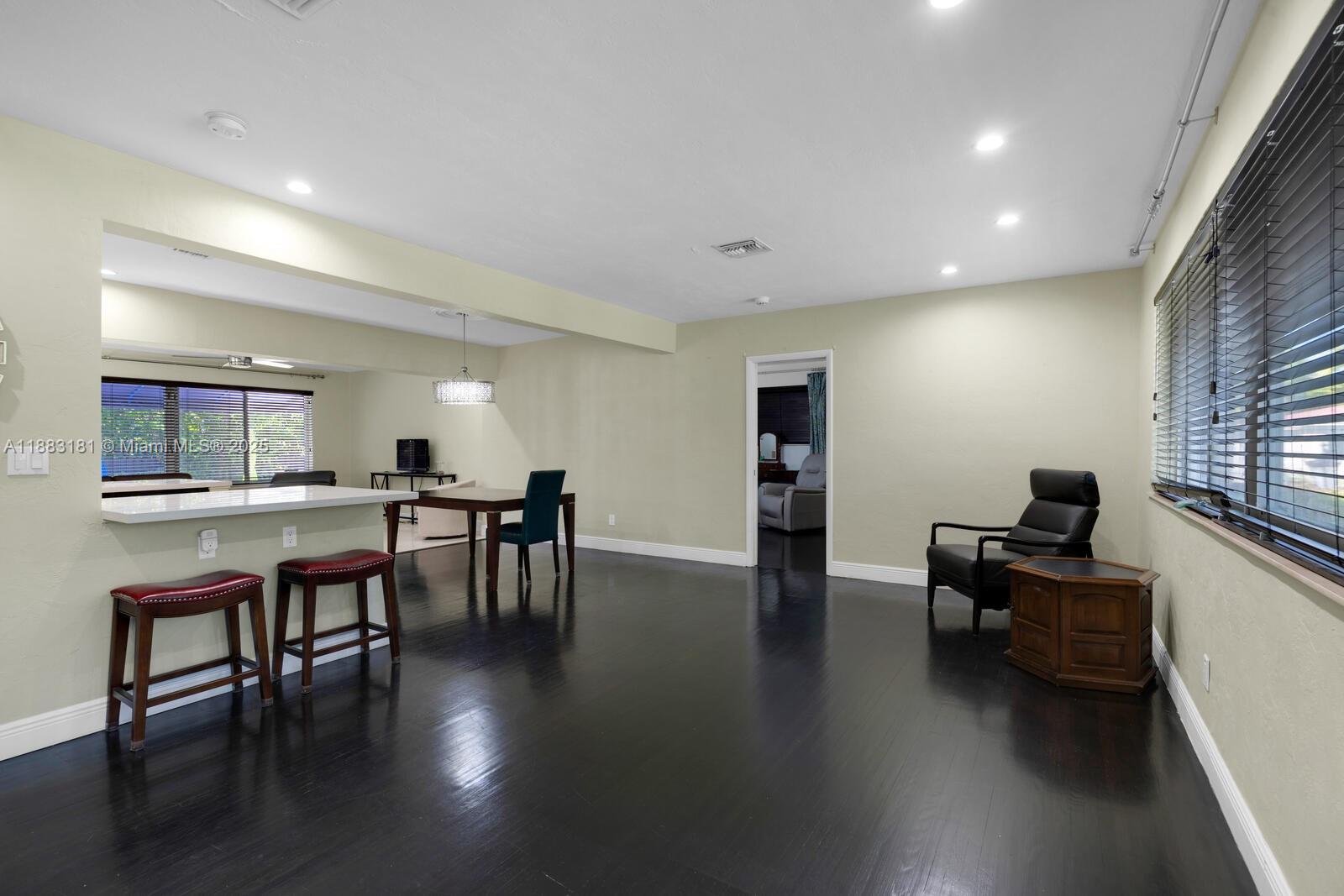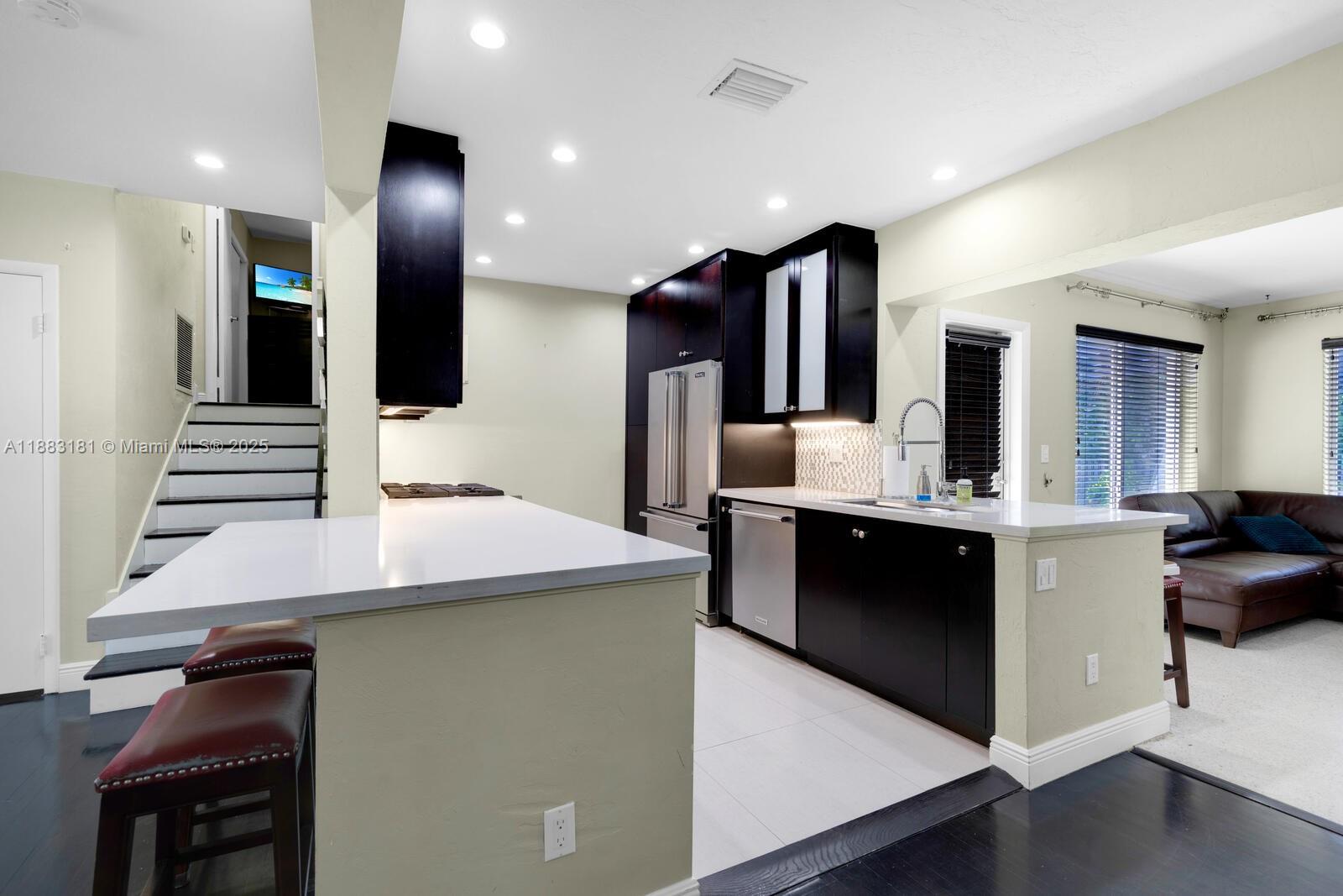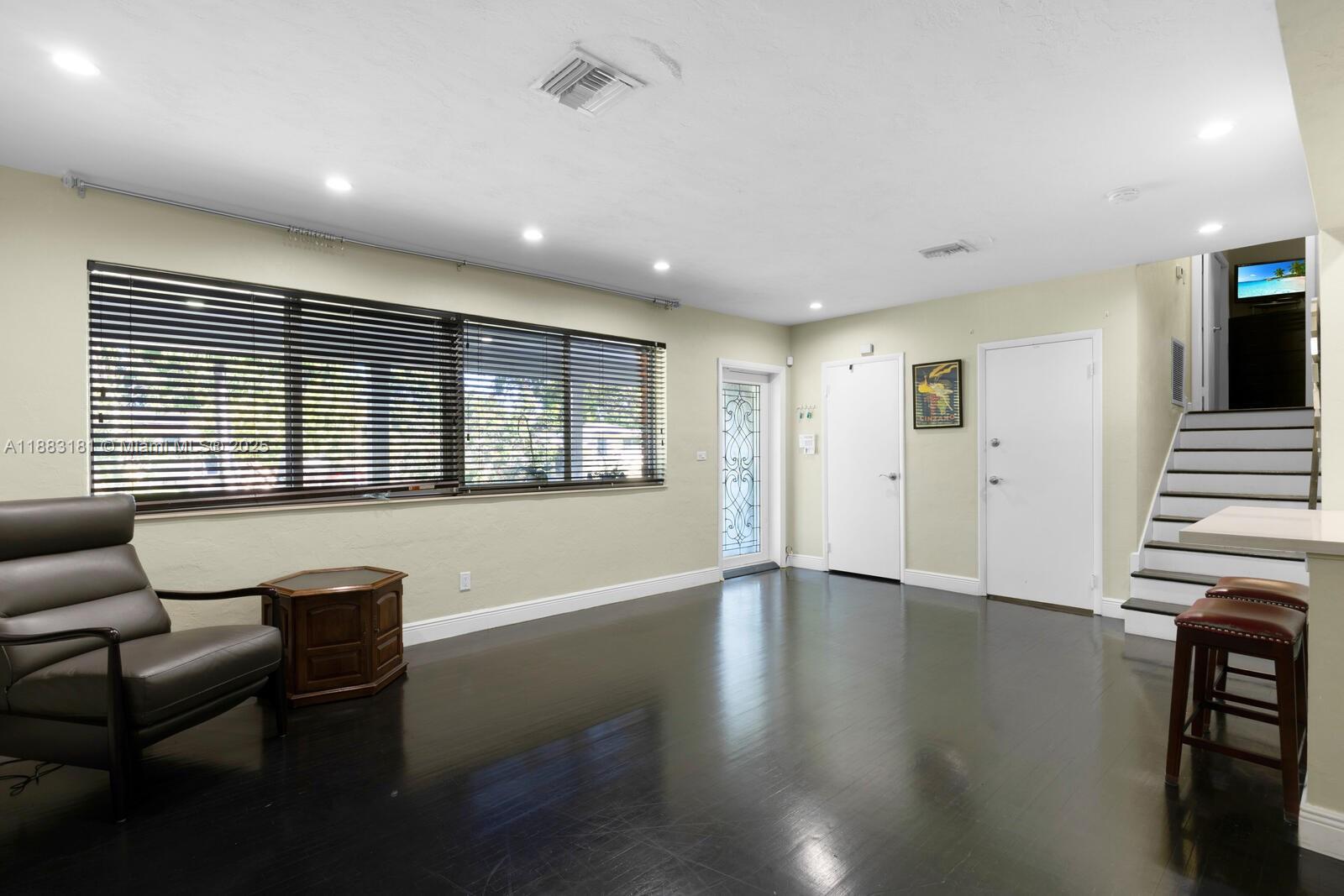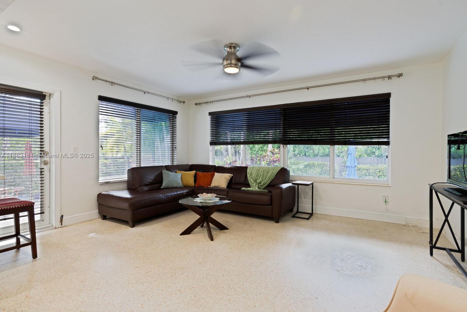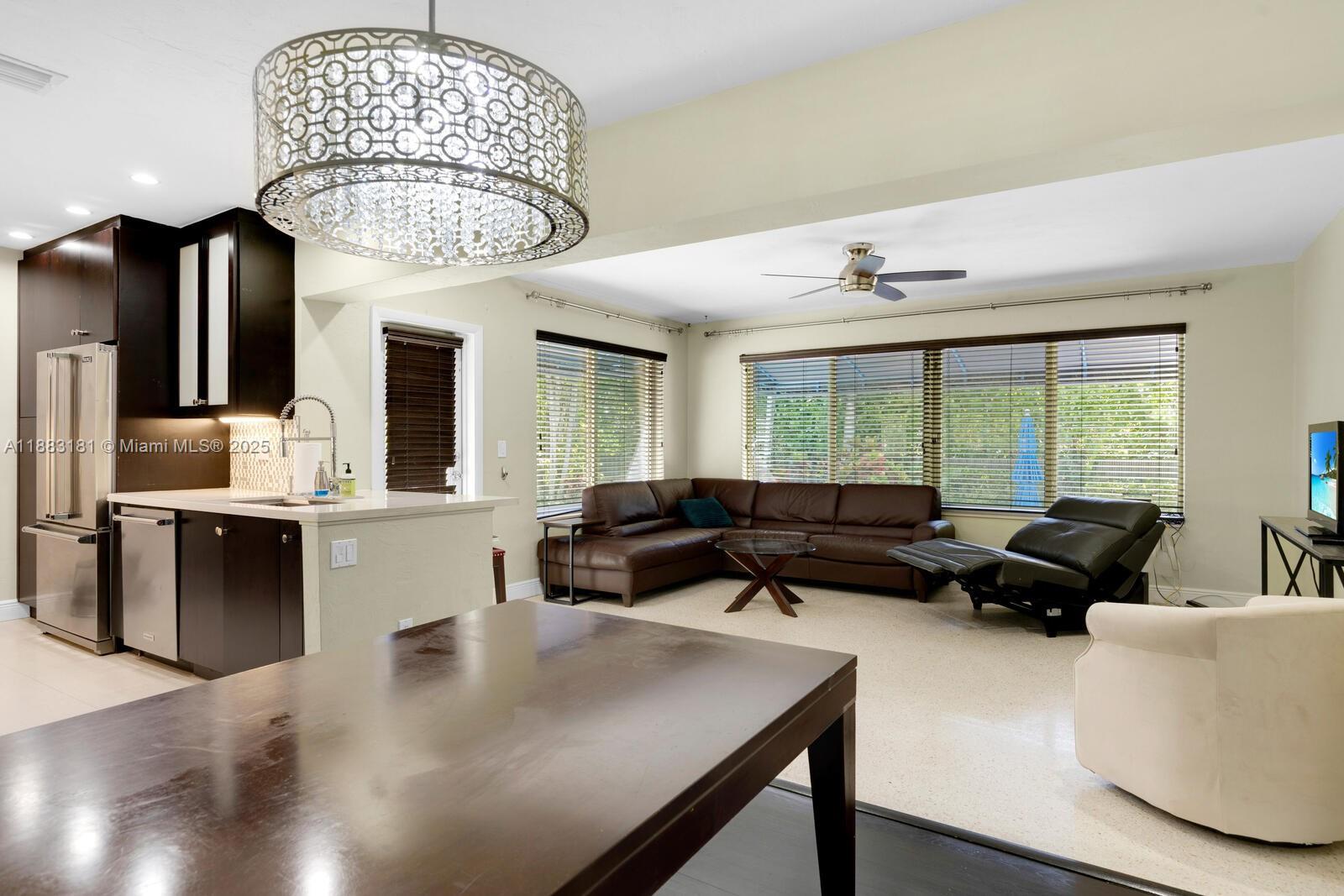 First time on the market in 57 years. House has 3/2, 1 bedroom on the first level with room for a 4th potential bedroom or living area making it ideal for growing families or those needing extra space. Florida room with panoramic view of sunlit pool and garden paradise. Spacious indoor laundry room with built in cabinets. Situated on a corner lot, the home features expertly maintained tropical landscaping that enhances curb appeal. The outdoor area is highlighted by an exquisite salt water pool and large patio, perfect for relaxation, entertaining, & enjoying the outdoors year round. Inside, the kitchen has been updated w/modern amenities including large quartz counters, S/S appliances,Viking gas stove. Hurricane impact windows and doors. Updated plumbing and electric, a/c 2016.
