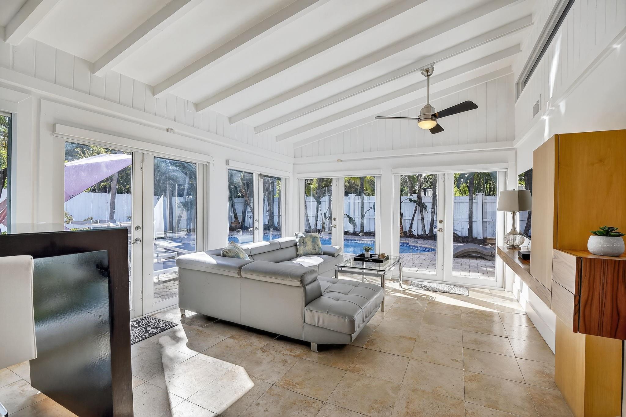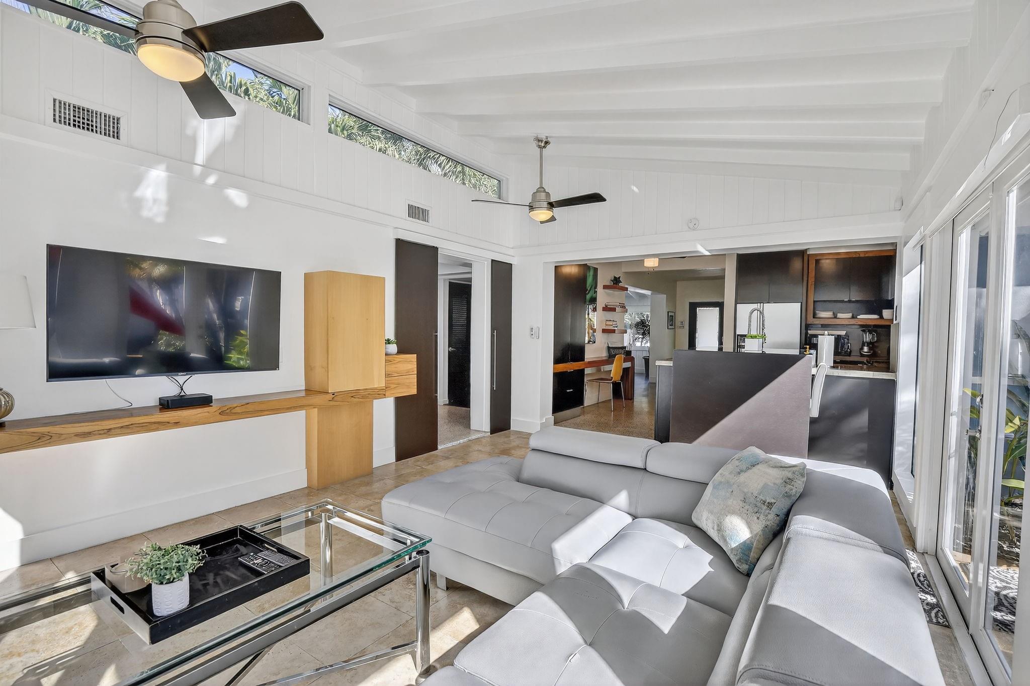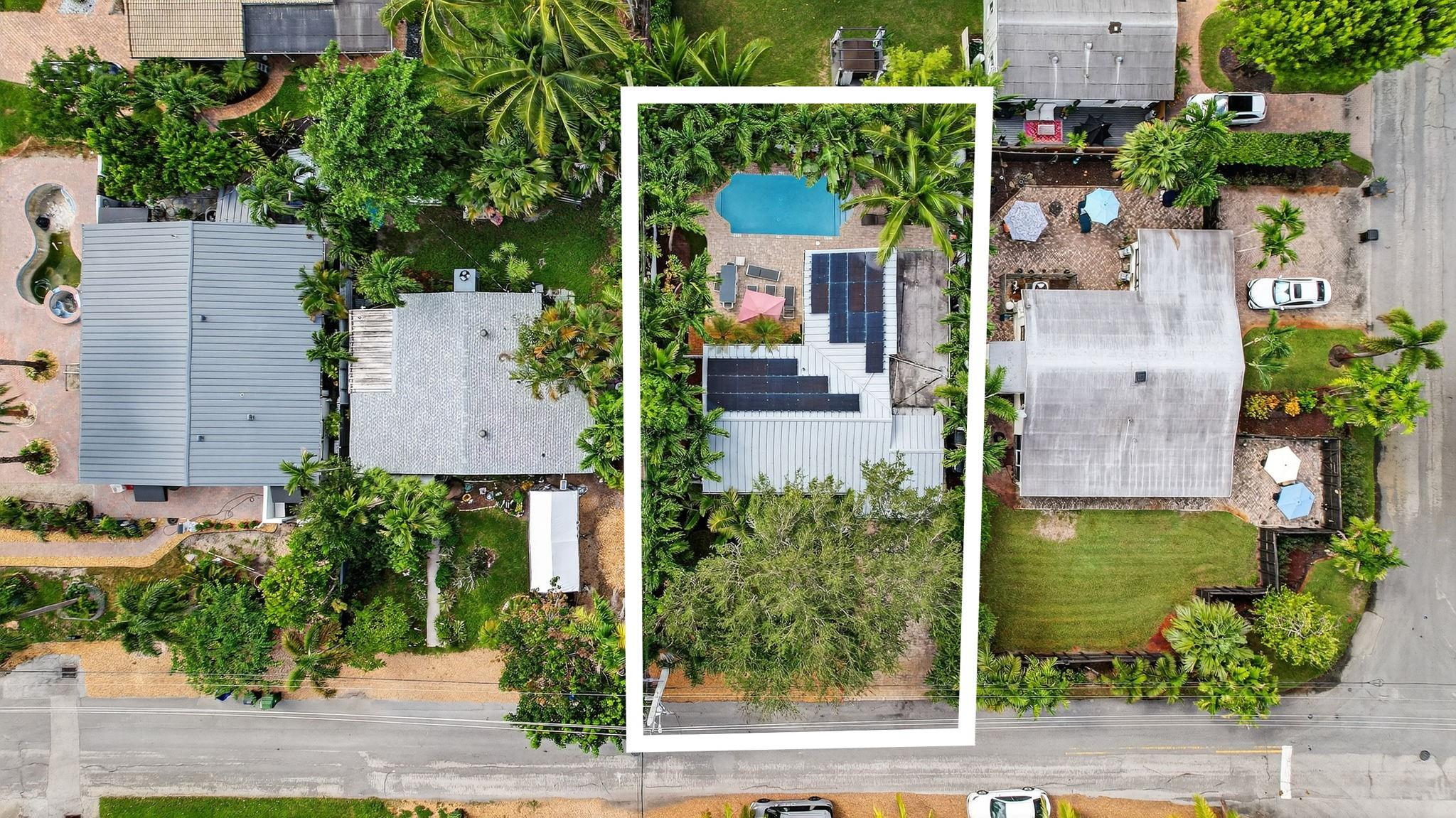 This stylish 3BR/2BA home blends comfort, charm, and modern convenience. Recent upgrades include a metal roof (2022), fully paid-off solar panels (2022), updated electrical (2022), and a resurfaced pool (2022). Bright open layout with vaulted ceilings and French doors creates seamless indoor-outdoor flow to a lush backyard oasis. Features impact windows & doors, two A/C units (one 2022), gas cooking, new attic insulation (2025), and hard-wired detectors. Offered turn-key, furniture negotiable!