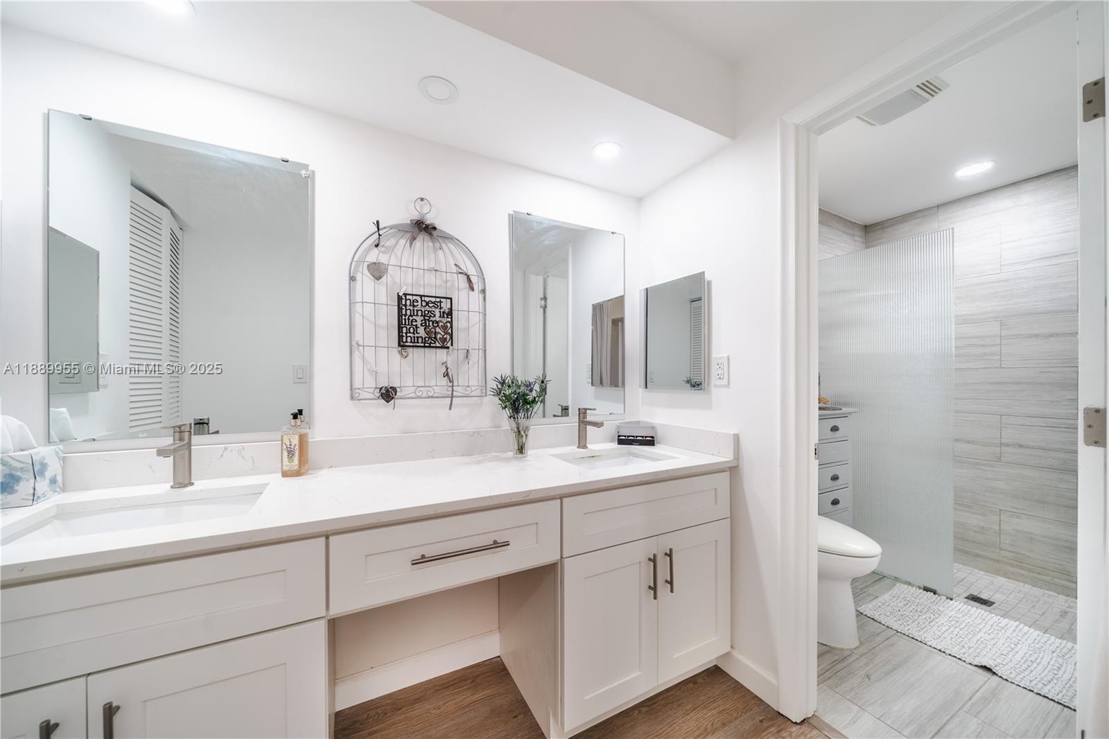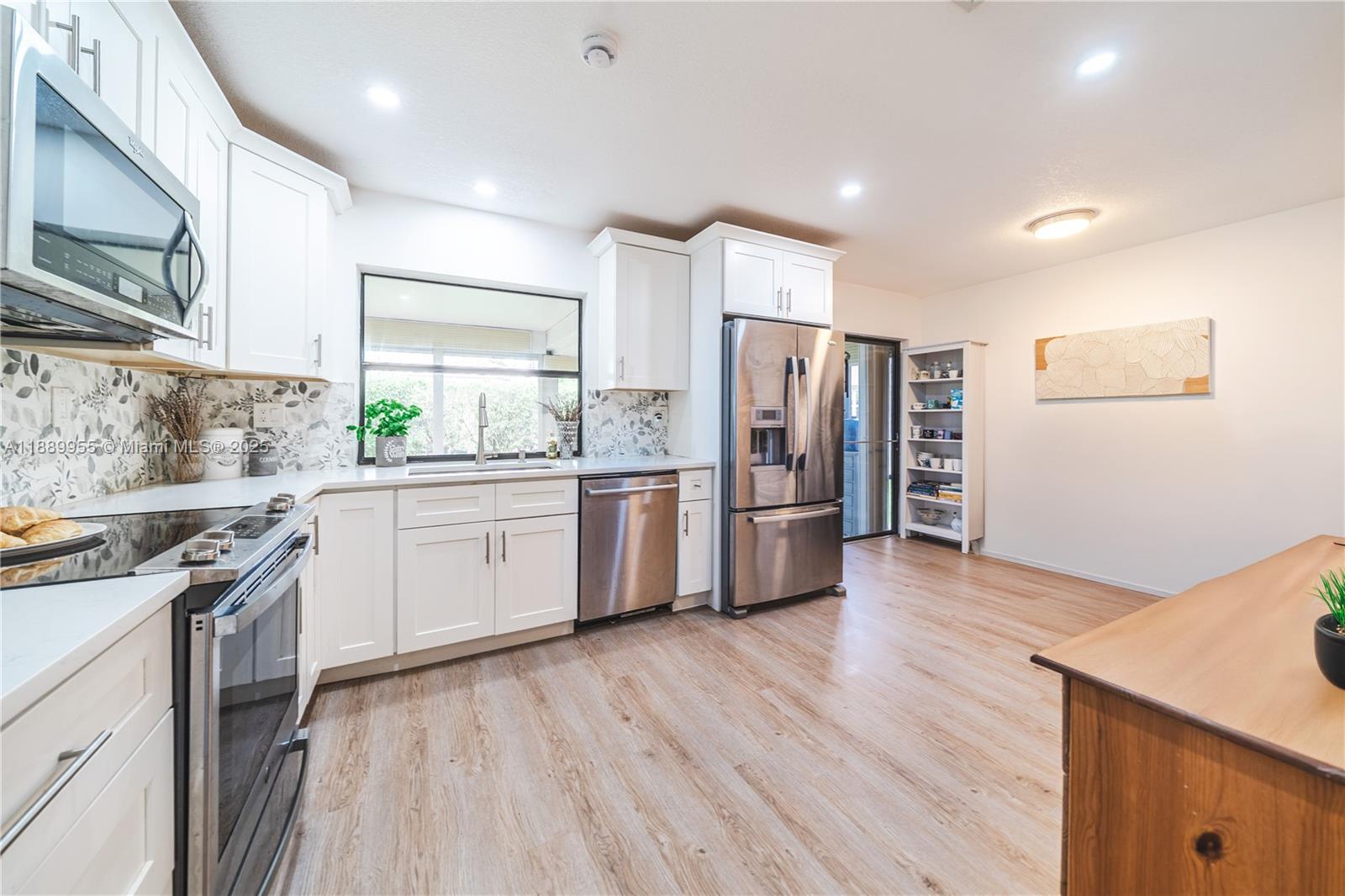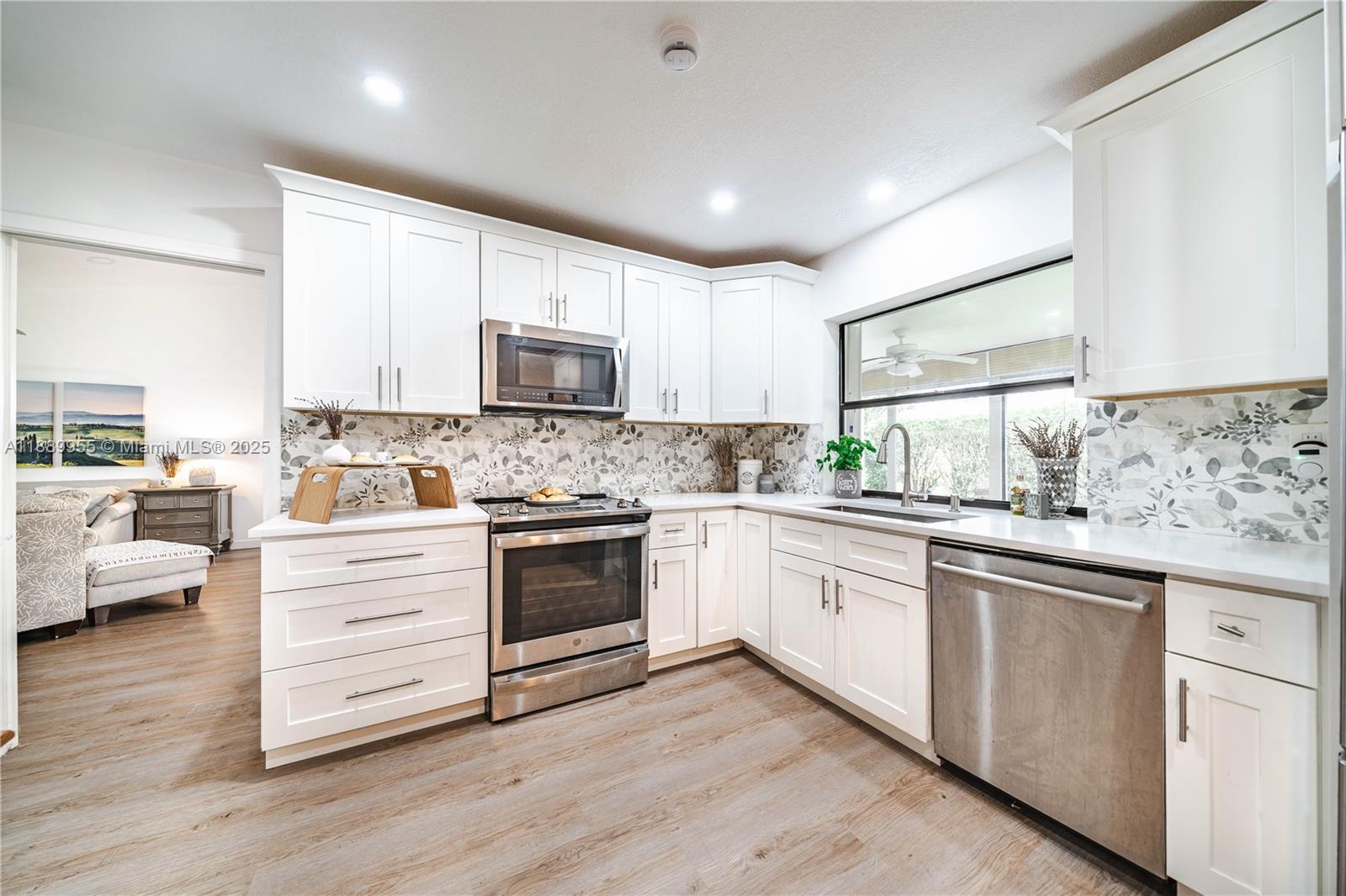 Rare opportunity to own a home in the wonderful & desirable 55+ Cloverfield community! Sitting on a Corner Lot, this beautifully remodeled single family home, features a 2 bed, 2 bath, with a luminous modern kitchen, white shaker style cabinets, top of the line quartz countertops, SS appliances, kitchen pantry, wood vinyl floors, vaulted ceilings, led lighting, large screened patio, interior laundry room, and a 2-car garage. Your soon to be future home is protected by Hurricane Shutters throughout. Low maintenance includes roof cleaning every 2-3 yrs, exterior painting every 7 yrs, basic cable, lawn care and sprinkler system! Pets WELCOME! Community is located in Central Boca, conveniently close to the town center mall, restaurants, parks and places of worship.