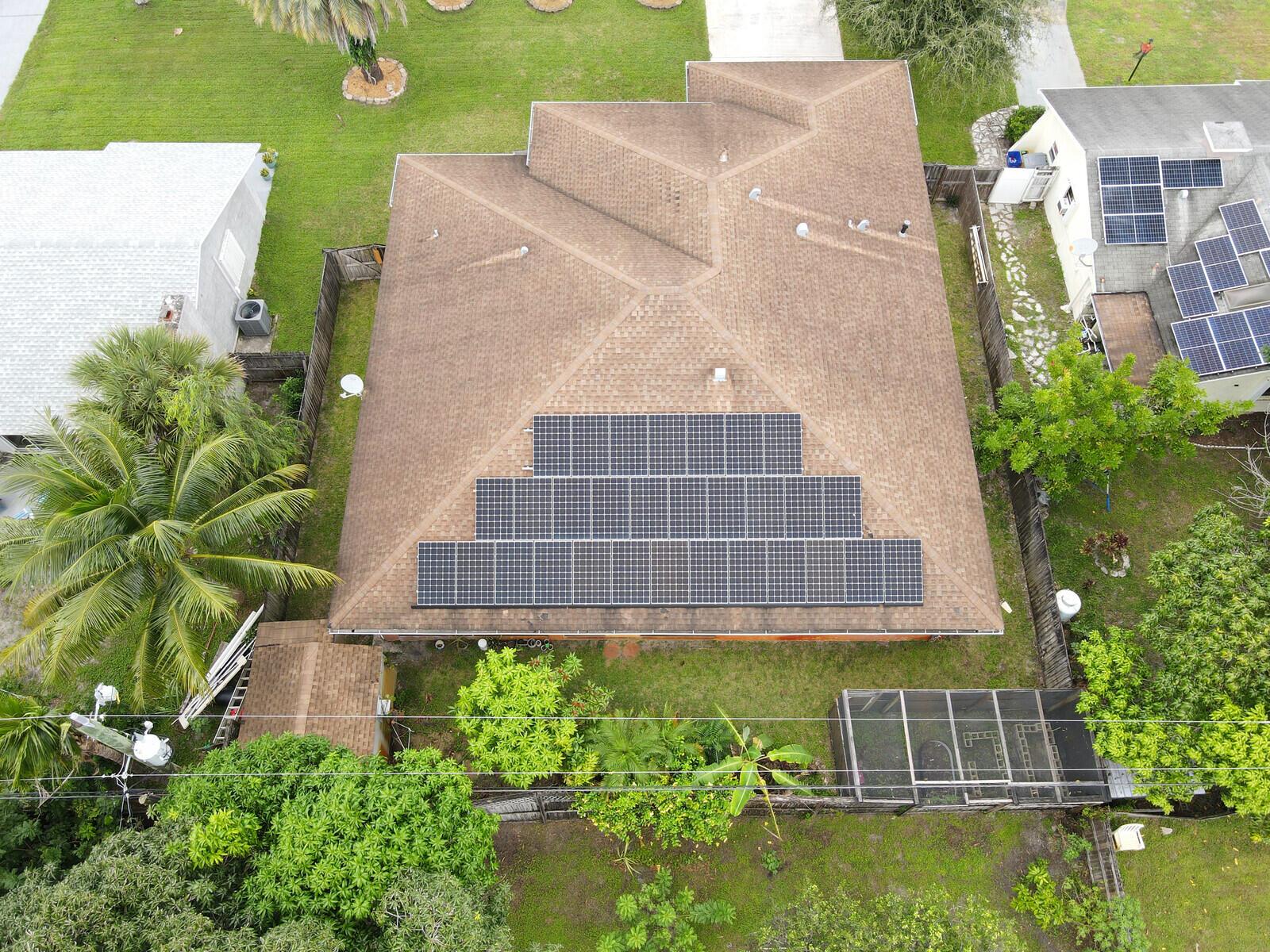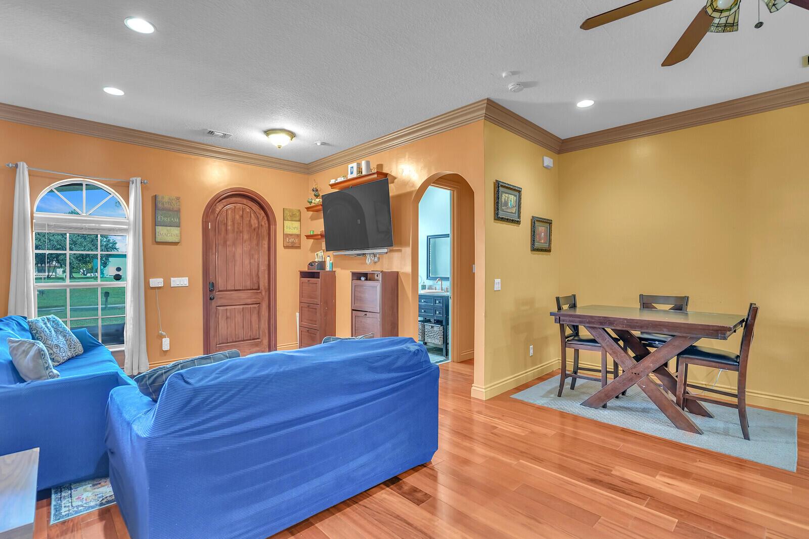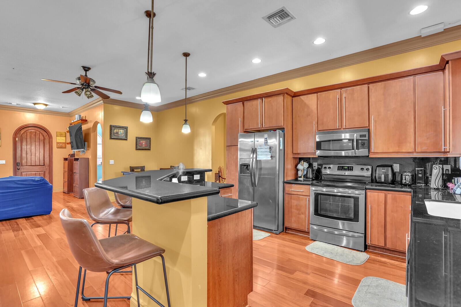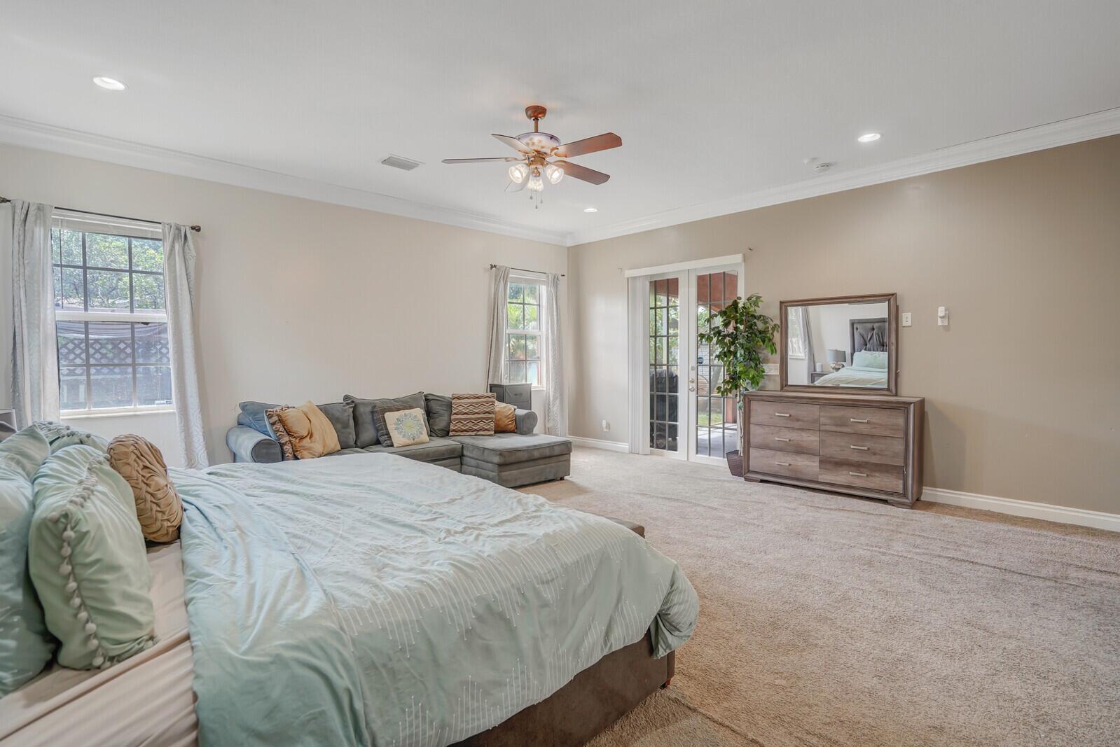 This 3-bedroom, 2.5-bath home offers 2,200+ square feet of thoughtfully designed, move-in ready living space built in 2007. The enormous 22x20-foot primary suite is a true retreat with two walk-in closets and a spa-like en-suite featuring dual vanities, a separate jacuzzi, and walk-in shower with glass enclosure. Energy-efficient features include solar panels, impact windows, and a brand-new AC (2024), with no HOA fees adding to the value. Inside, you'll find 10-foot ceilings, granite countertops, stainless steel appliances, elegant crown molding, and a practical mix of laminate, carpet, and tile flooring throughout. The desirable split floorplan provides privacy while maximizing space. Outside, enjoy a yard with fruit trees, a screened-in large back porch for year-round relaxation, and