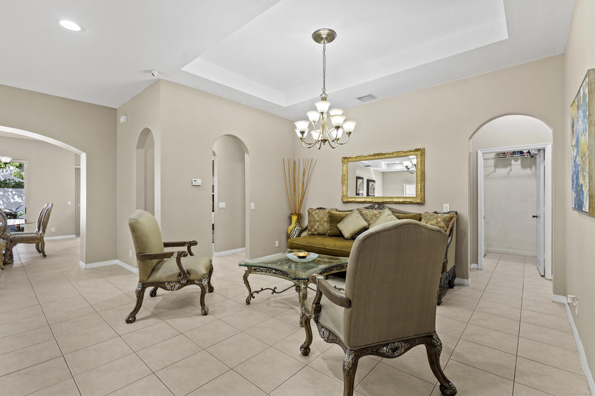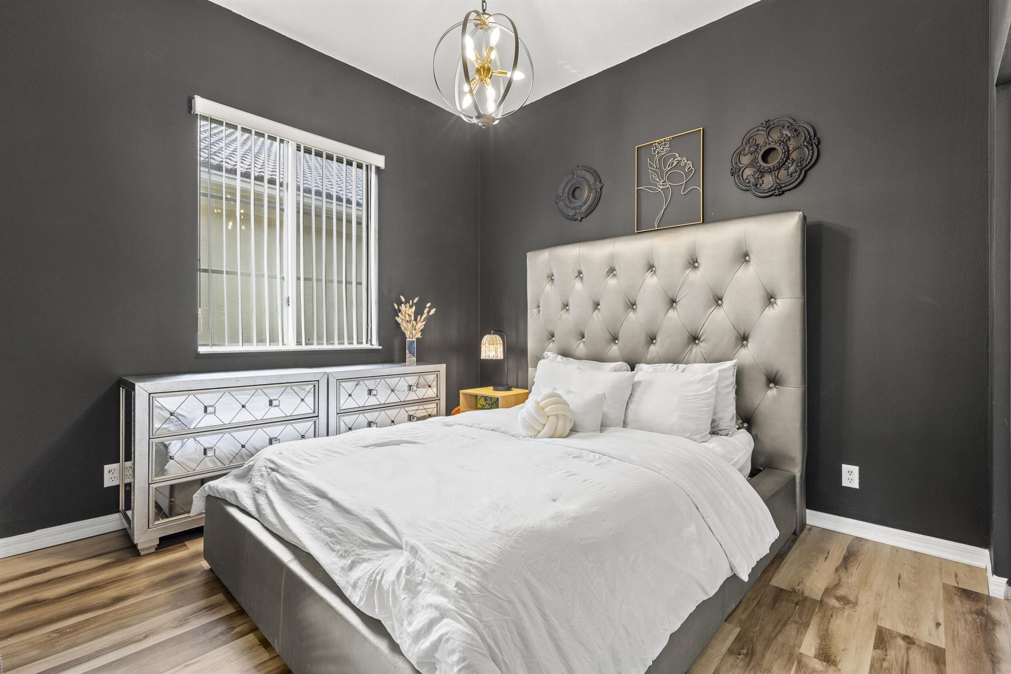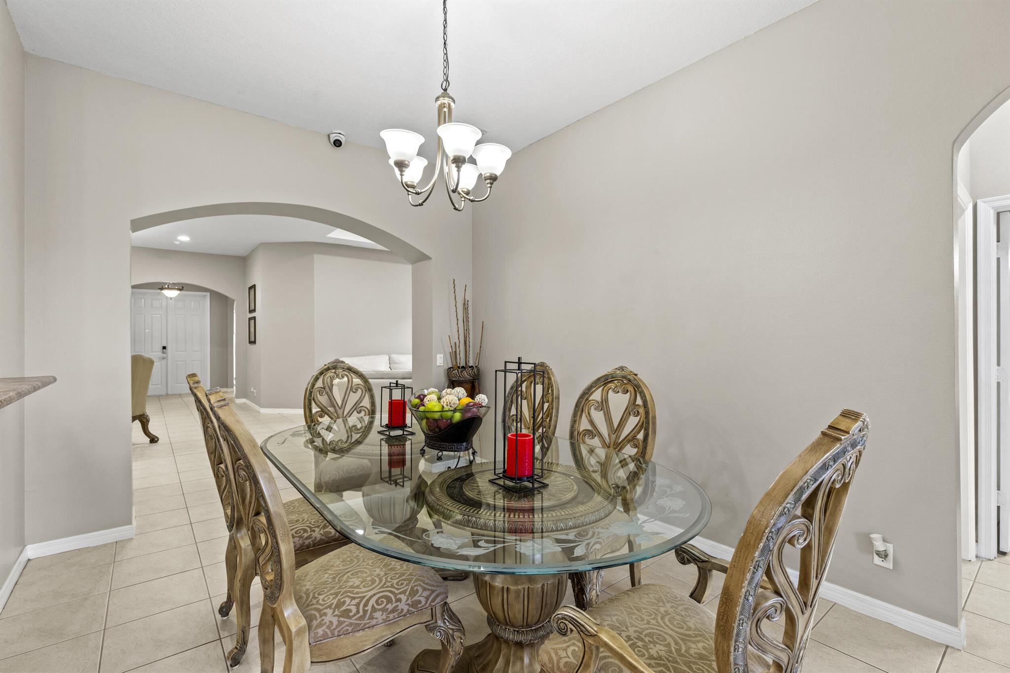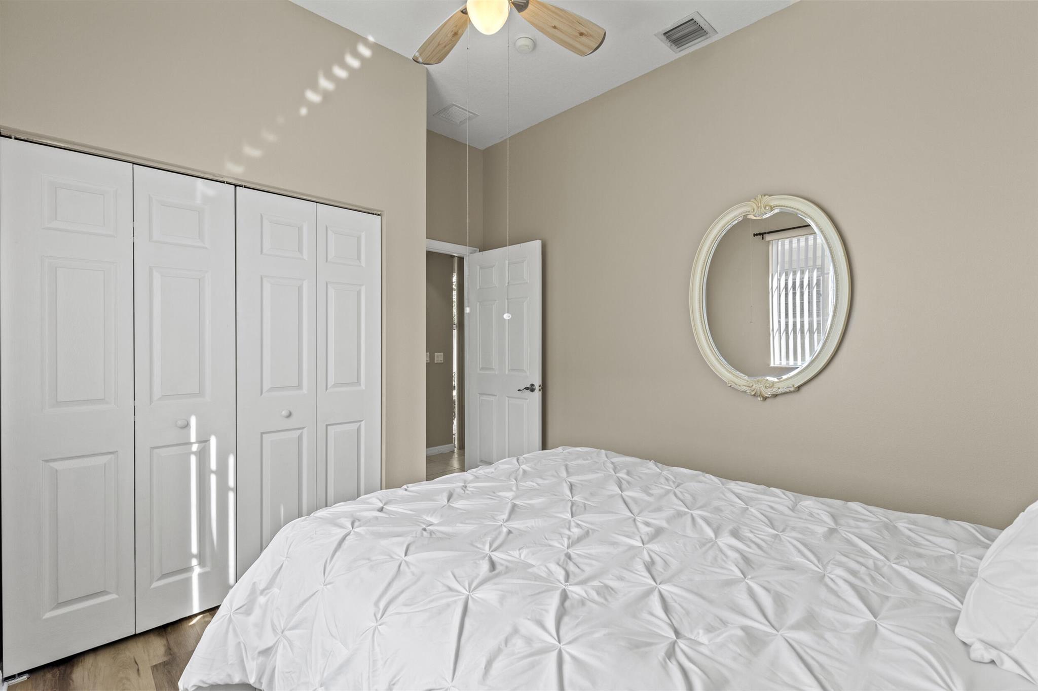 Immaculate move in condition 4 bedroom 3 bath one story home. Large open and flexible living areas plus an open eat in kitchen with a breakfast bar. 3 way split bedroom plan. High ceilings throughout. Primary bedroom has 2 walk in closets, a tray ceiling, plus access to the covered patio. Primary bathroom has a large soaking tub, separate shower, double sinks and a linen closet. Inside utility room with full size washer and dryer. Double door front entry into a spacious foyer. Paver driveway and a 2 car garage with high ceilings for lots of storage. Sidewalks throughout this guard gated neighborhood.Lots of activities at the community clubhouse for all ages. Tennis, pickleball, pool, fitness, playground, ping pong, billiards, cards, banquet hall with a kitchen and management on site.