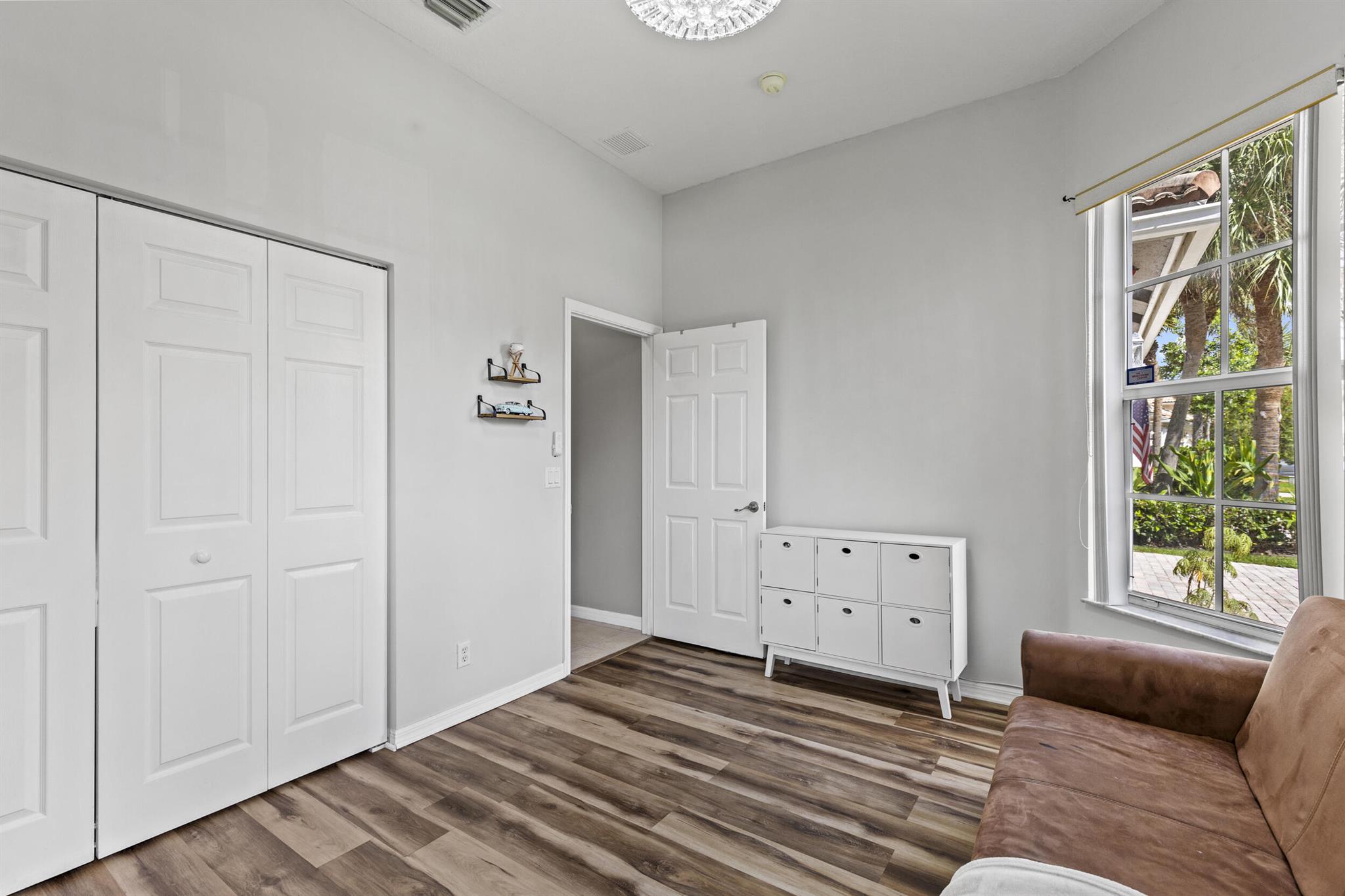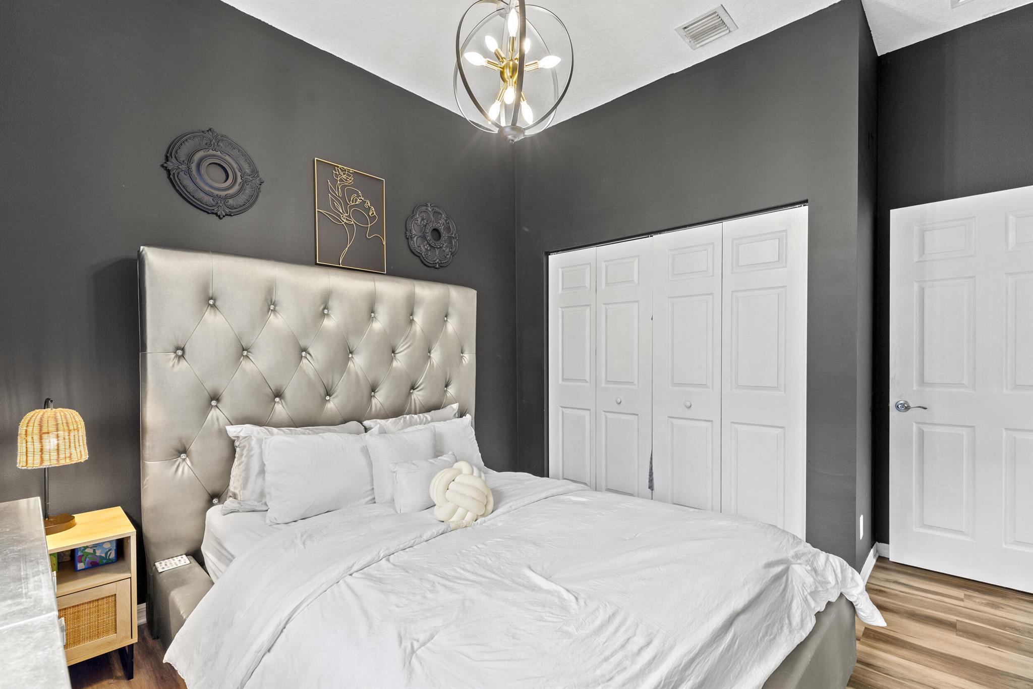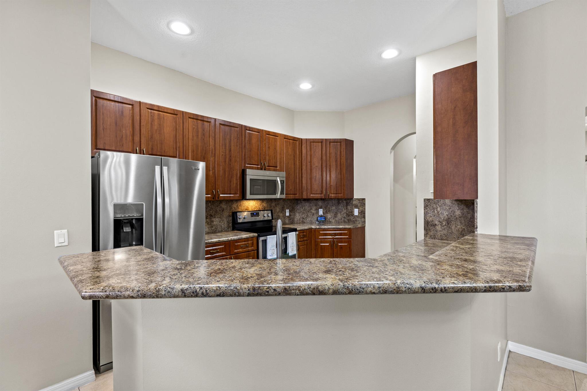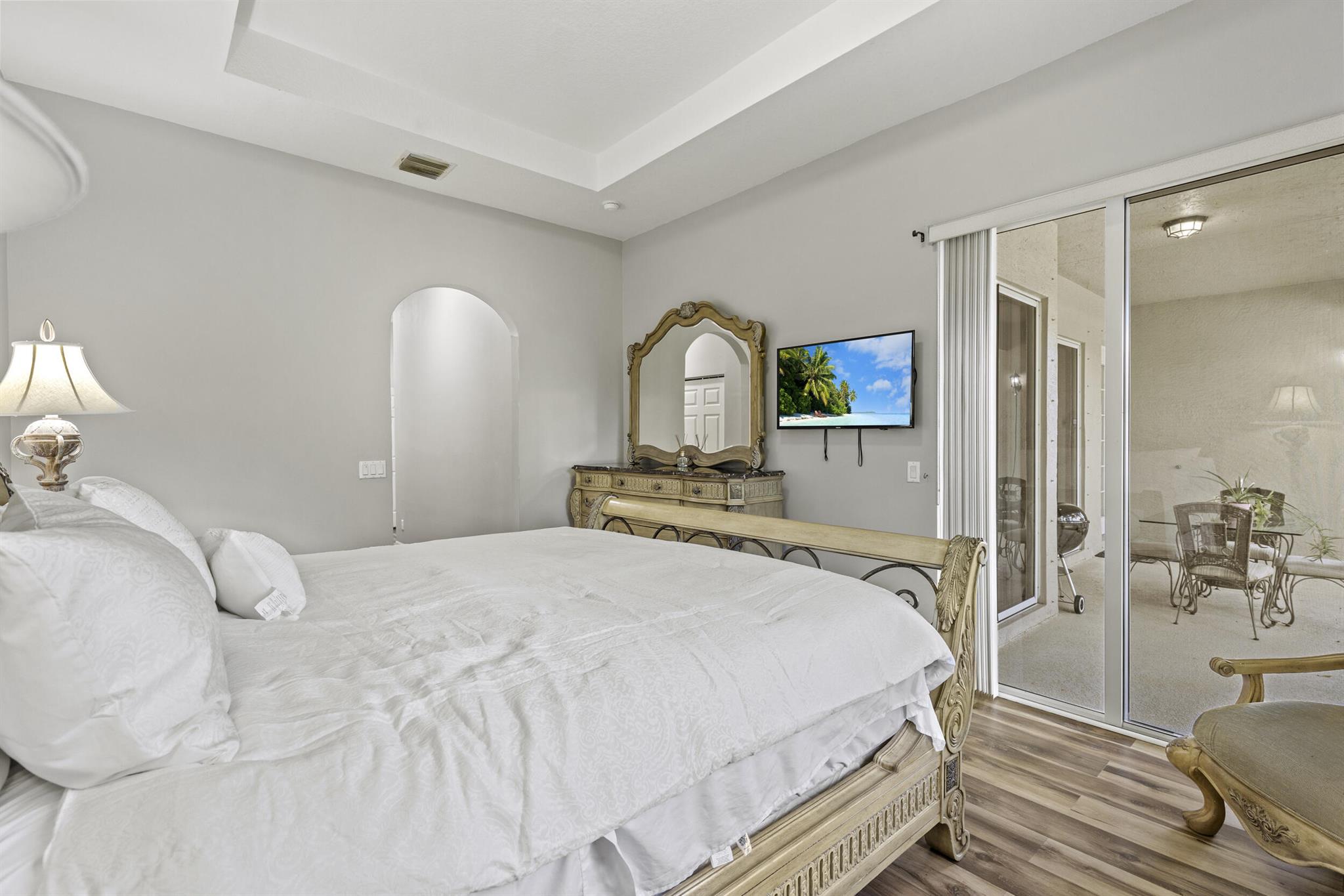 Immaculate move in condition 4 bedroom 3 bath one story home. Large open and flexible living areas plus an open eat in kitchen with a breakfast bar. 3 way split bedroom plan. High ceilings throughout. Primary bedroom has 2 walk in closets, a tray ceiling, plus access to the covered patio. Primary bathroom has a large soaking tub, separate shower, double sinks and a linen closet. Inside utility room with full size washer and dryer. Double door front entry into a spacious foyer. Paver driveway and a 2 car garage with high ceilings for lots of storage. Sidewalks throughout this guard gated neighborhood.Lots of activities at the community clubhouse for all ages. Tennis, pickleball, pool, fitness, playground, ping pong, billiards, cards, banquet hall with a kitchen and management on site.