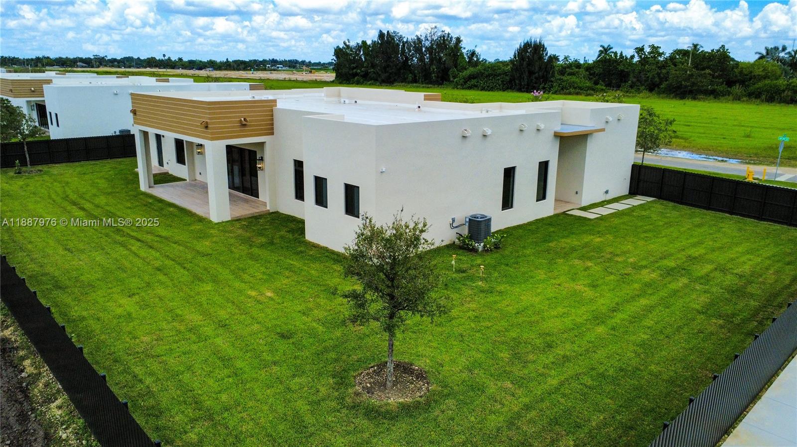 Modern CBS luxury new Construction home with flat TPO roof, hurricane-impact door/ windows, and in-law quarters. Spacious Lot with 17,025 sq ft modern sealed polished driveway with turf, double car garage, landscaped yard, sprinkler, and front /rear terrace/ porch. Inside, high 11' ceiling, porcelain flooring throughout the property, panel wood interior doors, recessed lighting, two tankless water heaters, two a/c units, and designed lamps. Chef's kitchen with modern wood cabinets to the ceiling, quartz counters with a waterfall island, stainless steel ceramic cooktop slide-in range, drawer microwave, hood, dishwasher, and energy-efficient smart refrigerator. Bathrooms with wood cabinets and quartz countertops. Main suite with a large walk-in closet. A/C laundry with washer/dryer.