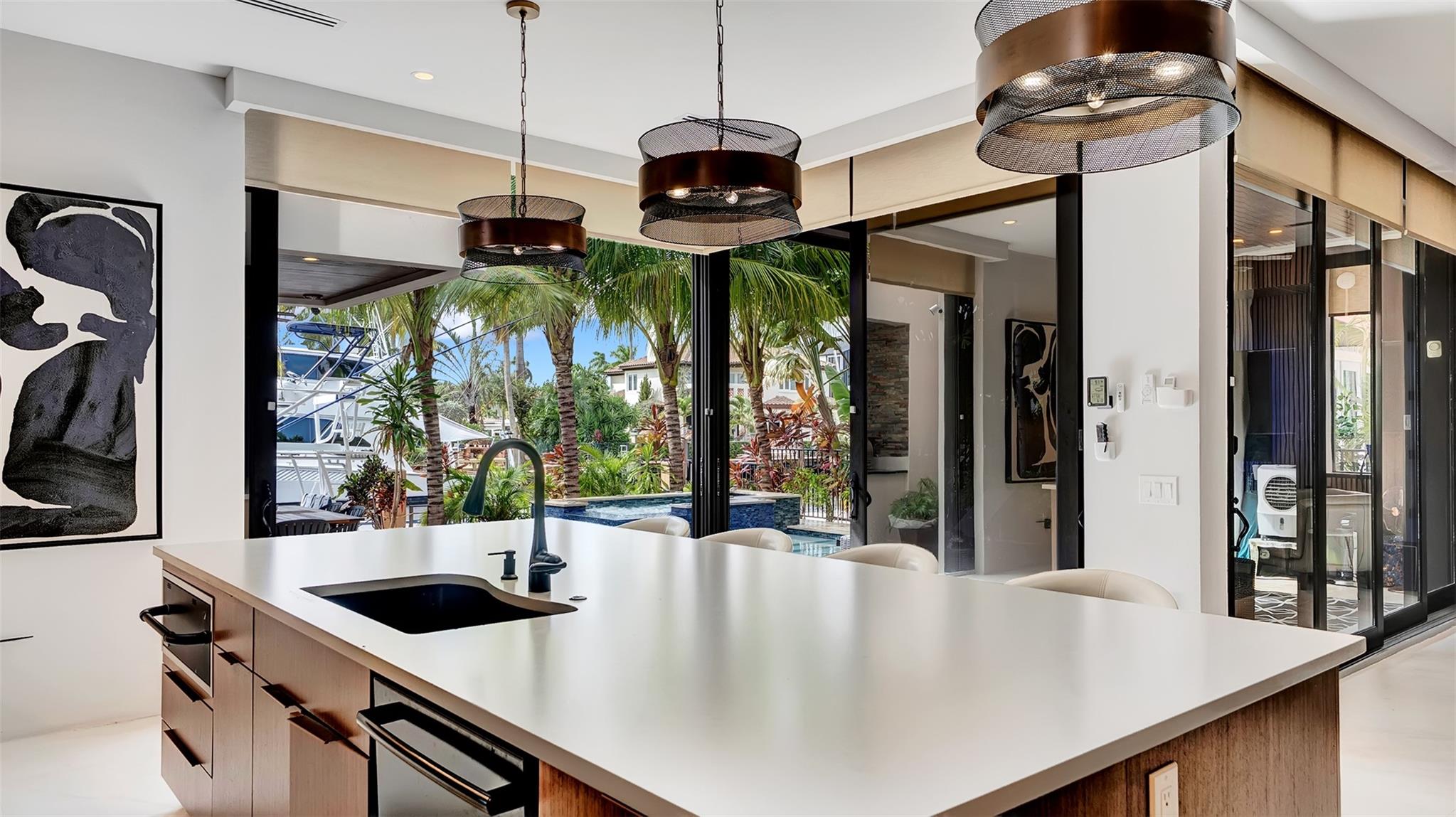 Not your average home on the Las Olas Isles, behind the gates this custom 4-bed, 4.5-bath home spans 4,539 Sqft. Meticulous attention to detail and modern elegance helps define this home, which comes equipped with high-impact windows, 12 camera surveillance system, large porcelain tiles, quartz counters, 8.5 Tons of AC systems, low E windows with bronze tint a floating staircase over a 170-bottle wine cellar, a bar for entertaining, the kitchen has a huge island, 6 burner gas range that overlooks the family room that flows outside through the 11’ pocket sliders to a screened Lani. Outside you can entertain with your pizza oven & grill, pool and jacuzzi, the 50’ dock is well equipped with 30/50 amp. smart illumination by Lutron & Dals. Live luxuriously in this exquisite Idlewyld residence.