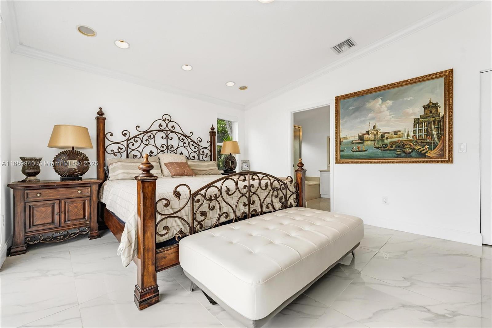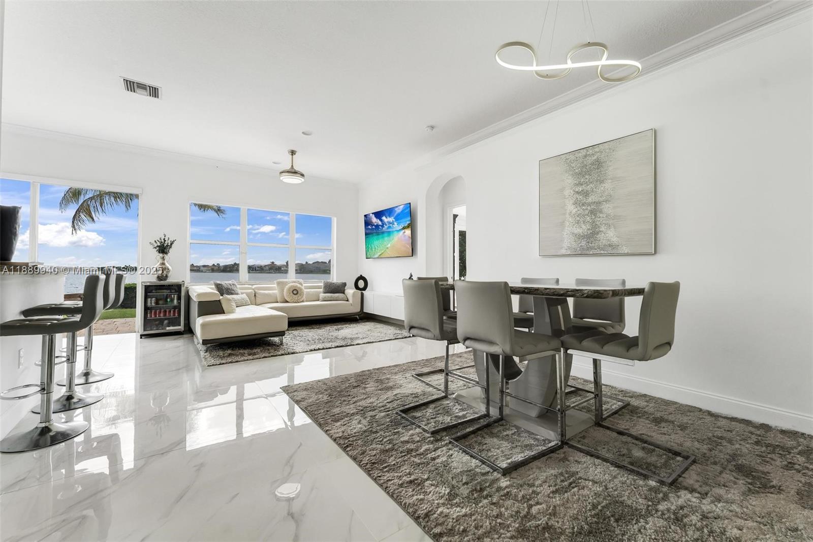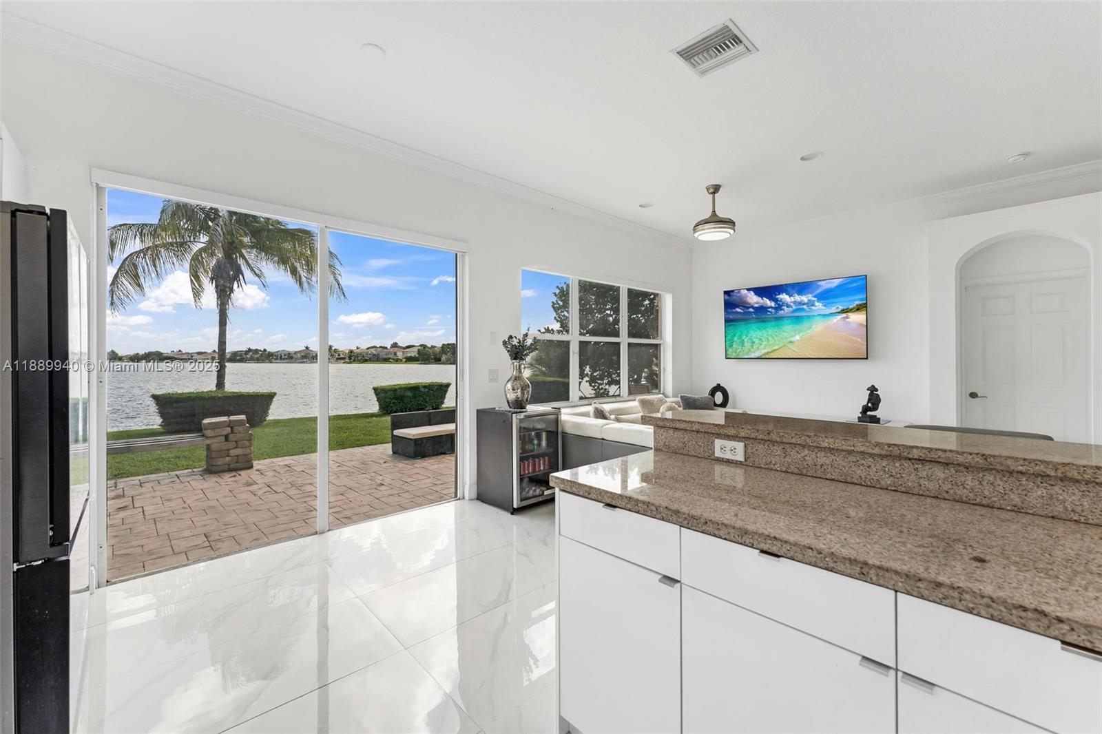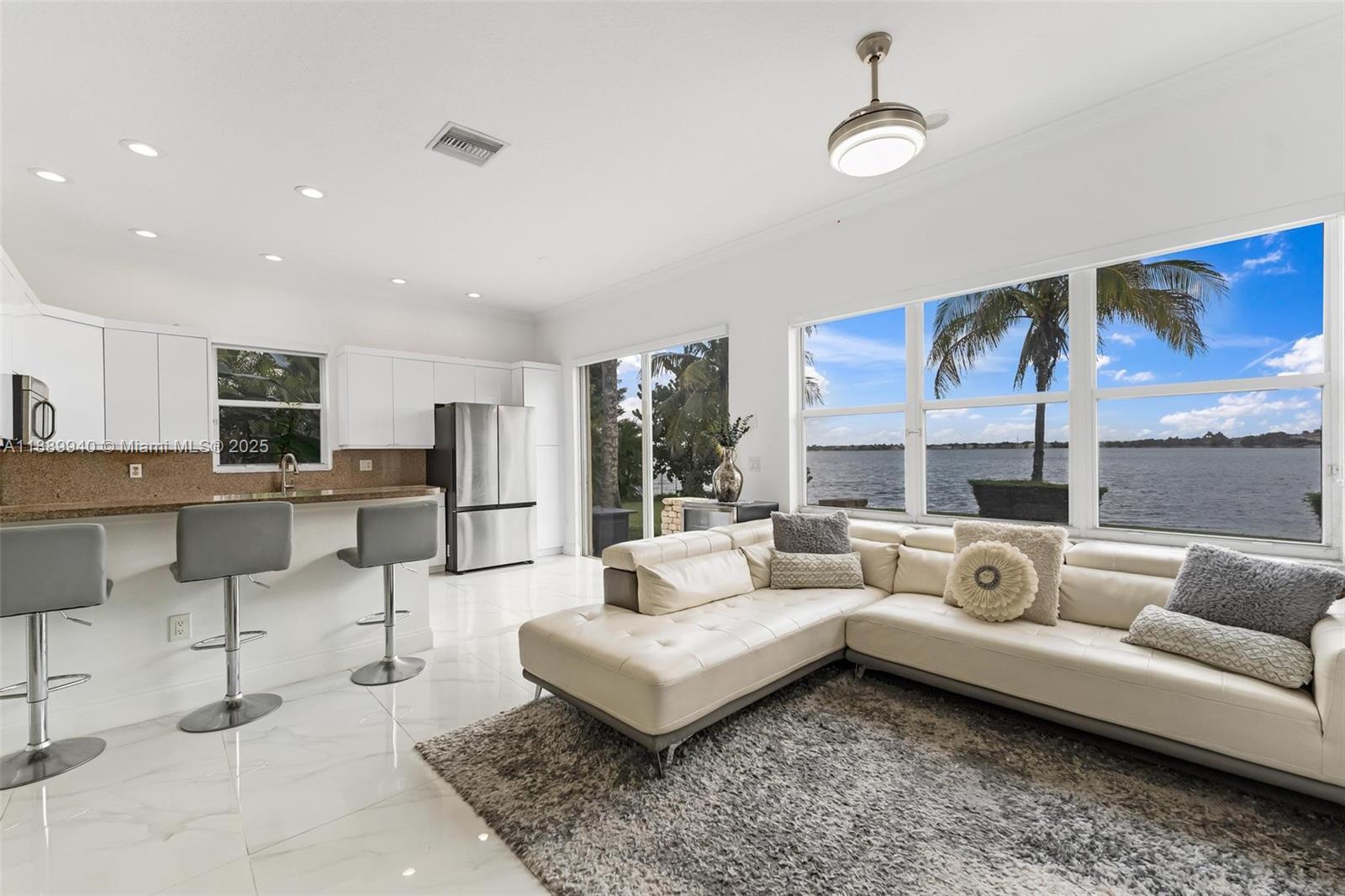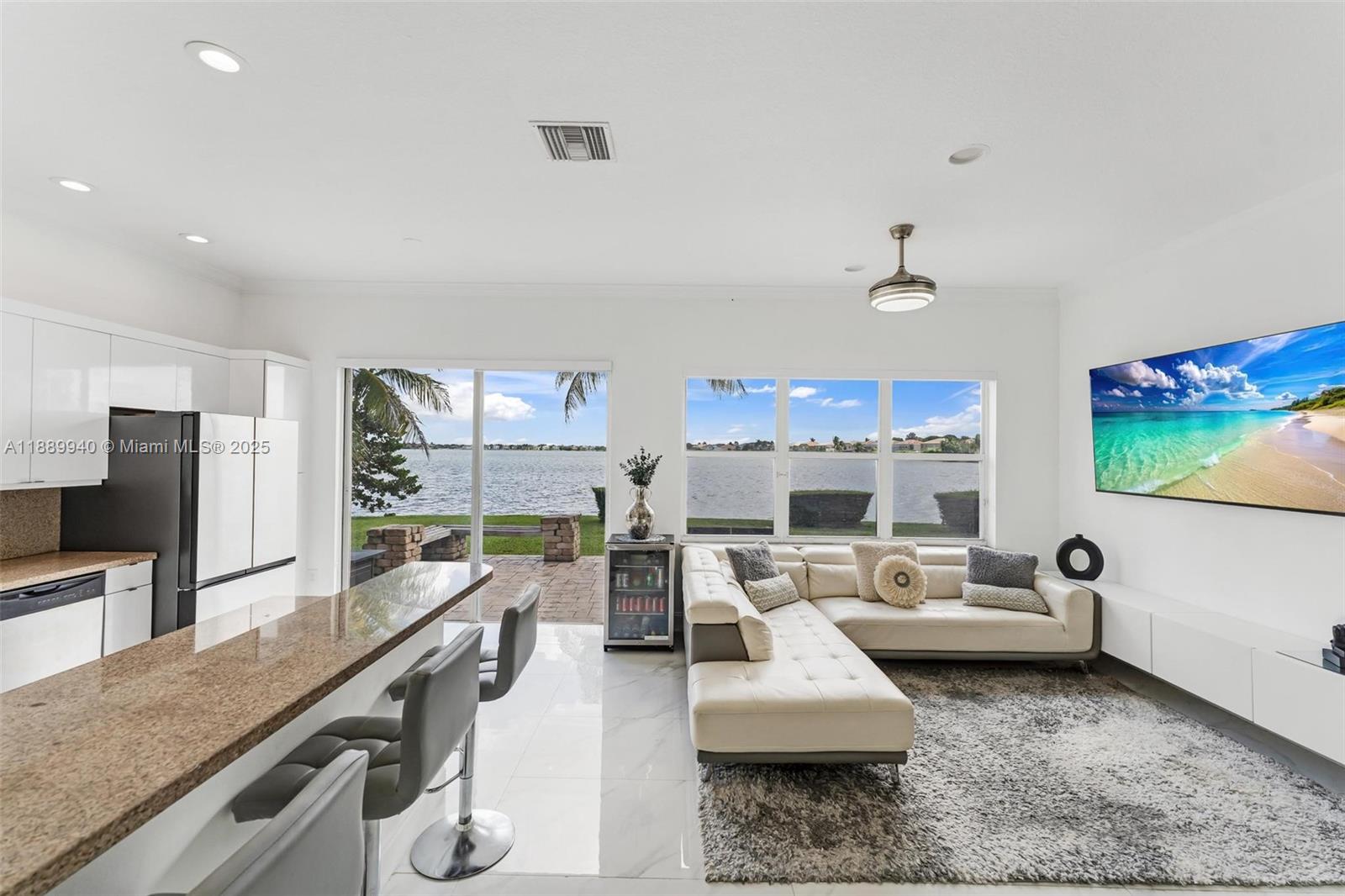 Welcome to this stunning, 3-bed, 2-bath residence on an oversized lot in the prestigious, gated community of Riviera Isles. Tucked away on a cul-de-sac, this home offers privacy, elegance, and panoramic lake views. Includes a den perfect for a home office, guest suite or turn into a 4th bedroom. The spacious, fully fenced backyard with 133 linear feet of lake frontage offers ample room for a pool, outdoor kitchen, or even a cabana house.