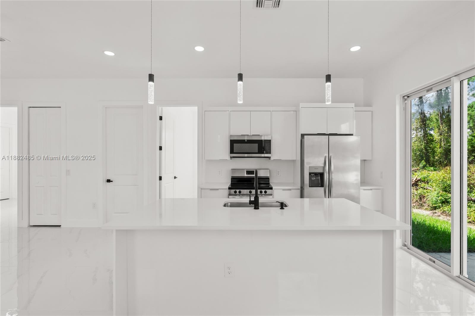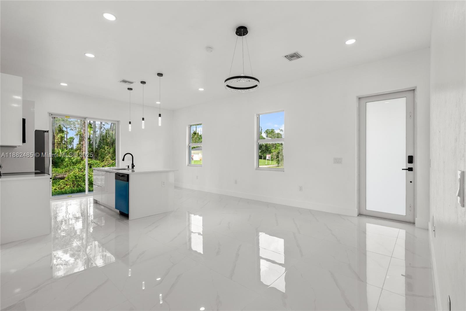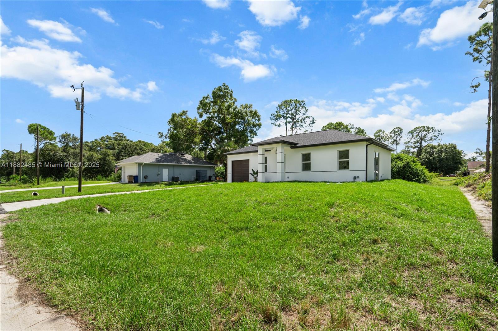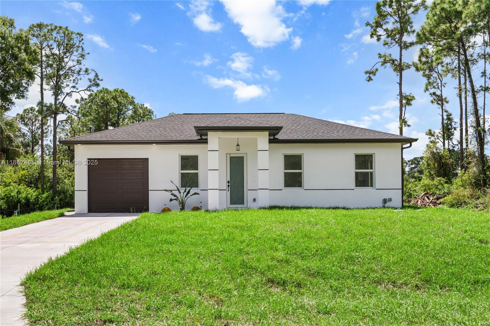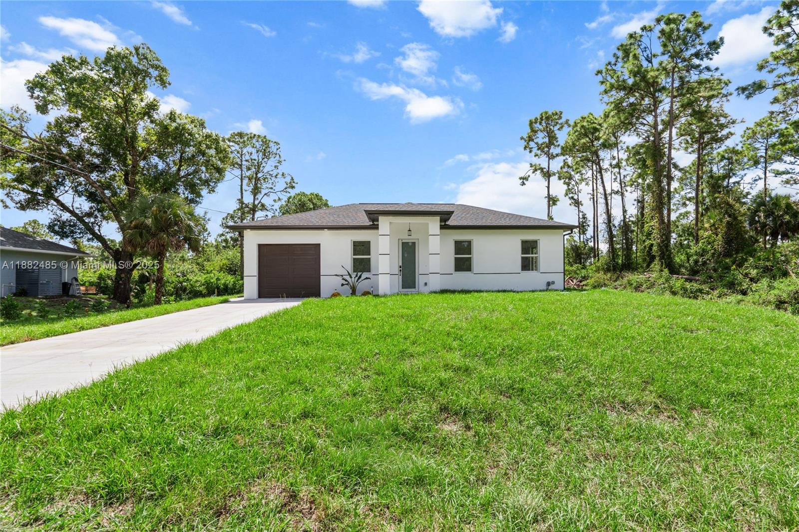 Come and visit this new construction in Lehigh Acres. Beautiful brand new home featuring impact windows and doors, elegant glass shower doors, modern ceiling fans with lights, and high ceiling that create a spacious and. bright atmosphere. The kitchen boats quartz countertops, sleek cabinetry, and a stylish open layout perfect for entertaining family and friends. Seller is offering $10,000 contribution towards closing costs. Don't miss this opportunity to own a move in ready new construction in a growing community.