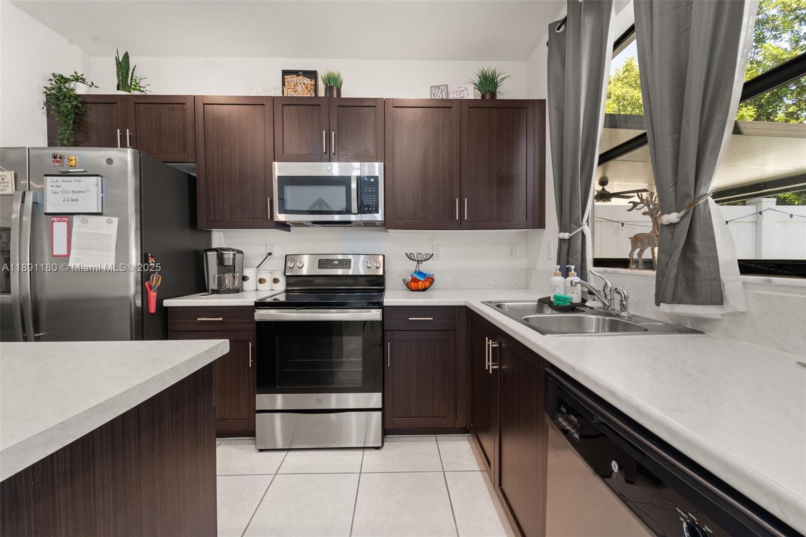 Stunning 3-bed, 3-bath townhouse in the desirable gated community of Aquabella, Hialeah! This home features a bedroom and bath on the first floor, an open-concept layout with a spacious kitchen, upgraded wood cabinets, stainless steel appliances, and pantry. Tile flooring downstairs and elegant laminated floors upstairs. The large primary suite offers a walk-in closet and private en-suite bath. Enjoy a landscaped patio perfect for entertaining. Resort-style amenities include 2 clubhouses, pools, gym, playground, and green spaces. Conveniently located near major highways and top schools. Property is currently rented through March 2026—great investment opportunity! HOA requires at least one applicant with a 680+ credit score. Sellers offer a $2k credit towards closing costs to the buyers!!