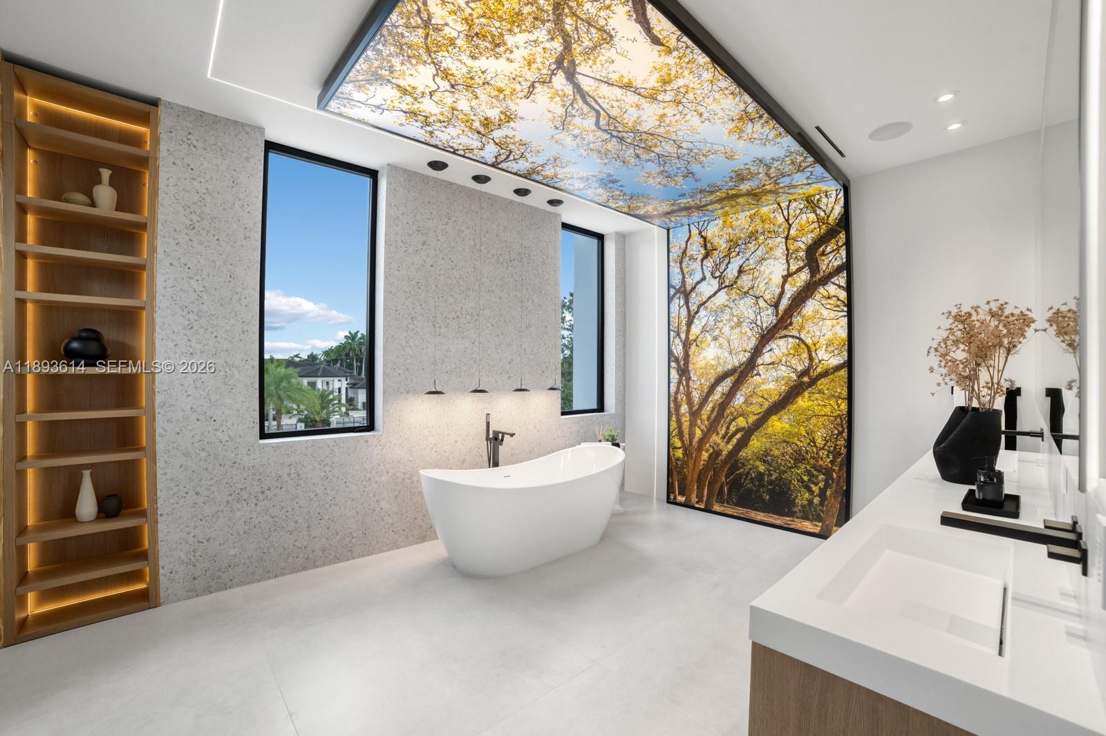 A statement of modern architecture & artistry, this 2025 estate reimagines luxury living on over an acre of resort-caliber grounds. Spanning 12,000+ sq ft, including a 1,000 sq ft guest home, every inch reflects uncompromising design & craftsmanship. Soaring 28 ft ceilings, custom murals, a floating glass staircase, private elevator, & showpiece fireplace define its elegance & scale. The chef’s kitchen, Lutron automation, & full smart-home integration blend innovation with comfort. 14 ft high garage bays fit multiple lifts. The primary wing unveils a private terrace & custom closets. Outdoors rival a five-star resort with a full summer kitchen, covered pavilions, poolside lounge, & expansive grounds ideal for courts or gardens. A true jewel—extraordinary, extravagant, & undeniably refined.