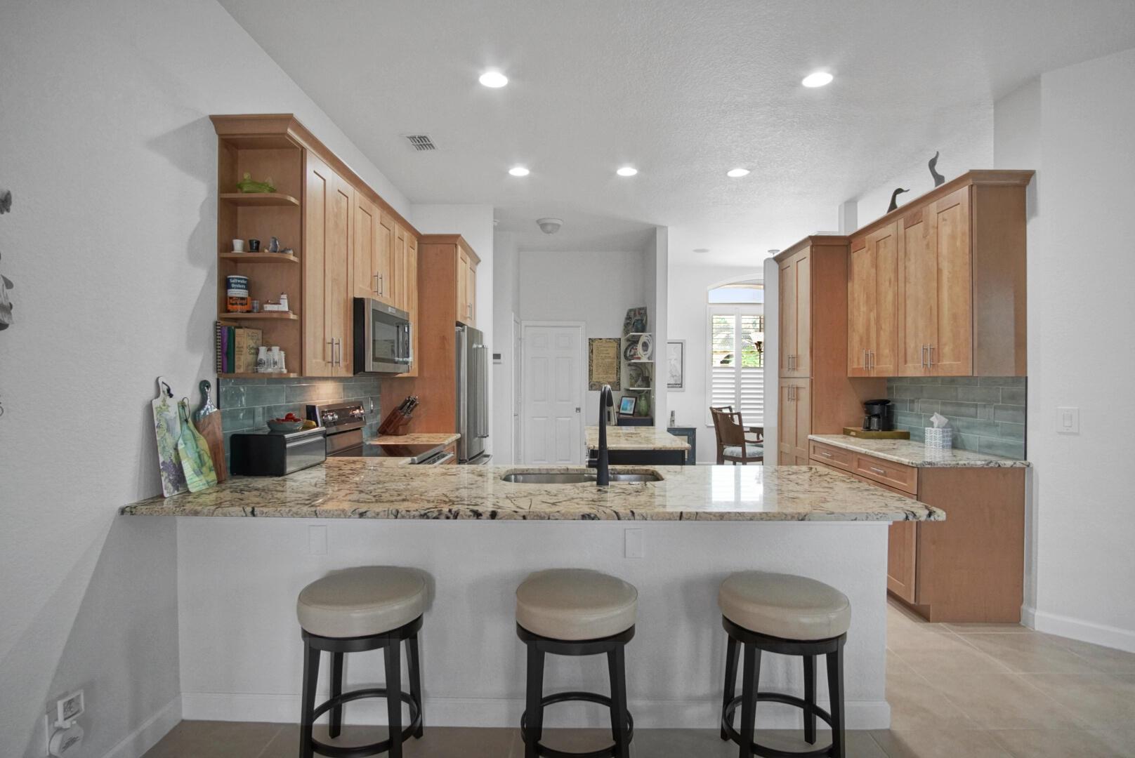 Fantastic 4/3/3 pool home located on an estate lot. Beautifully upgraded and meticulously maintained this home will not disappoint. Spacious living area with both a family room and formal living area. The custom kitchen has stainless steel appliances a large island and beautiful granite countertops. Two of the guest bedrooms are ensuite perfect for guests. Screened in saltwater, heated pool with covered Lani and cabana bathroom, a perfect place for entertaining. Expansive 3 car garage with epoxy floor. Impact windows with plantation shutters throughout. The home overlooks a canal for extra privacy. This home has many upgrades and is a must see. Come enjoy country club living in the beautiful Meadowood community.