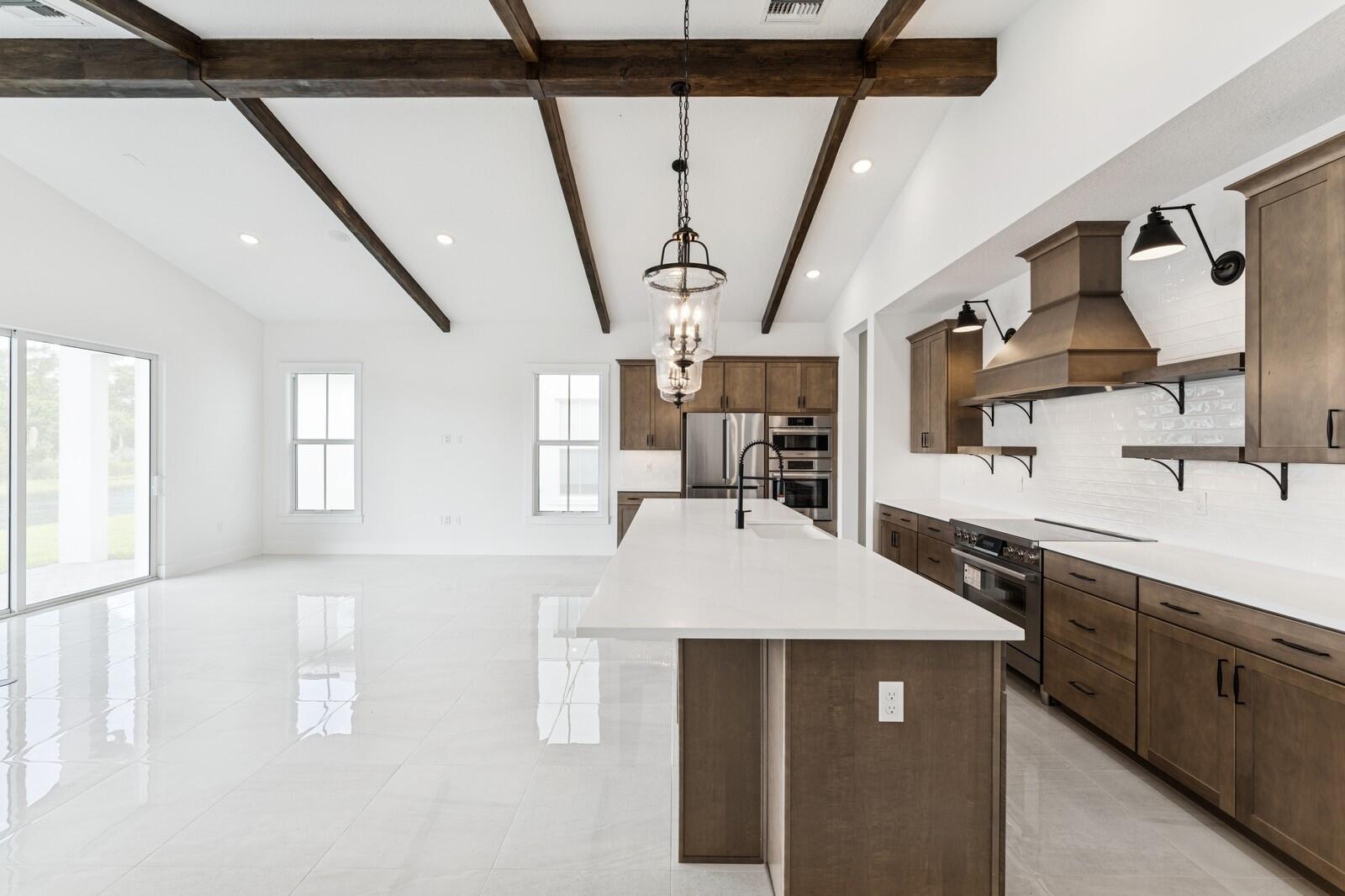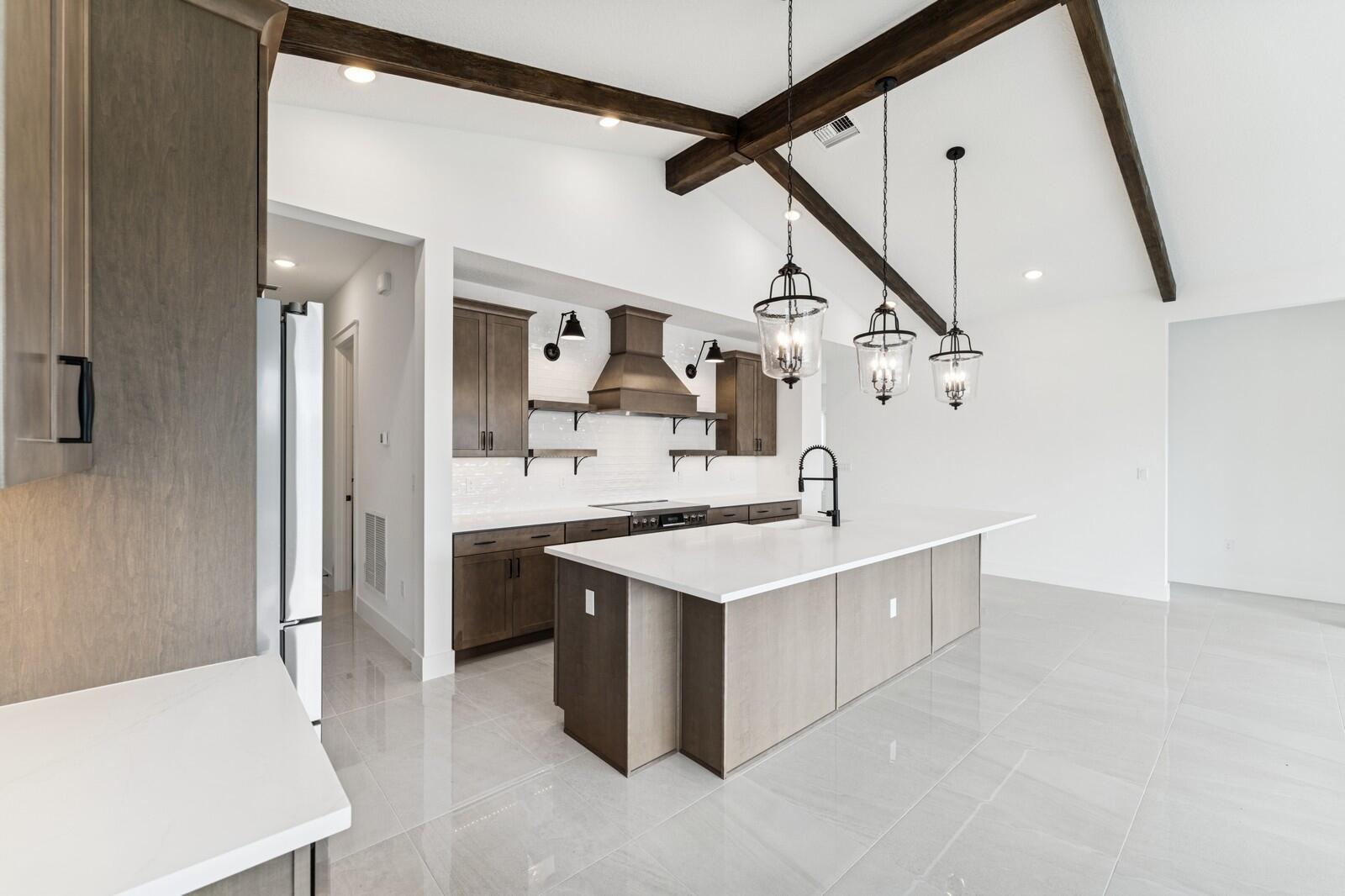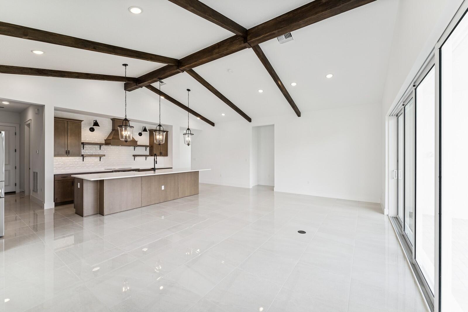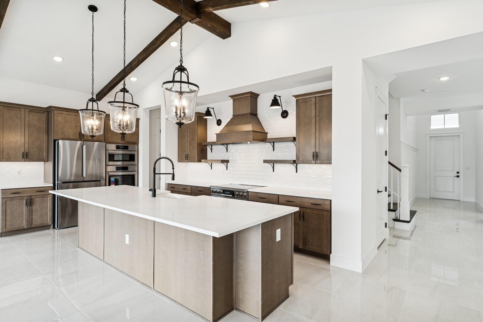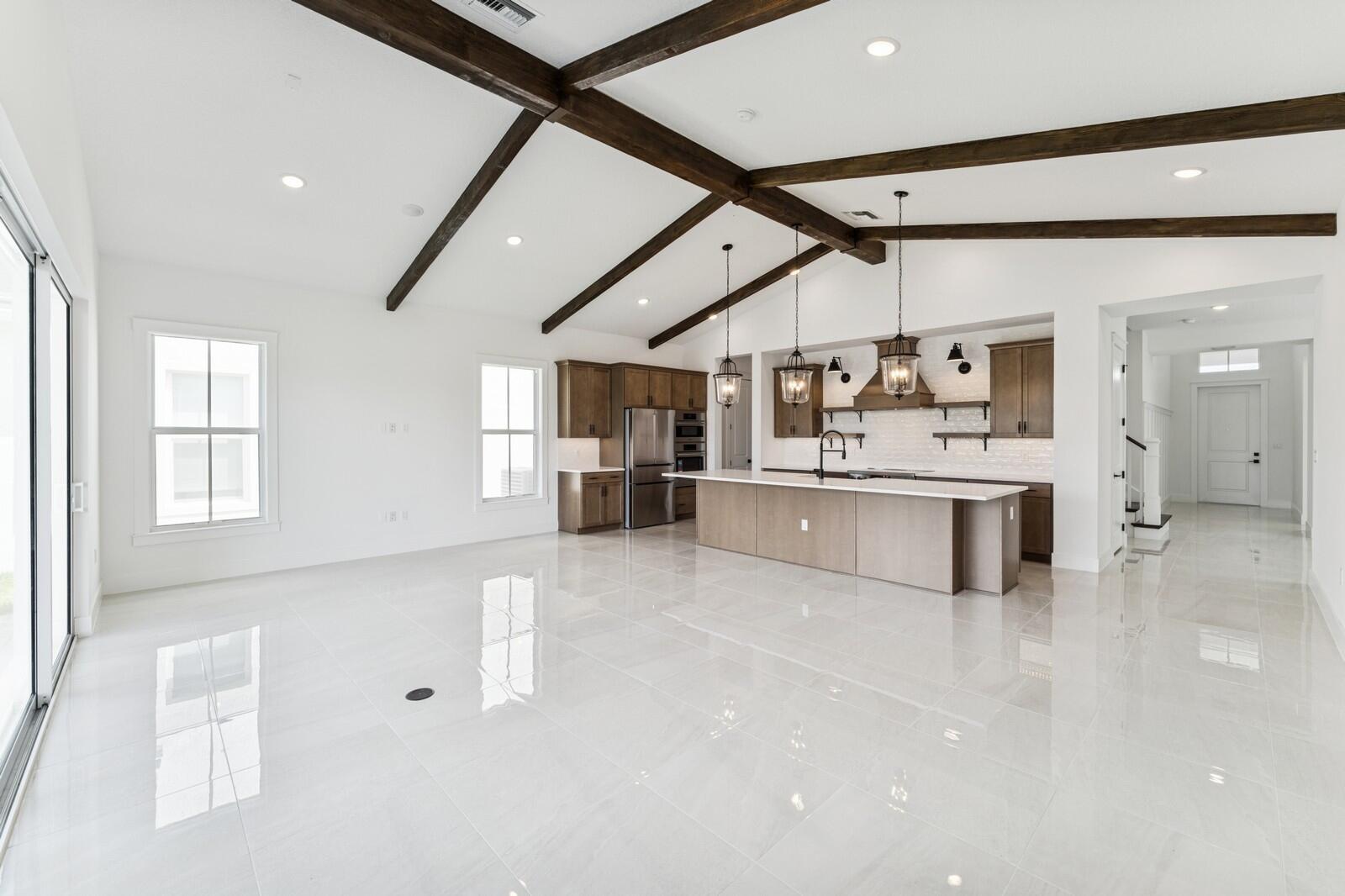 Lake views and farmhouse charm define this stunning Santa Fe home. The kitchen showcases Winstead Birch Quill cabinetry, a vast center island, and elegant Calacatta Abezzo quartz countertops. Open-concept living spaces feature a vaulted ceiling with stained beams, creating a warm and inviting atmosphere. A formal dining room offers the perfect setting for special celebrations, while the serene primary suite includes a stylish ceiling treatment and a polished bath with a barn door and freestanding tub. The organized home office is ideal for remote work, and the versatile covered patio with a 16' multi-slide door provides the perfect spot to unwind and take in the tranquil scenery.