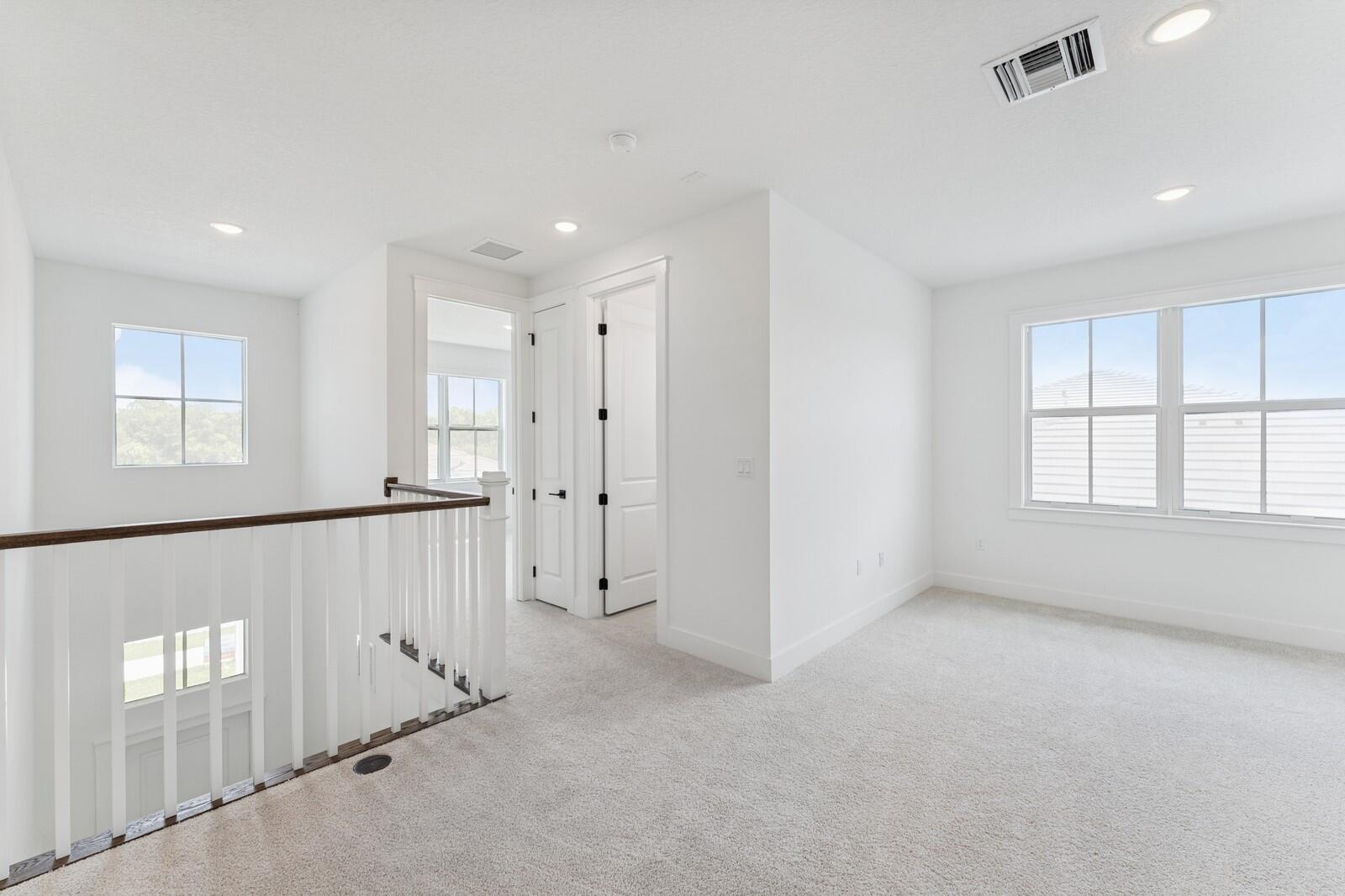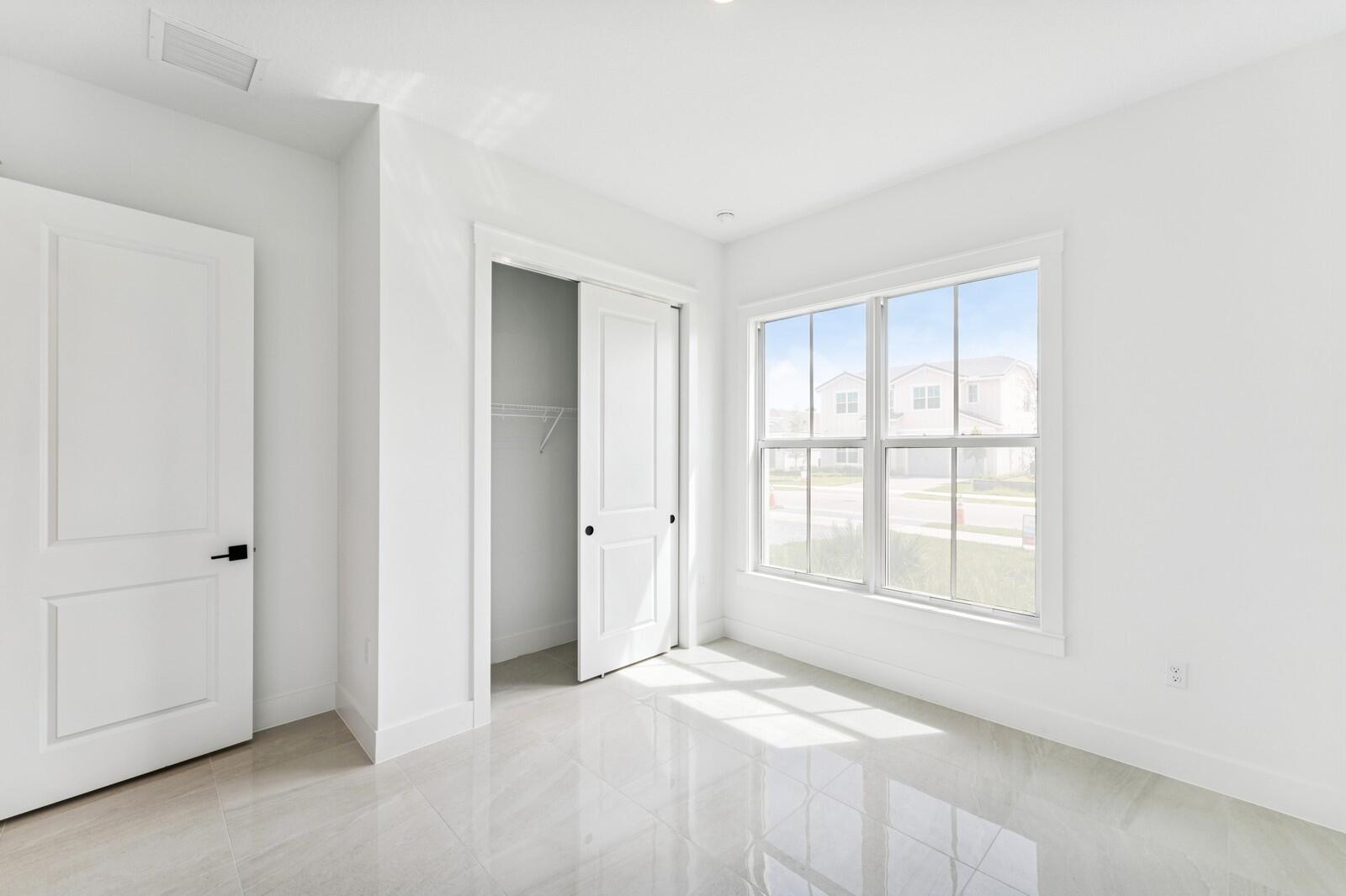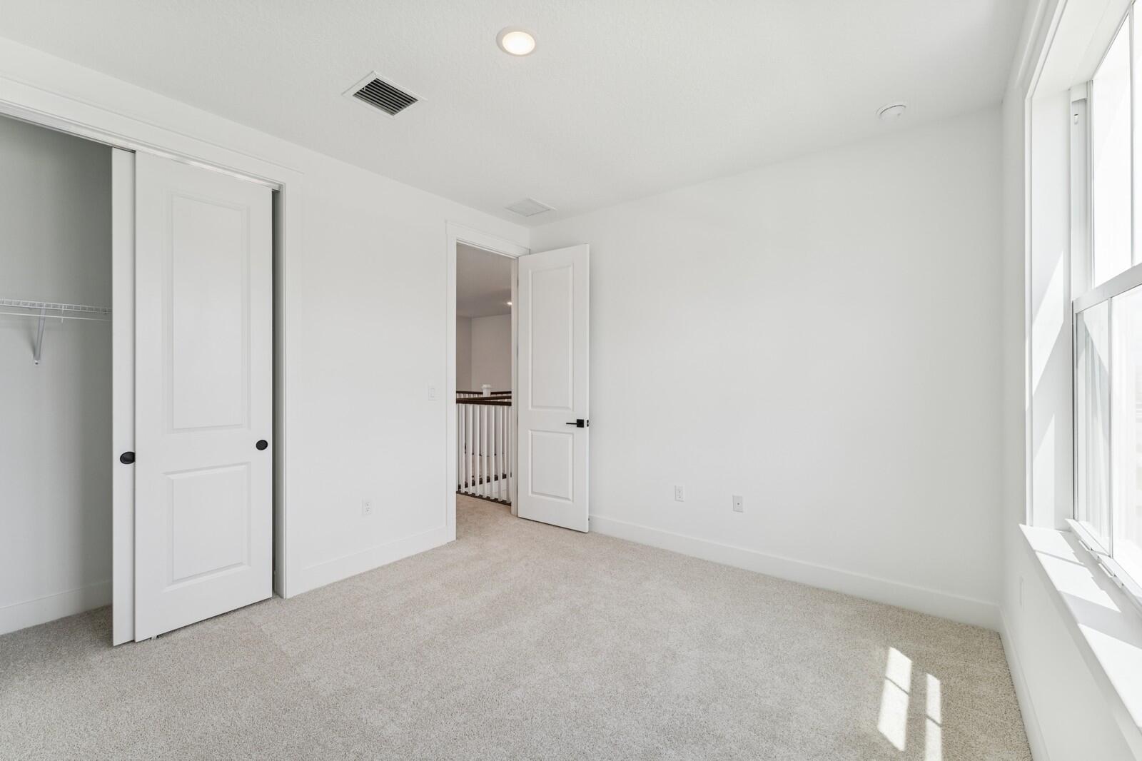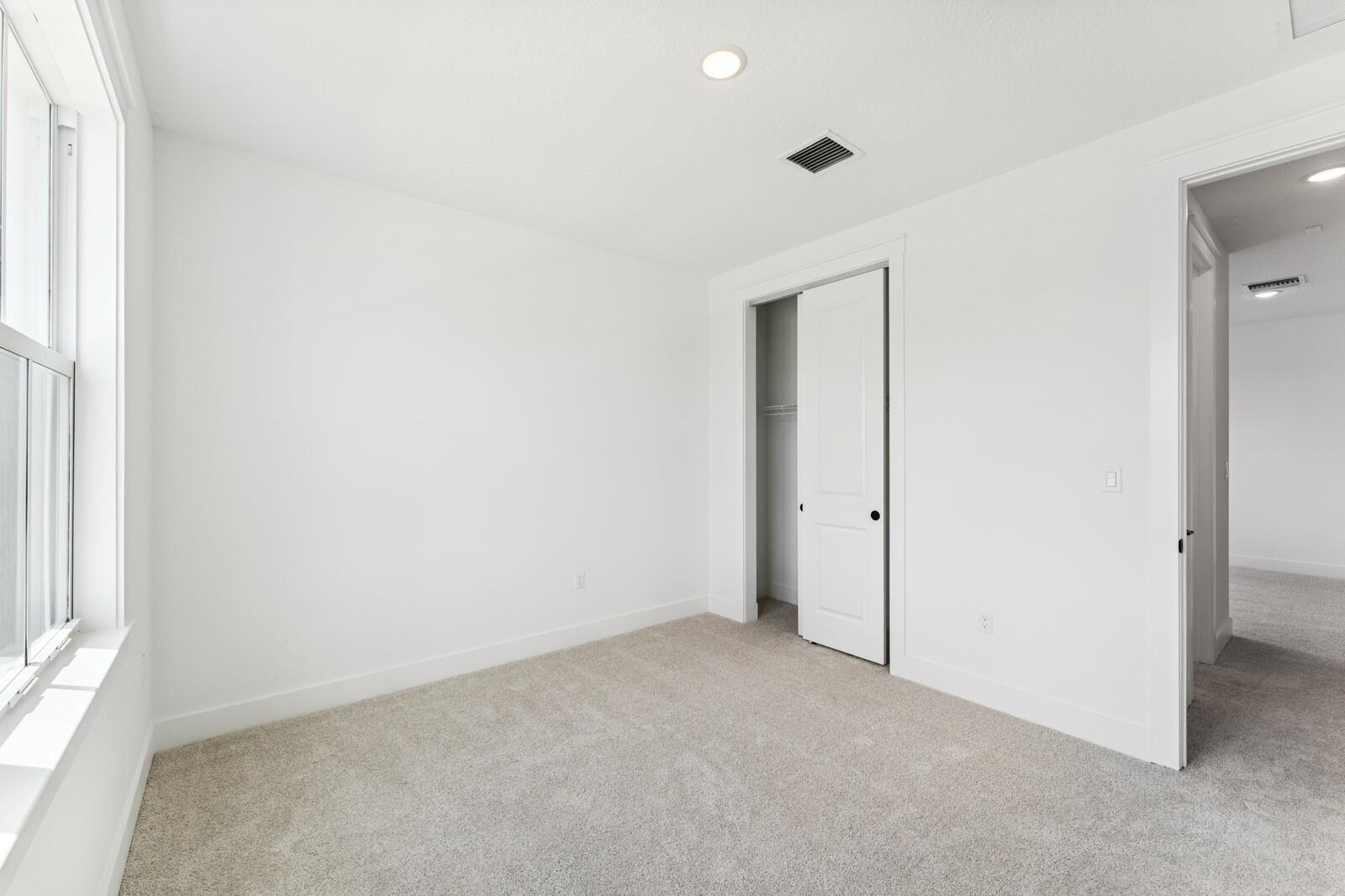 Lake views and farmhouse charm define this stunning Santa Fe home. The kitchen showcases Winstead Birch Quill cabinetry, a vast center island, and elegant Calacatta Abezzo quartz countertops. Open-concept living spaces feature a vaulted ceiling with stained beams, creating a warm and inviting atmosphere. A formal dining room offers the perfect setting for special celebrations, while the serene primary suite includes a stylish ceiling treatment and a polished bath with a barn door and freestanding tub. The organized home office is ideal for remote work, and the versatile covered patio with a 16' multi-slide door provides the perfect spot to unwind and take in the tranquil scenery.