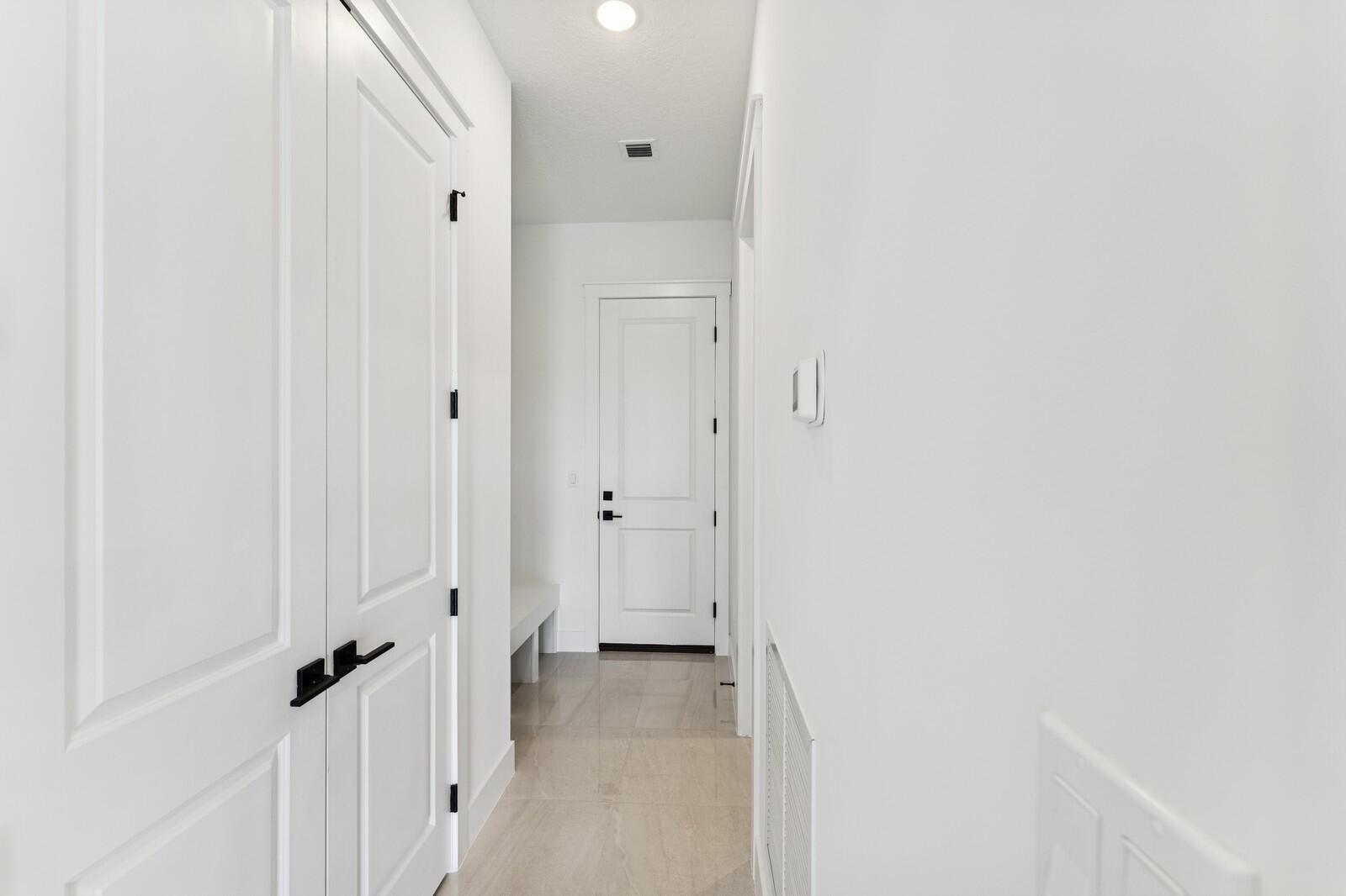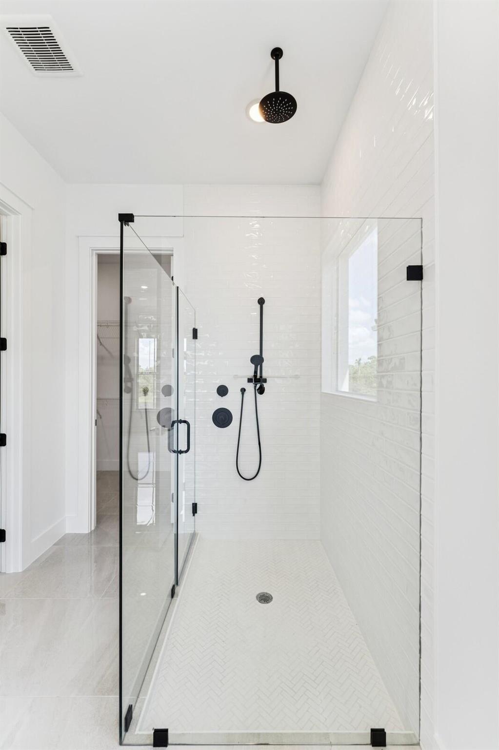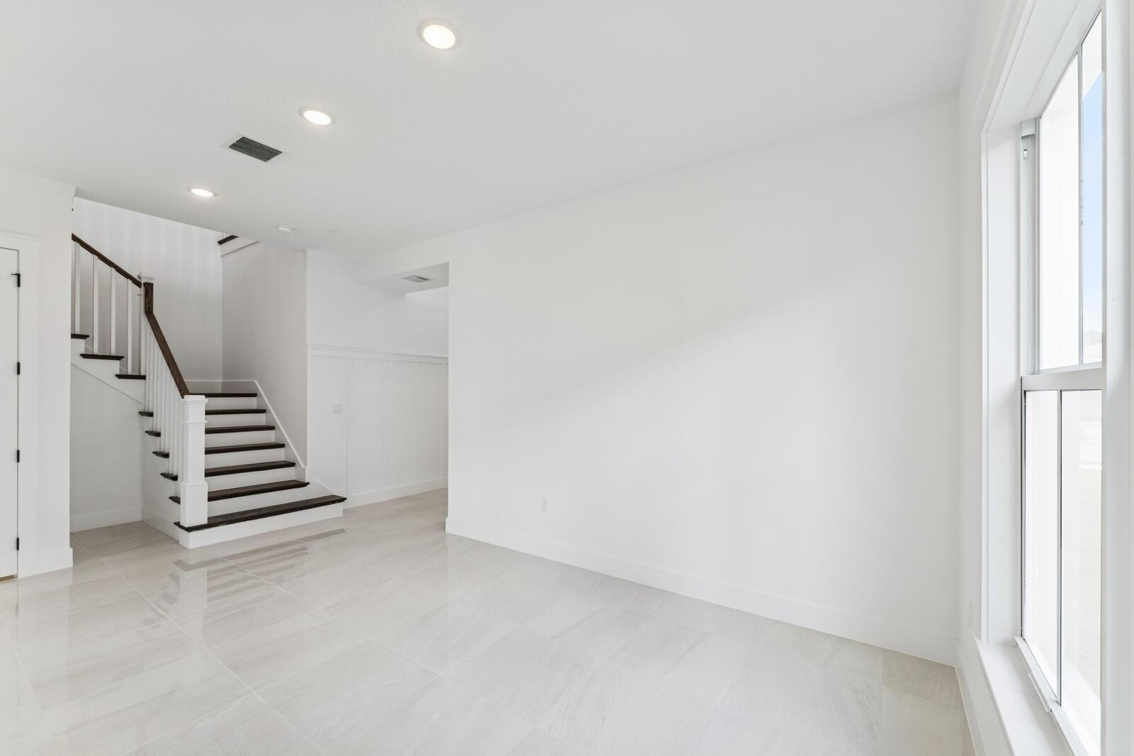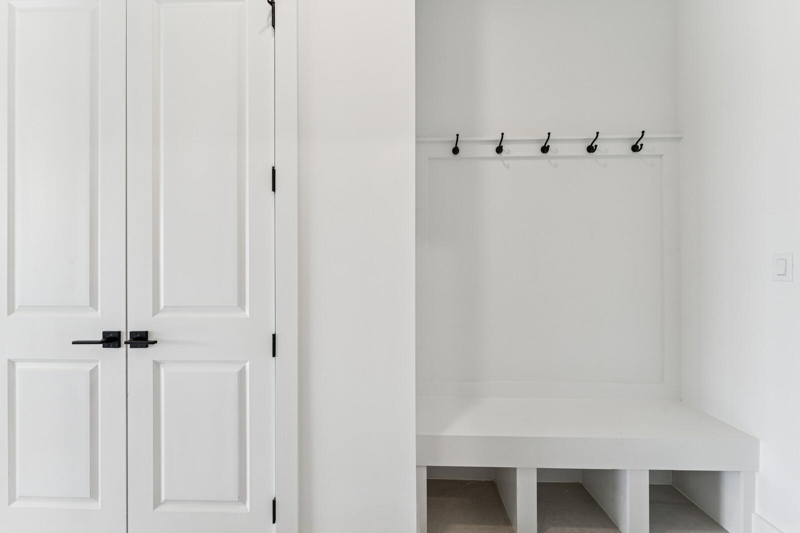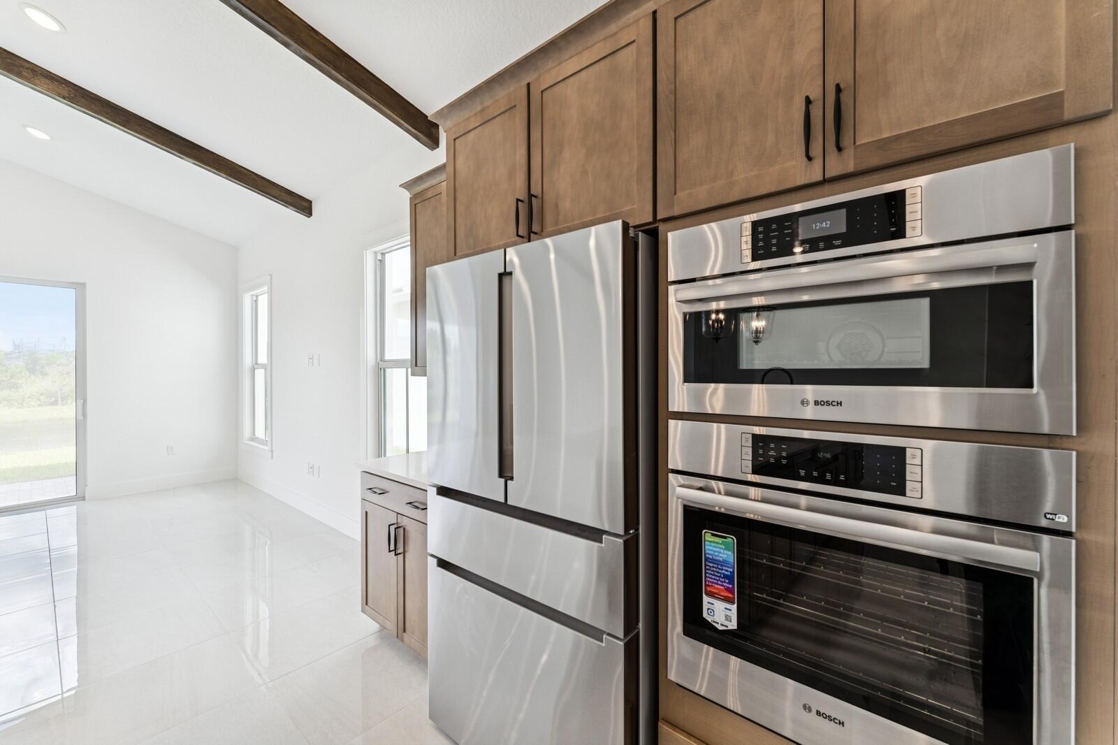 Lake views and farmhouse charm define this stunning Santa Fe home. The kitchen showcases Winstead Birch Quill cabinetry, a vast center island, and elegant Calacatta Abezzo quartz countertops. Open-concept living spaces feature a vaulted ceiling with stained beams, creating a warm and inviting atmosphere. A formal dining room offers the perfect setting for special celebrations, while the serene primary suite includes a stylish ceiling treatment and a polished bath with a barn door and freestanding tub. The organized home office is ideal for remote work, and the versatile covered patio with a 16' multi-slide door provides the perfect spot to unwind and take in the tranquil scenery.