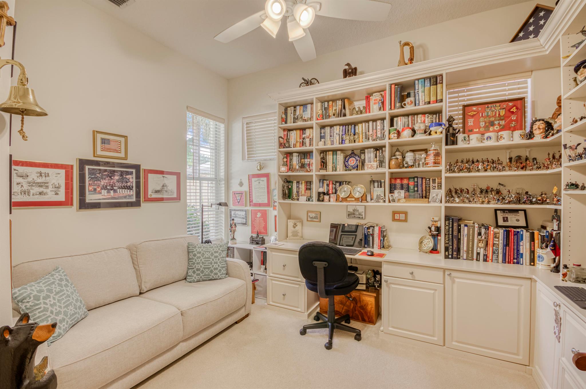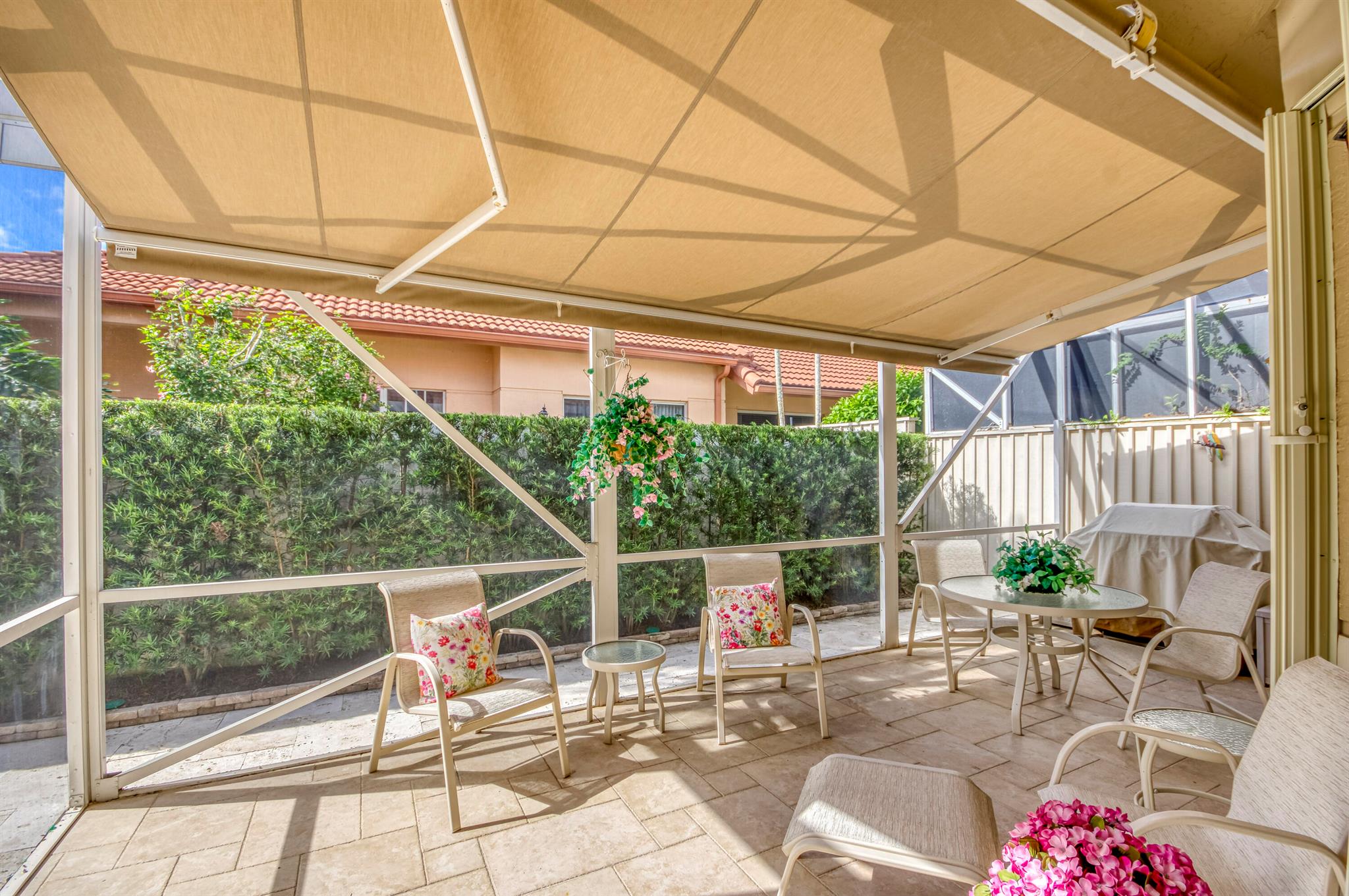 This bright and airy one-story CBS townhouse offers 3 bedrooms and 2 bathrooms within 1,620 sq ft of living space in the desirable Monterey Pointe subdivision of PGA National, Palm Beach Gardens. A soft neutral palette and light stone-look tile flow throughout the home, creating a welcoming and seamless ambiance. The spacious living room provides ample seating and entertainment space, enhanced by three plantation-shuttered windows and recessed lighting. Adjacent, the cozy dining room is bathed in natural light from a large skylight, ideal for intimate dinners or gatherings. The kitchen features ivory wood cabinetry with coordinating granite countertops and backsplash, a stainless-steel appliance package including a gas range, and an island snack bar with additional seating.