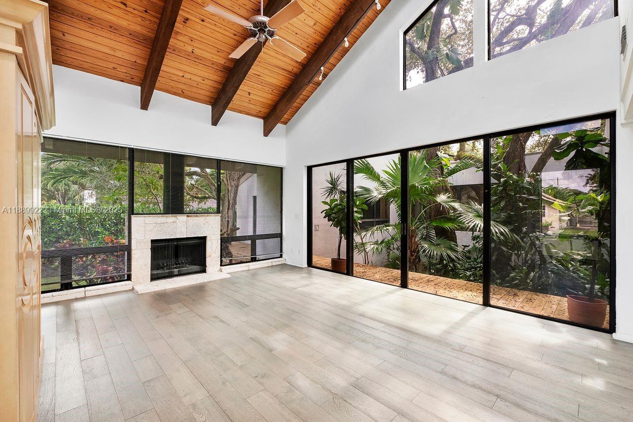 Mid-century modern 4BR/3BA + loft residence in Palmetto Bay, designed by architect Marc Firestone. Encompassing 4,362 total SF, this canal-front gem sits on a quiet cul-de-sac surrounded by majestic oaks and lush landscaping. The home embraces indoor-outdoor living with a central atrium. Vaulted wood-beamed ceilings, walls of glass, and natural light define the open spaces. A spiral staircase leads to a loft overlooking the family room with fireplace and bar. The kitchen opens to a covered screened terrace and patio with heated pool ideal for entertaining. Features include new plank flooring, 2024 metal roof, ample parking, and a private concrete boat launch.