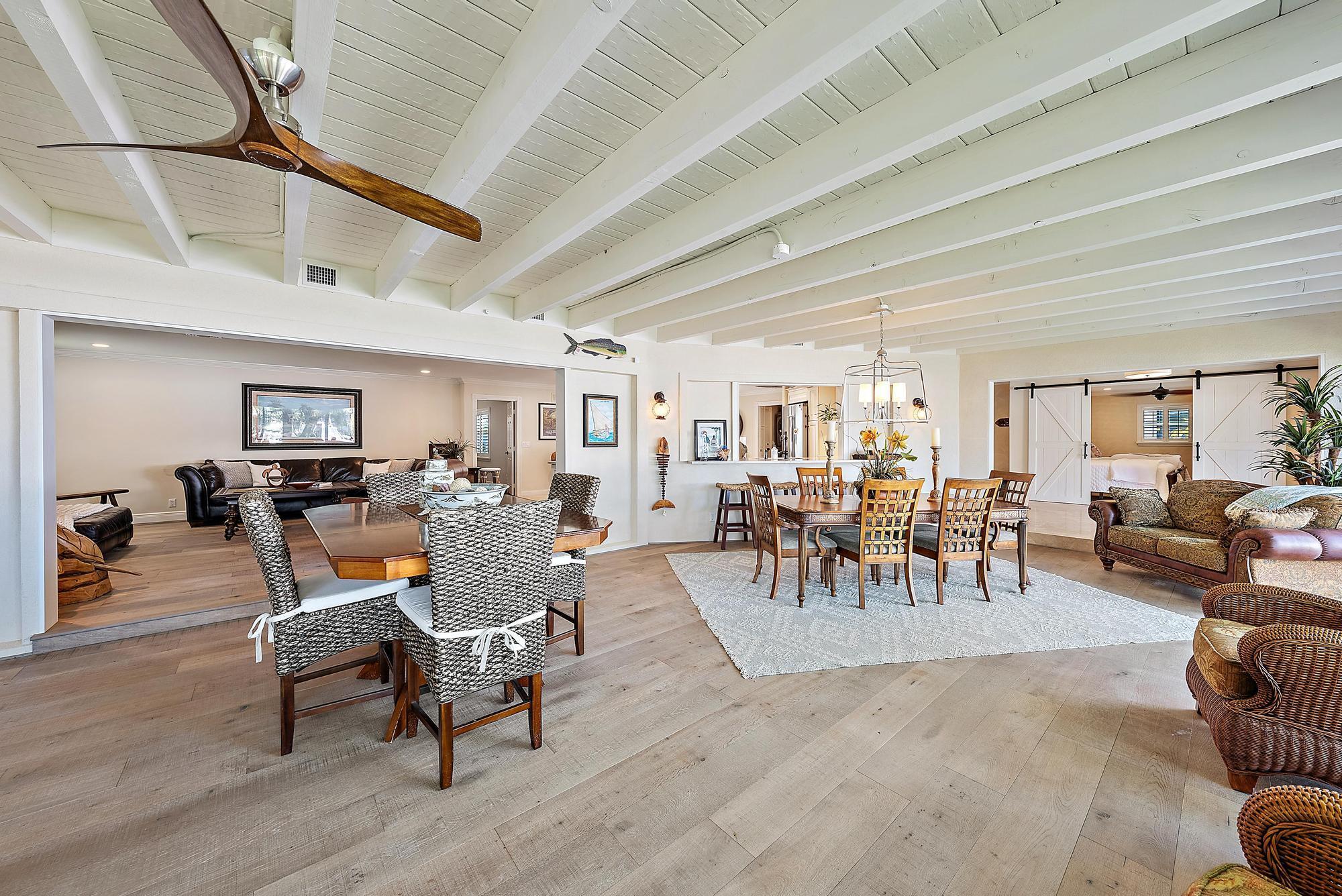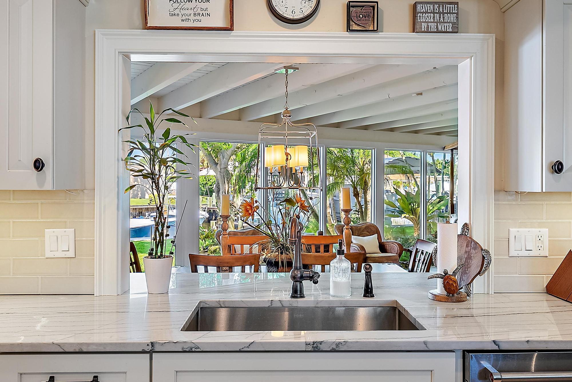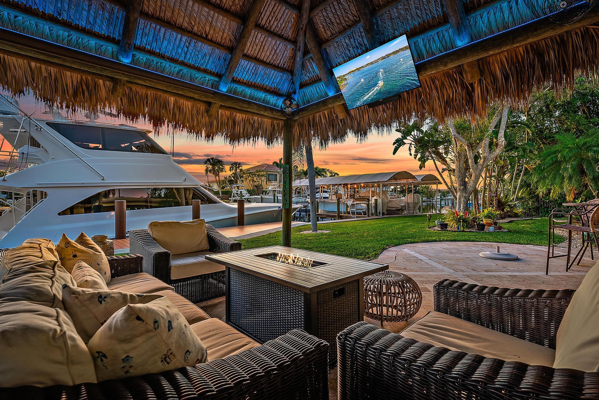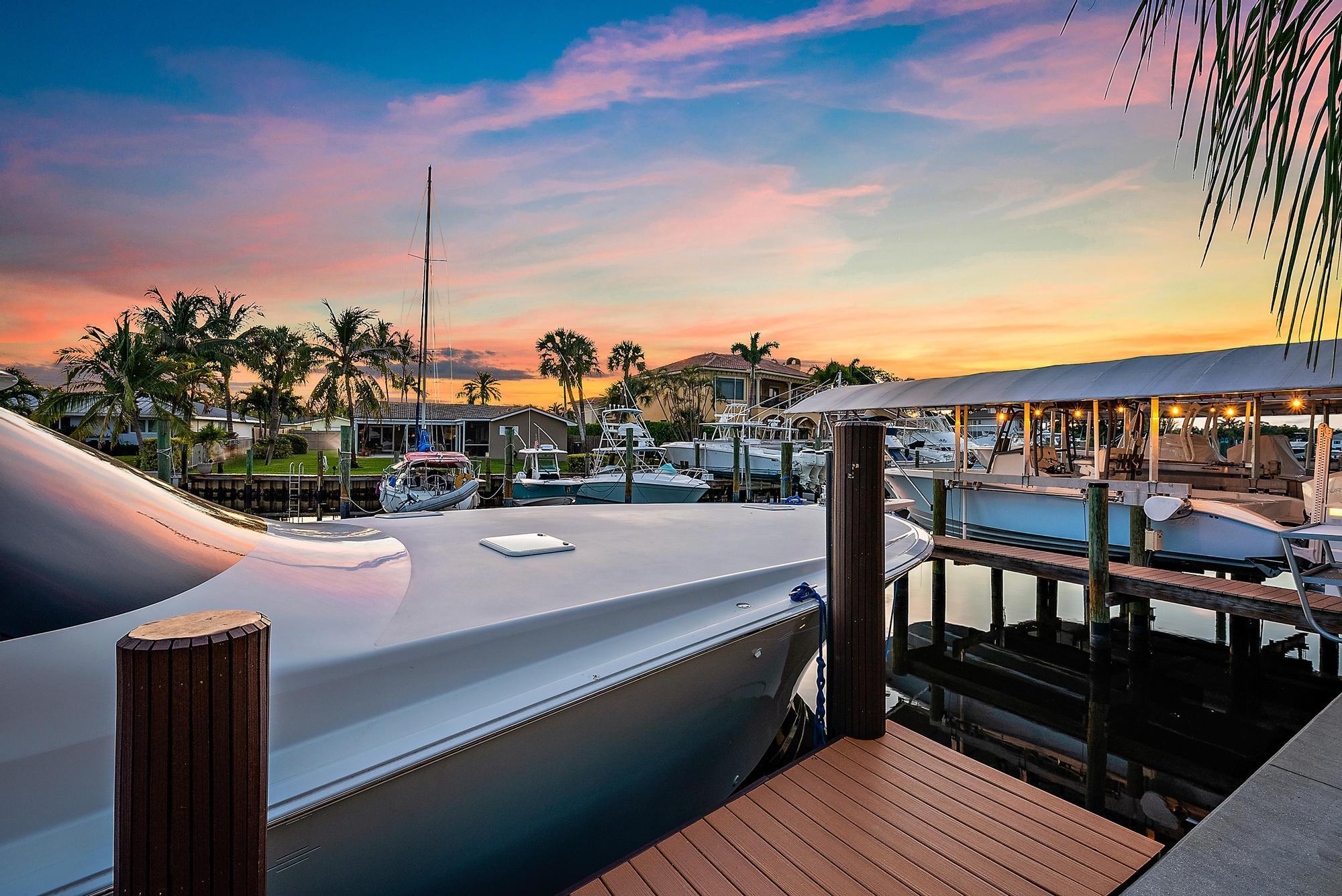 A boater's paradise - over 100 feet of deep-water frontage with no fixed bridges and direct ocean access. Dock currently configured for a 61' Viking plus two 30' sport boats on lifts. Located in Paradise Point, an unincorporated area of Palm Beach Gardens with lower taxes and no HOA. This Bermuda-style home on a one-third acre lot has been thoughtfully updated with a new kitchen, newer roof, and impact windows throughout. The open, light-filled floorplan includes two bedrooms, two baths, and a flex room currently used as a third bedroom. Outdoors, enjoy spectacular sunset views and a new tiki hut - perfect for entertaining and relaxed Florida living.