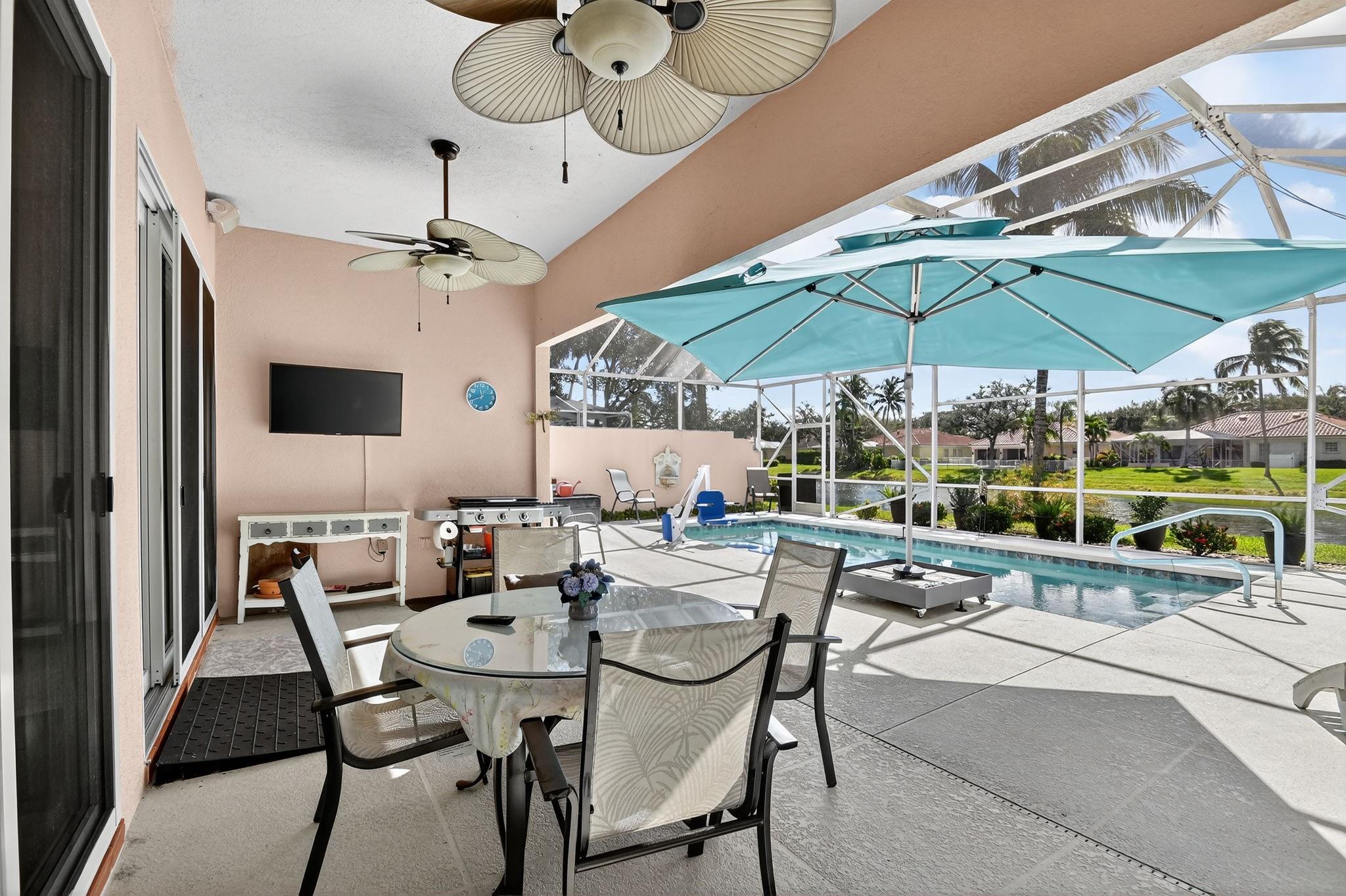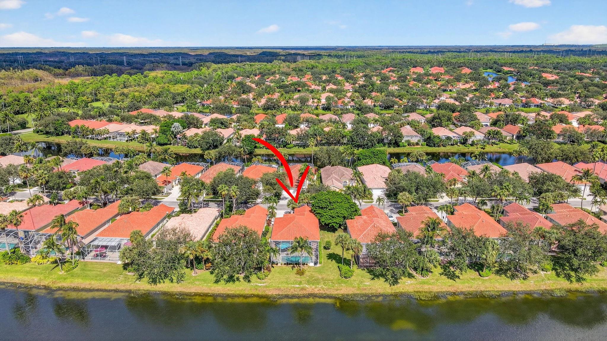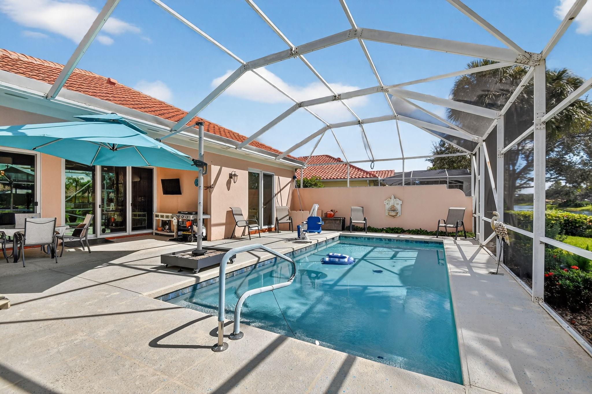 Welcome to Riverwalk! This Oakmont checks every box; Roof (2021), all Impact sliders (2022), Private Heated Saltwater Pool, Waterfront home, huge screened in patio & professional landscaping. Your new home has 3 bedrooms & office/den which could be a 4th bedroom should you desire. From the entry, walk in to 12 ft. ceilings, adorned w/crown moulding & recessed lighting throughout. 18 ft of impact glass doors for a clear lake & pool view. The two sets of triple pocket sliding doors create a true indoor/outdoor living space right in your home. Riverwalk offers a luxury lifestyle without the membership price. Offers Fitness Center, Tennis, Pickle Ball, Yoga, plethora of clubs & restaurant. Located in the heart of Palm Beach West, a short drive to beach, downtown, airport, fine dining, shops.