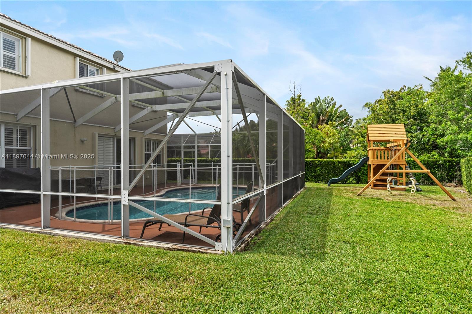 Discover the best value in Weston! Situated on a spacious pie-shaped lot, this partially updated home offers a generous backyard space, perfect for outdoor living and entertaining. The home features elegant porcelain tile throughout, providing a sleek and modern feel. Enjoy a remodeled bathroom (2022) with stylish porcelain tiles, and a kitchen that boasts granite countertops, 42” wood cabinets, and ample storage. All windows are adorned with beautiful plantation shutters, adding a touch of sophistication. The serene pool area offers a private oasis for relaxation. Located in the highly sought-after community of The Ridges, this home blends comfort, style, and convenience, with easy access to major highways and top-rated schools. All at the most affordable price in the area.