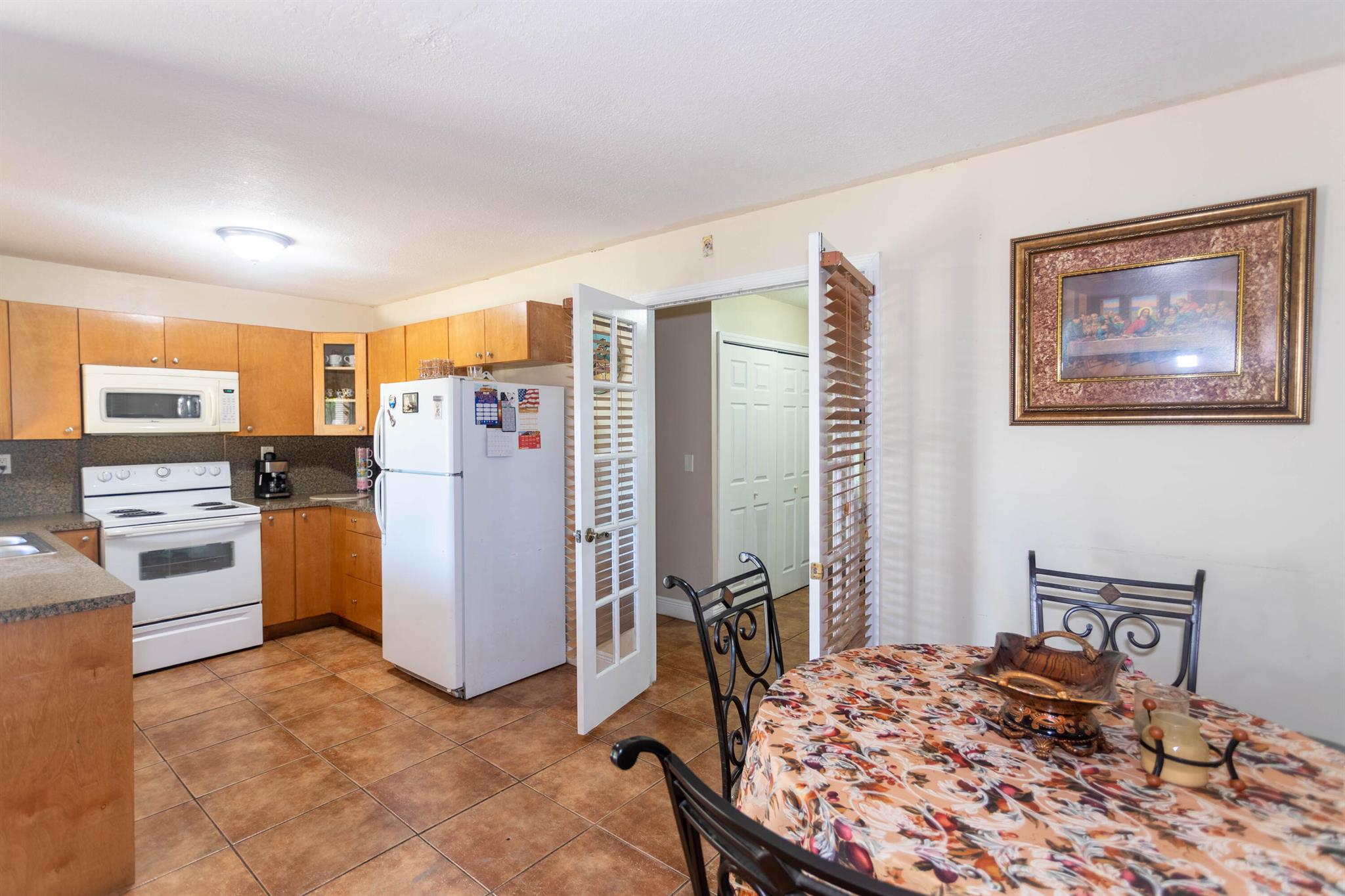:Uniquely designed for large or multigenerational living! This spacious 4-bedroom home features 2 full kitchens, 2 full bathrooms, a split layout, and a semi-converted garage for storage and added living space. French doors lead to Kitchen #1 with a dining and living area and a master suite with walk-in shower and vanity. Down the hall is Kitchen #2 with a breakfast nook and access to a stunning converted space that is utilized as an entertainment and formal dining area.