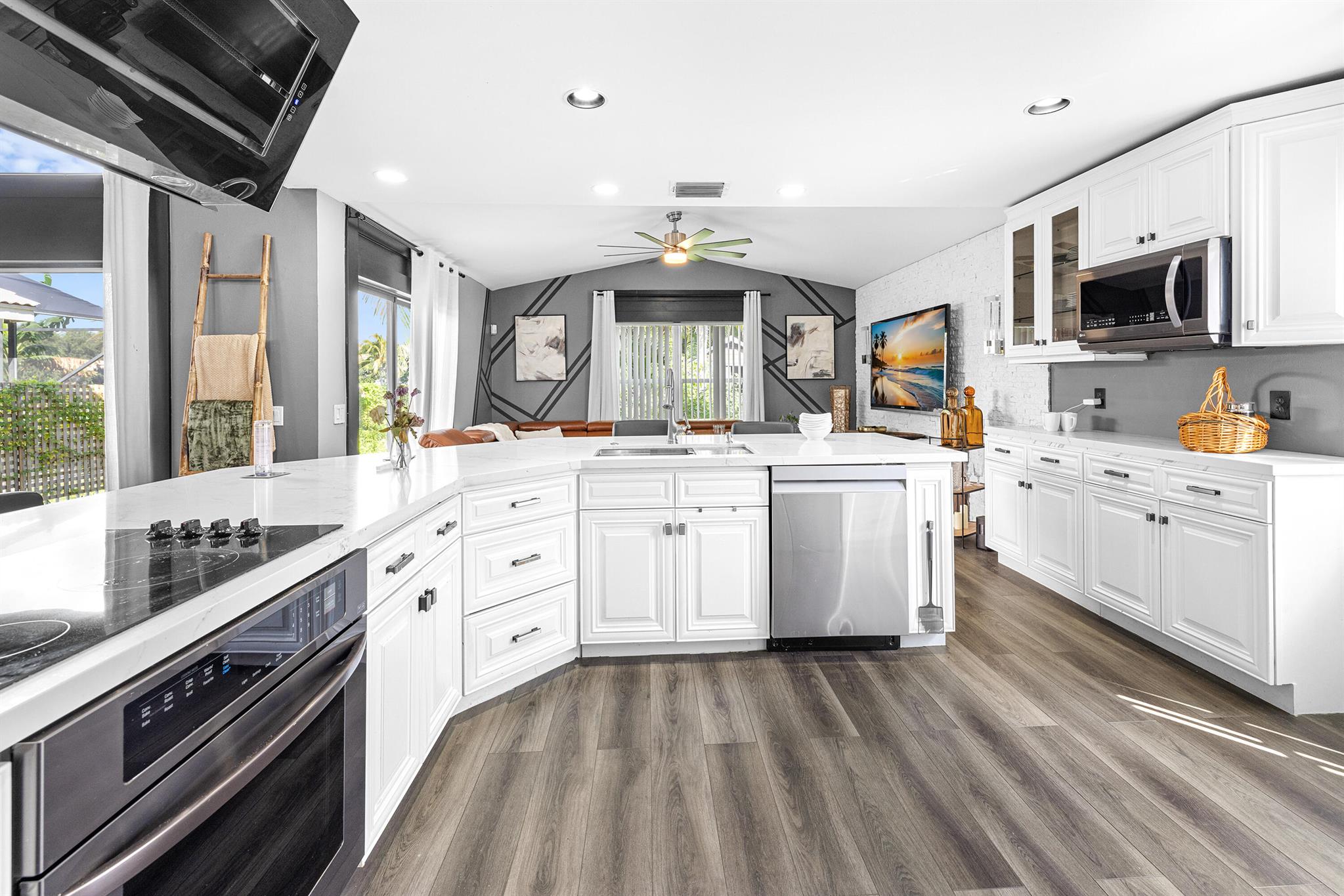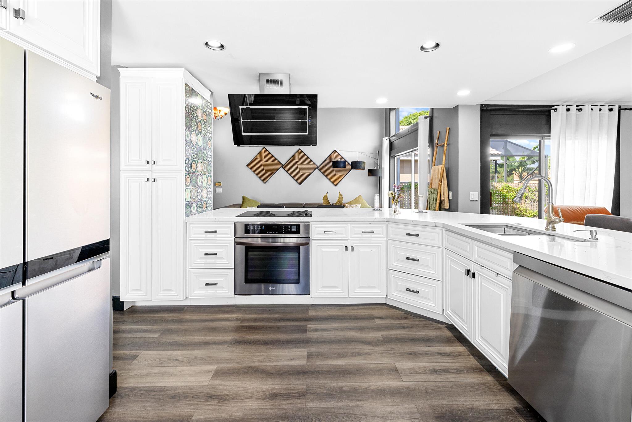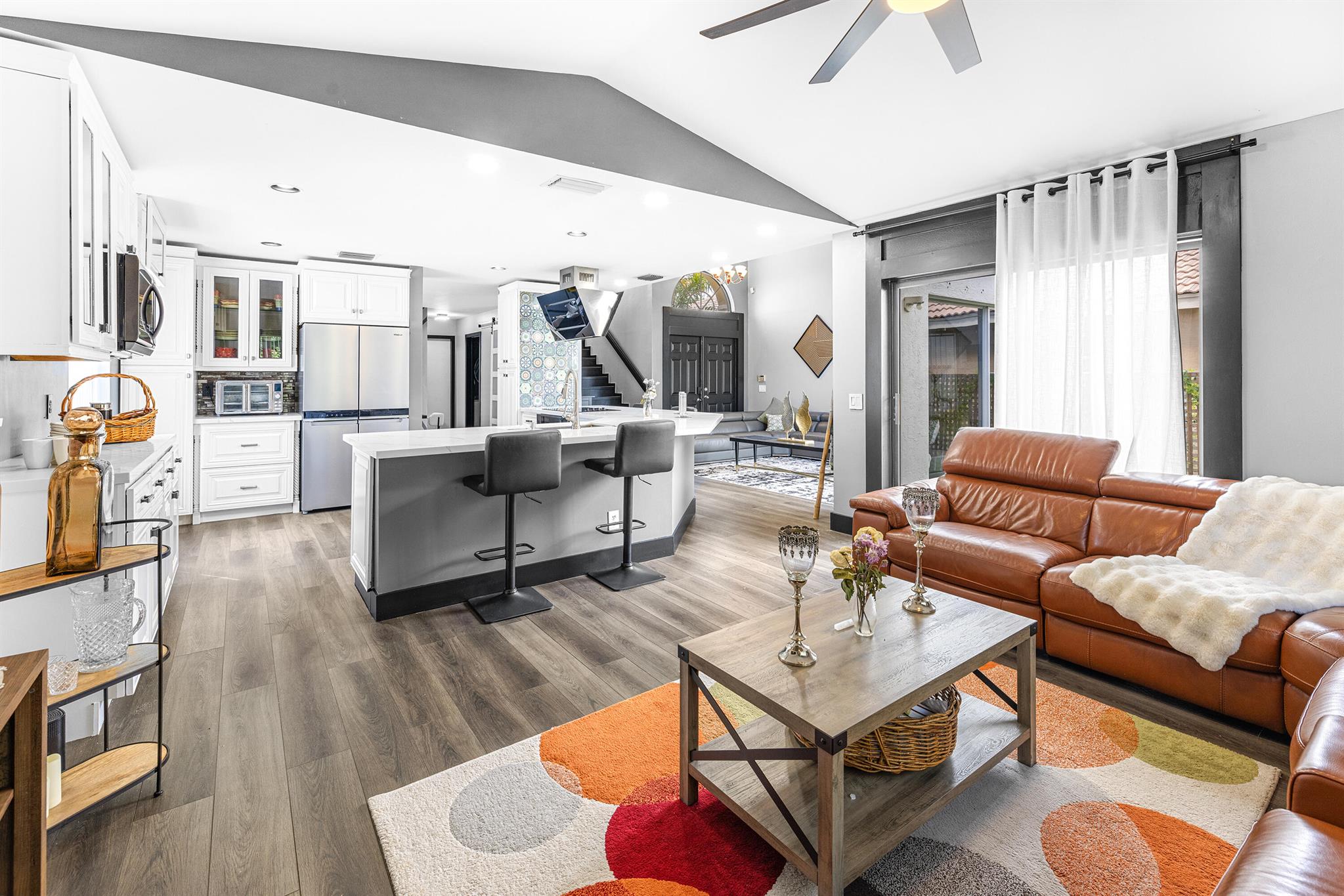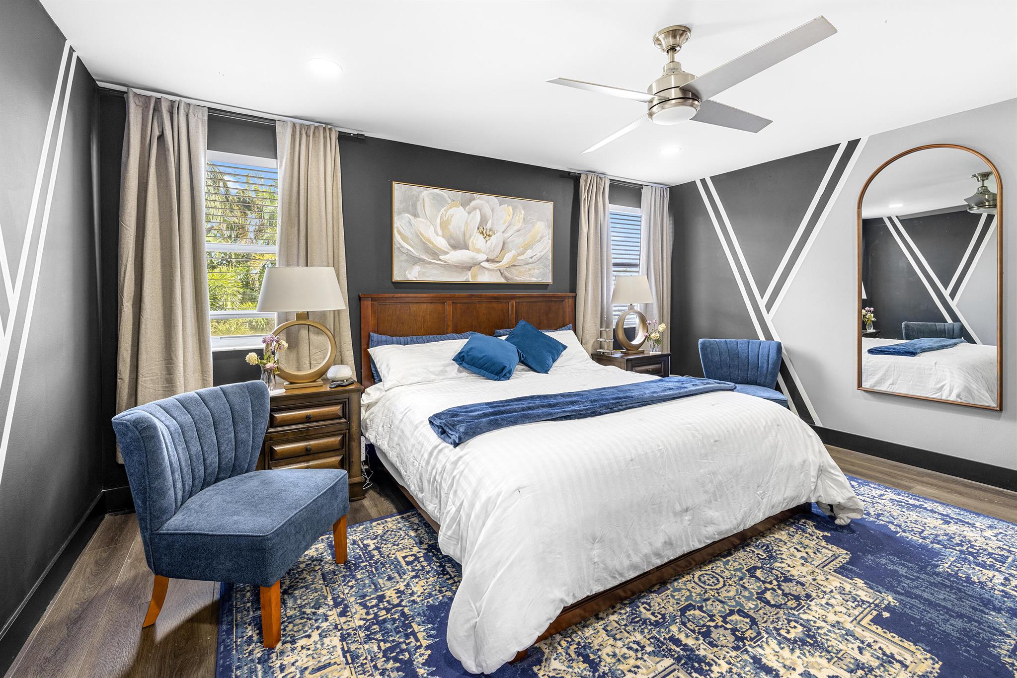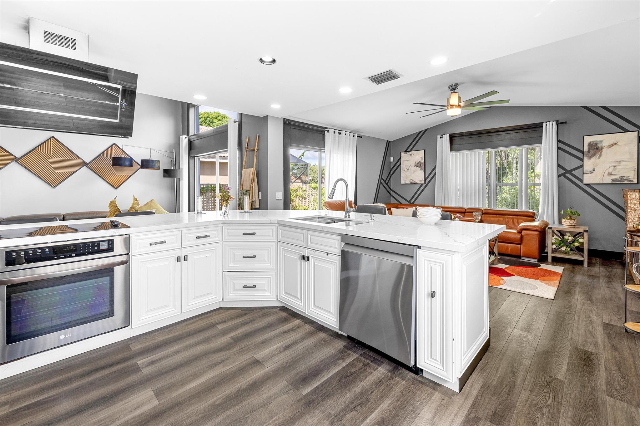 This beautiful and spacious 3-bedroom, 2.5-bathroom home (turnkey all furnishings included) with a 2-car garage offers a perfect blend of indoor comfort and outdoor enjoyment. Laminate flooring runs throughout, and soaring volume ceilings create an airy, open feel. The remodeled open-concept kitchen features quartz countertops, stainless steel appliances, and a peninsula island. The primary suite includes a walk-in closet and an en-suite bathroom with dual sinks, a soaking tub, and a separate shower. Upstairs, a versatile loft provides flexible space for work or relaxation. Unwind on your private, paved patio and take in peaceful lake views. Located in the sought-after Nautica Sound community, residents enjoy access to a pool, fitness center, clubhouse, tennis, basketball and