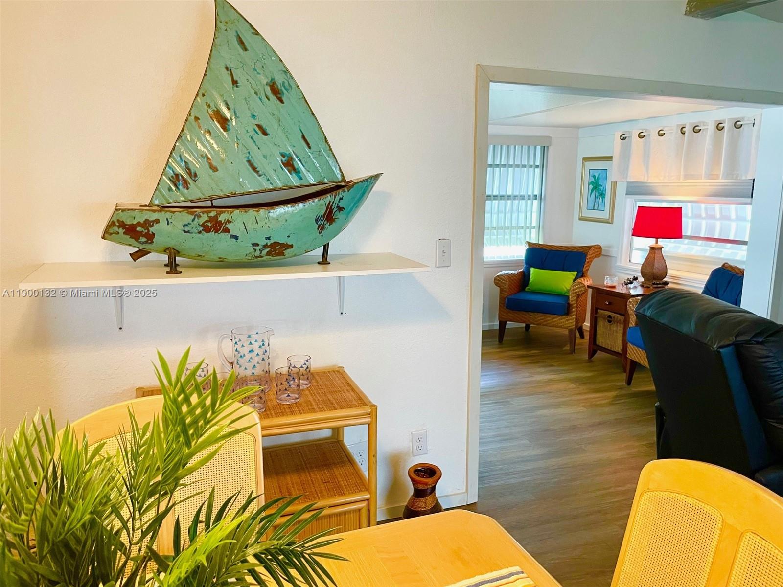 This darling manufactured home was renovated after Hurricane Ian with a bright, colorful aesthetic, ceiling fans and mini-splits for AC. It is filled with tasteful lovely furnishings, festive Florida decor, fun moments of art and collectibles, new dishwasher. Furnishings are negotiable. Carport and 12'x12' storage, screened room, outdoor seating, 2 year old appliances. Can be a great rental property for 12 one-month leases/ year.2.5 miles/ 10 min drive to famous Fort Myers Beach. Close to shopping, golf, parks, restaurants, and bars. Thunderbird is highly desired due to strong sense of community and well maintained home site (431 total) with a pool, party pavilion, horseshoe, shuffleboard, bocce ball court, clubs, monthly events. You own the lot and land all for low monthly HOA of $100!