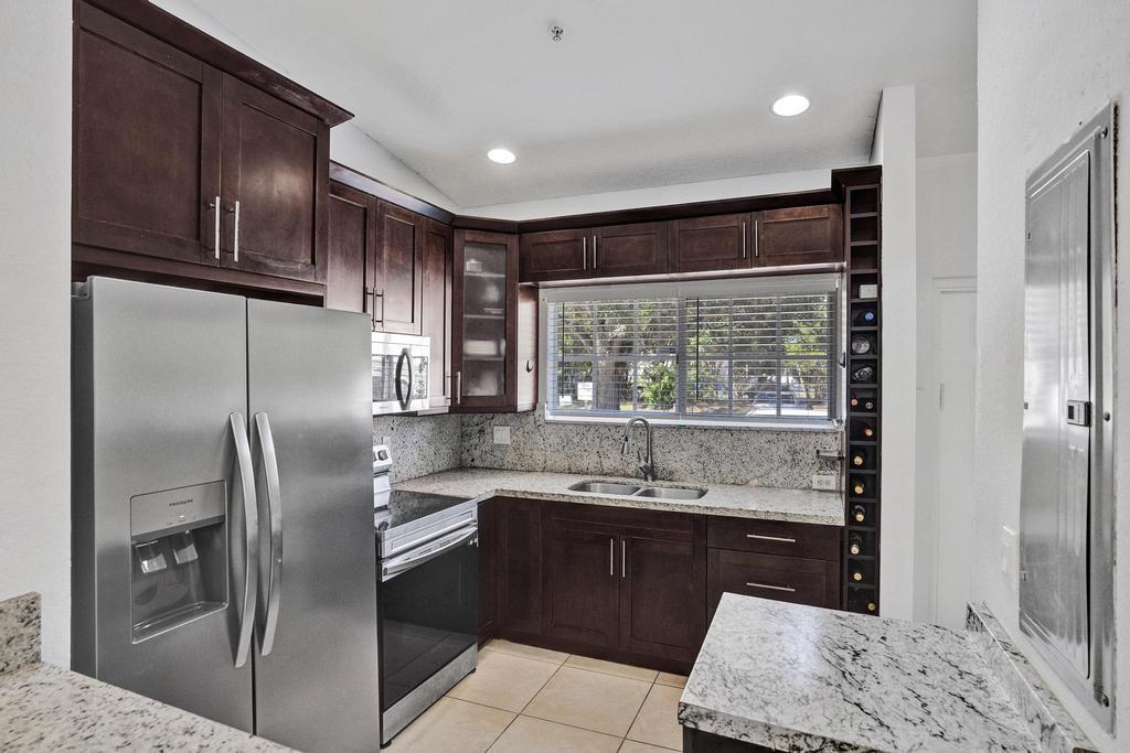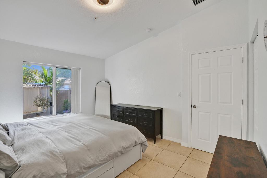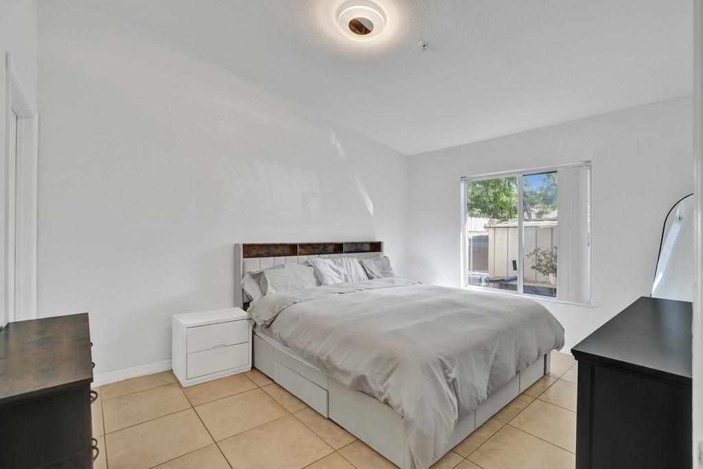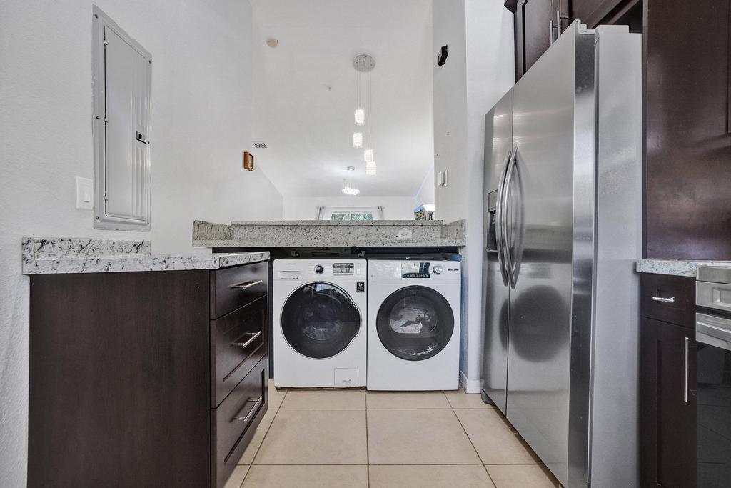 This beautifully maintained, modern one story townhome in a gated neighborhood features a 2 bedroom 2 bath corner unit. The open concept floorpan offers bright living and dining area with high ceilings and tile flooring all throughout the home with updated light fixtures. The kitchen is equipped with ample and soft close cabinet space, granite countertops, updated appliances, recessive lighting and a breakfast bar for convenience. The primary bedroom has a walk-in closet with its private bathroom. Home offers an in unit laundry, plenty of storage with sheds in the back, with an assigned parking and guest parking. You have a backyard that is fenced in for privacy and a barbecue area that you can enjoy with family and friends all year round. Water Heater 2020.