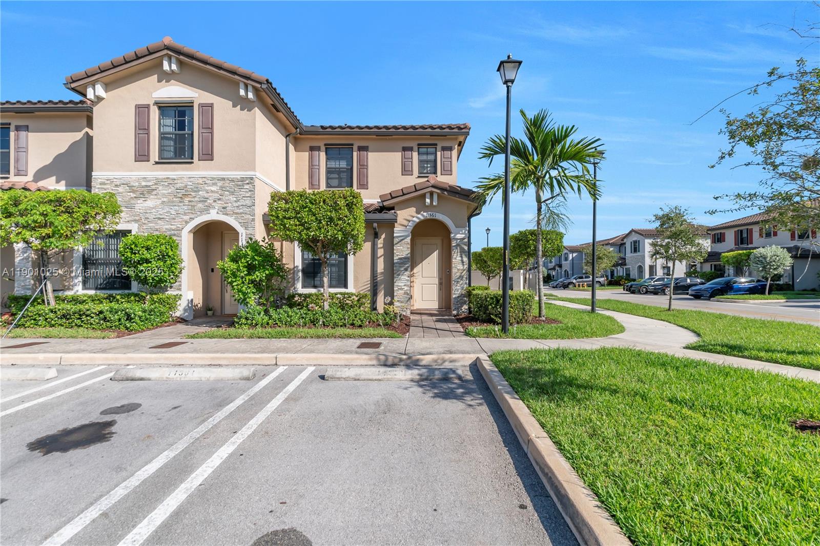 Beautiful 2019-built corner-unit townhouse with very low HOA fees! This spacious 3-bedroom, 3-bath home offers an open-concept layout with a modern kitchen, granite countertops, and a large granite island perfect for entertaining. Fully tiled with laminate in select areas, it blends style and comfort effortlessly. Two bedrooms feature elegant glass-enclosed standing showers. Enjoy outdoor living with a private fenced patio. Washer and dryer conveniently located on the second floor. Tile roof, 2 assigned parking spaces, and move-in ready condition! The low-maintenance HOA fee of $236.44 includes landscaping and rodent pest control. Community amenities include a pool, gym, clubhouse, kids play area and country club—offering resort-style living at an incredible value!