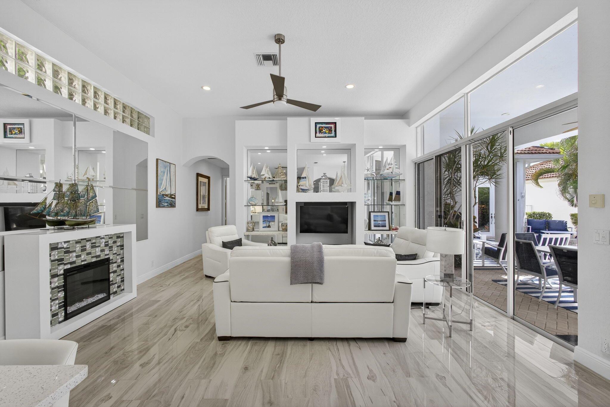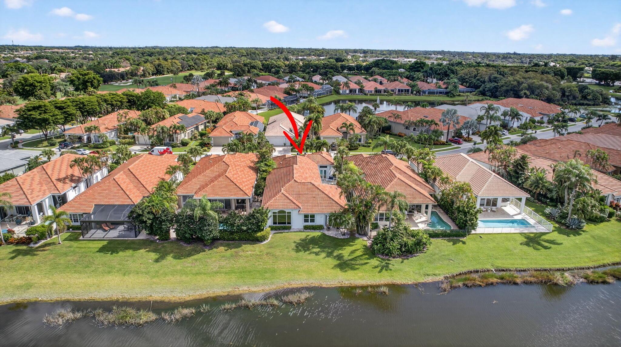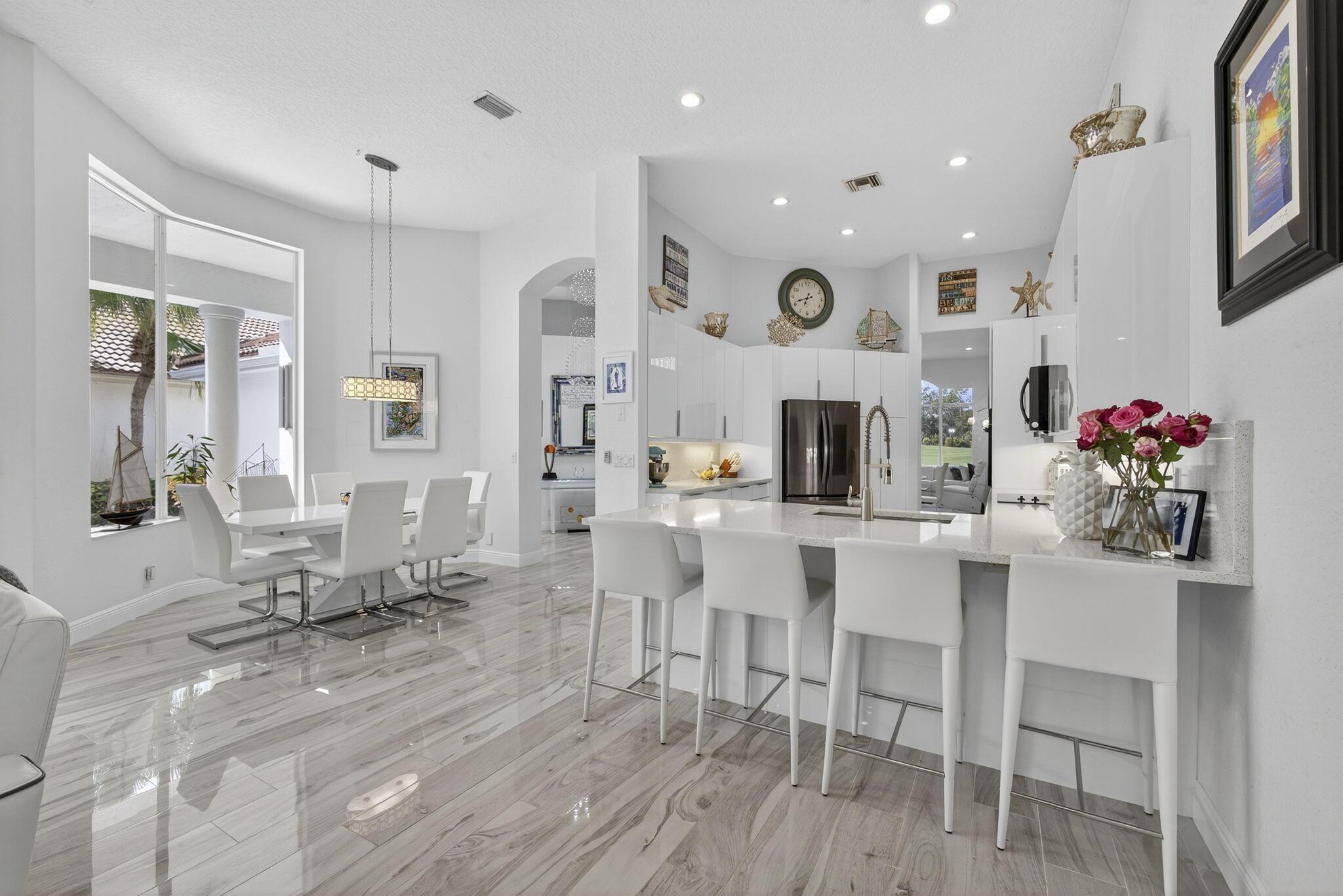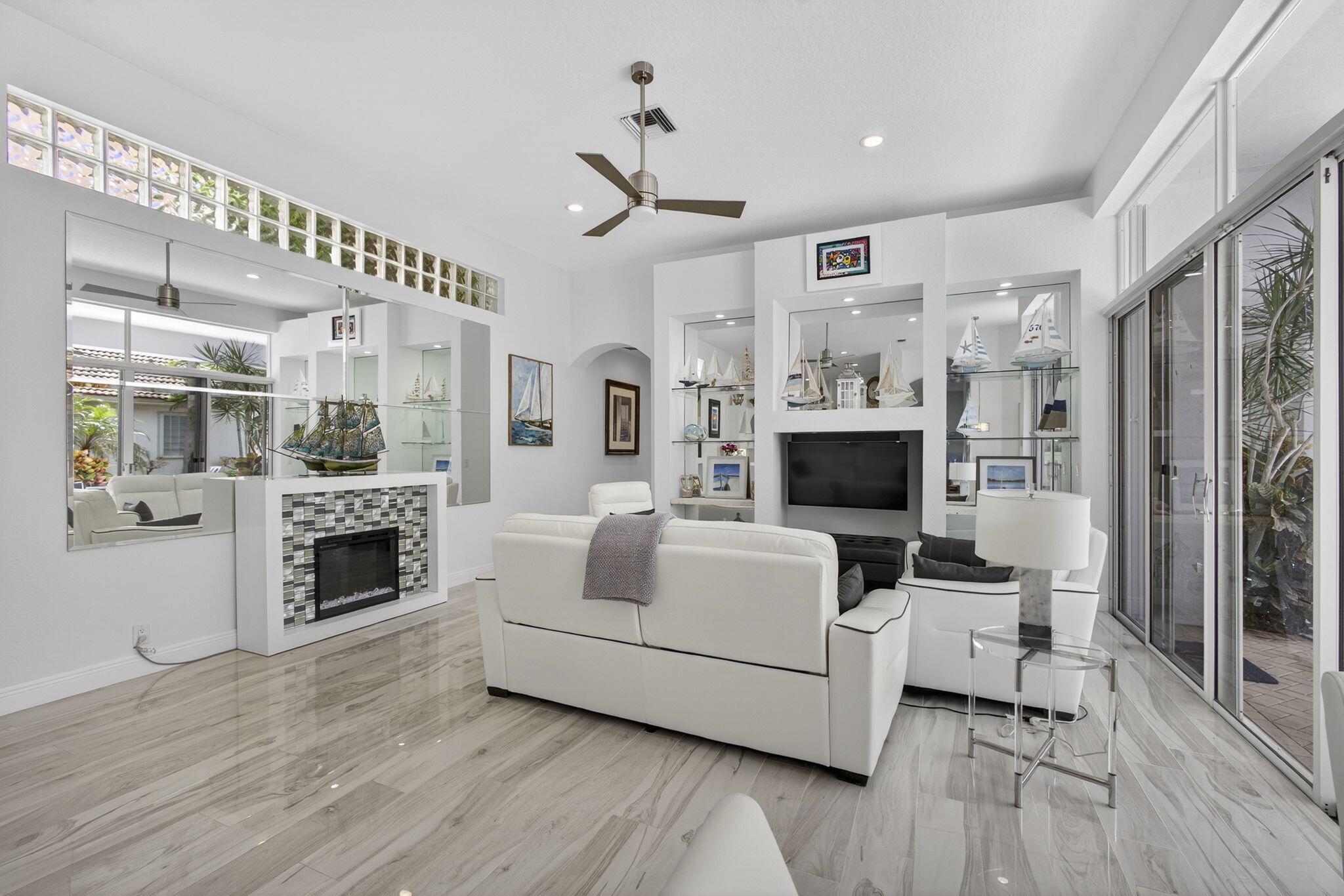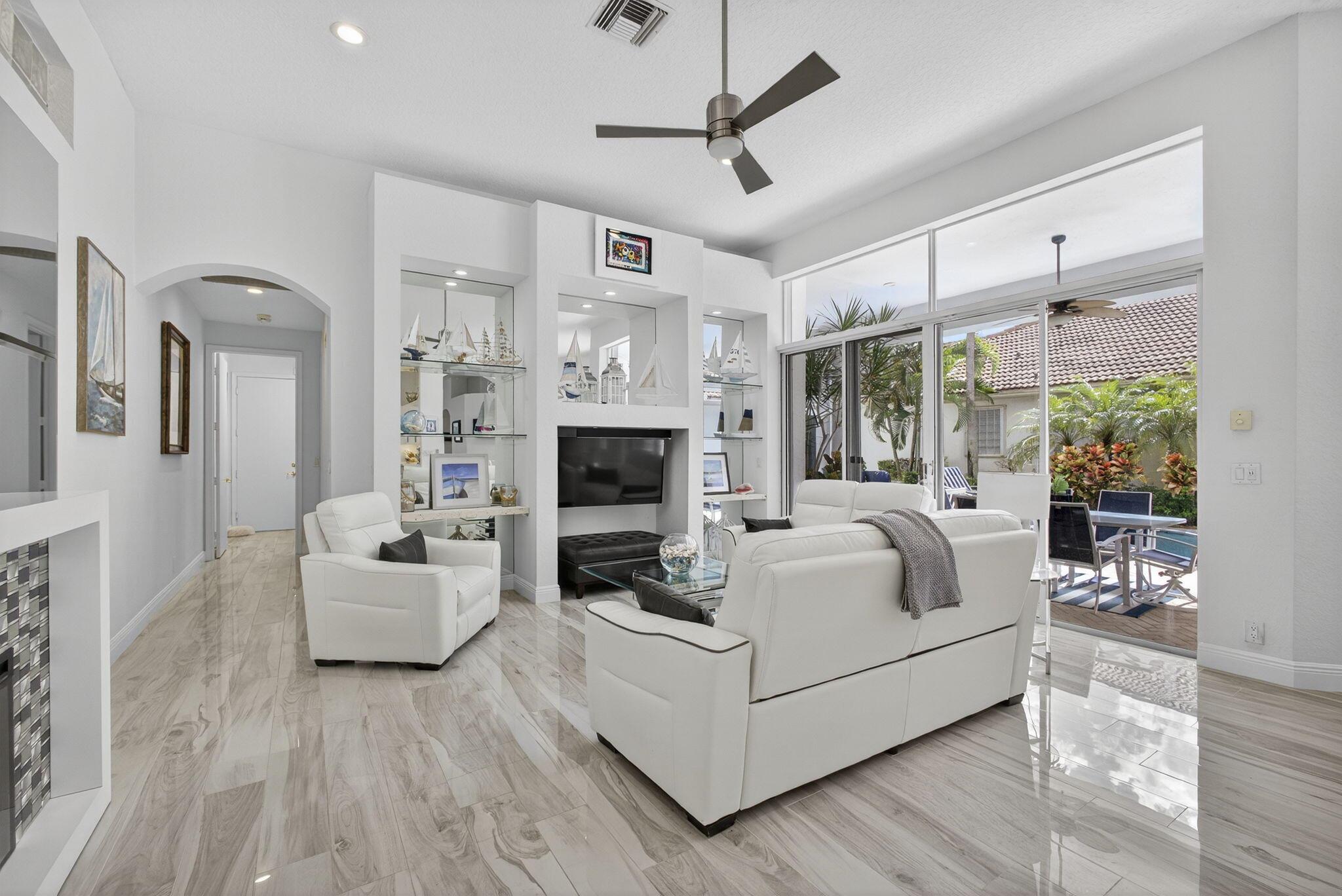 Rarely available courtyard model in Laurel Estates. This stunning home features a private courtyard w/ a large patio & pool surrounded by lush landscaping, plus an oversized 1BD/1BA guest suite with direct courtyard access, ideal for in-laws or guests. The beautifully updated kitchen offers white quartz countertops, white cabinets with pull-outs, and new appliances. Elegant gray & white French porcelain tile flows throughout. The primary suite features new impact French doors that open to the back patio with beautiful lake and golf course views. The great room and dining areas share the same scenic view. A full security system with cameras and remote access adds peace of mind, while the pool area includes a custom safety gate and tasteful blue accent decor for a tranquil outdoor retreat.