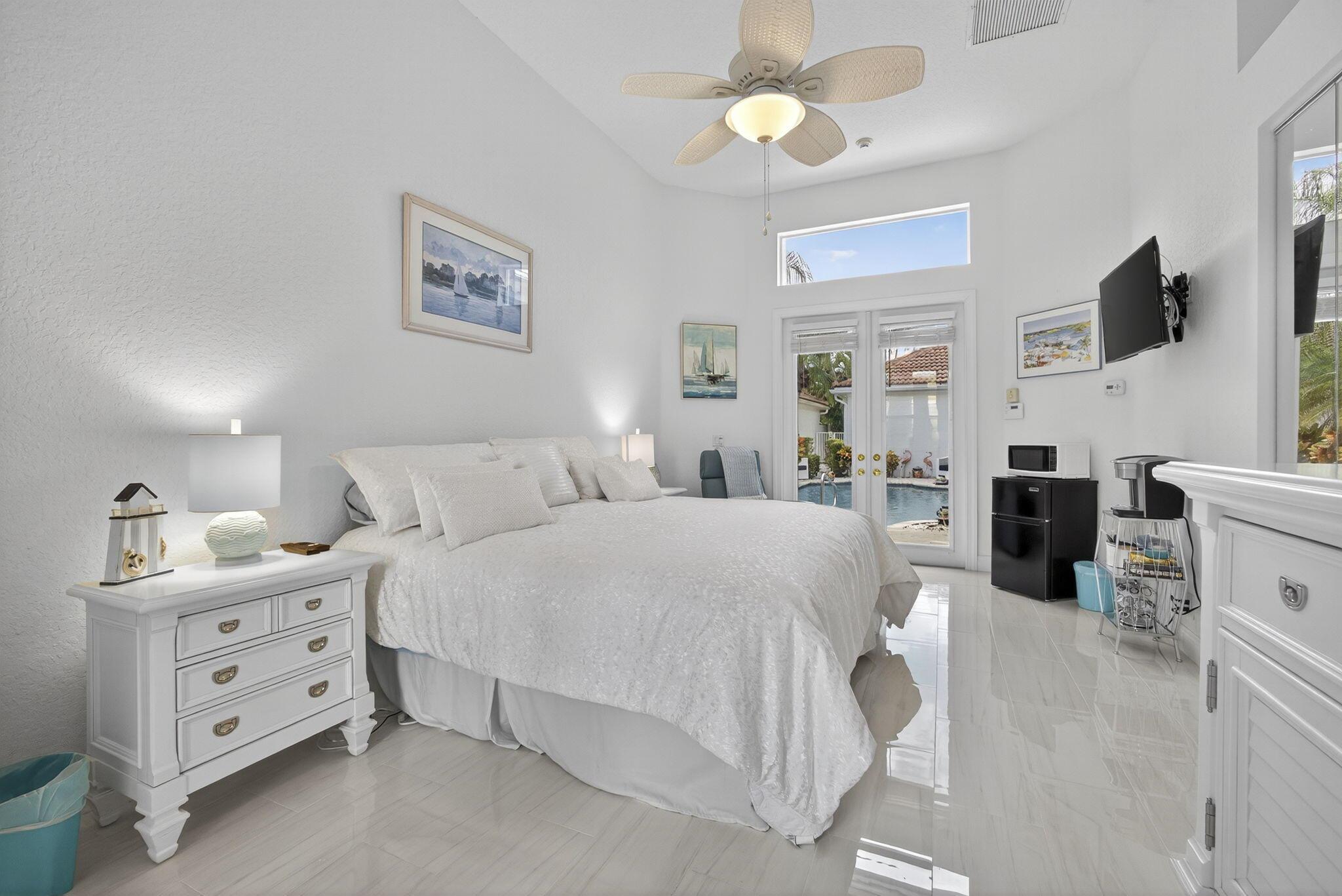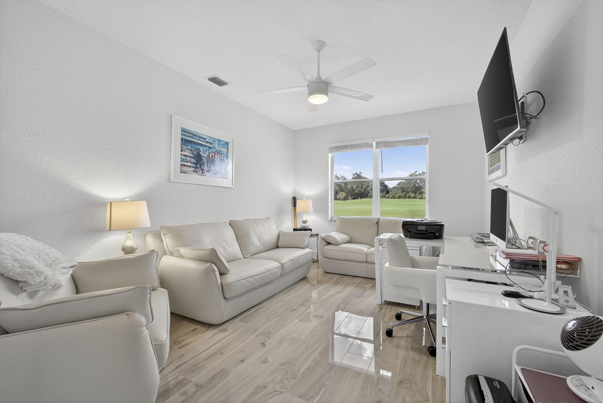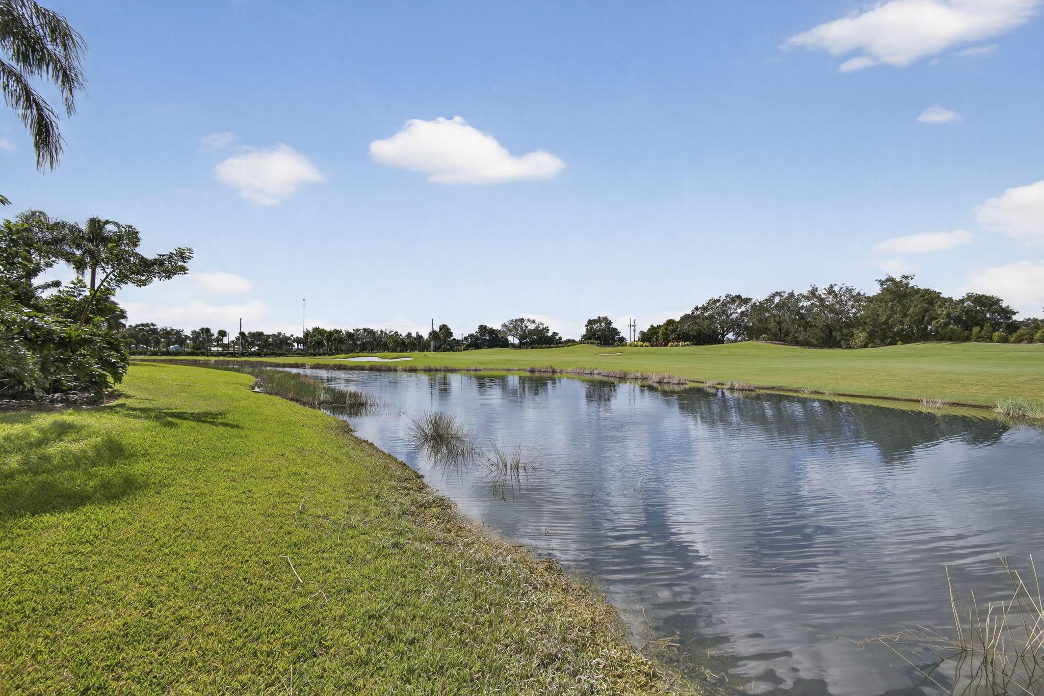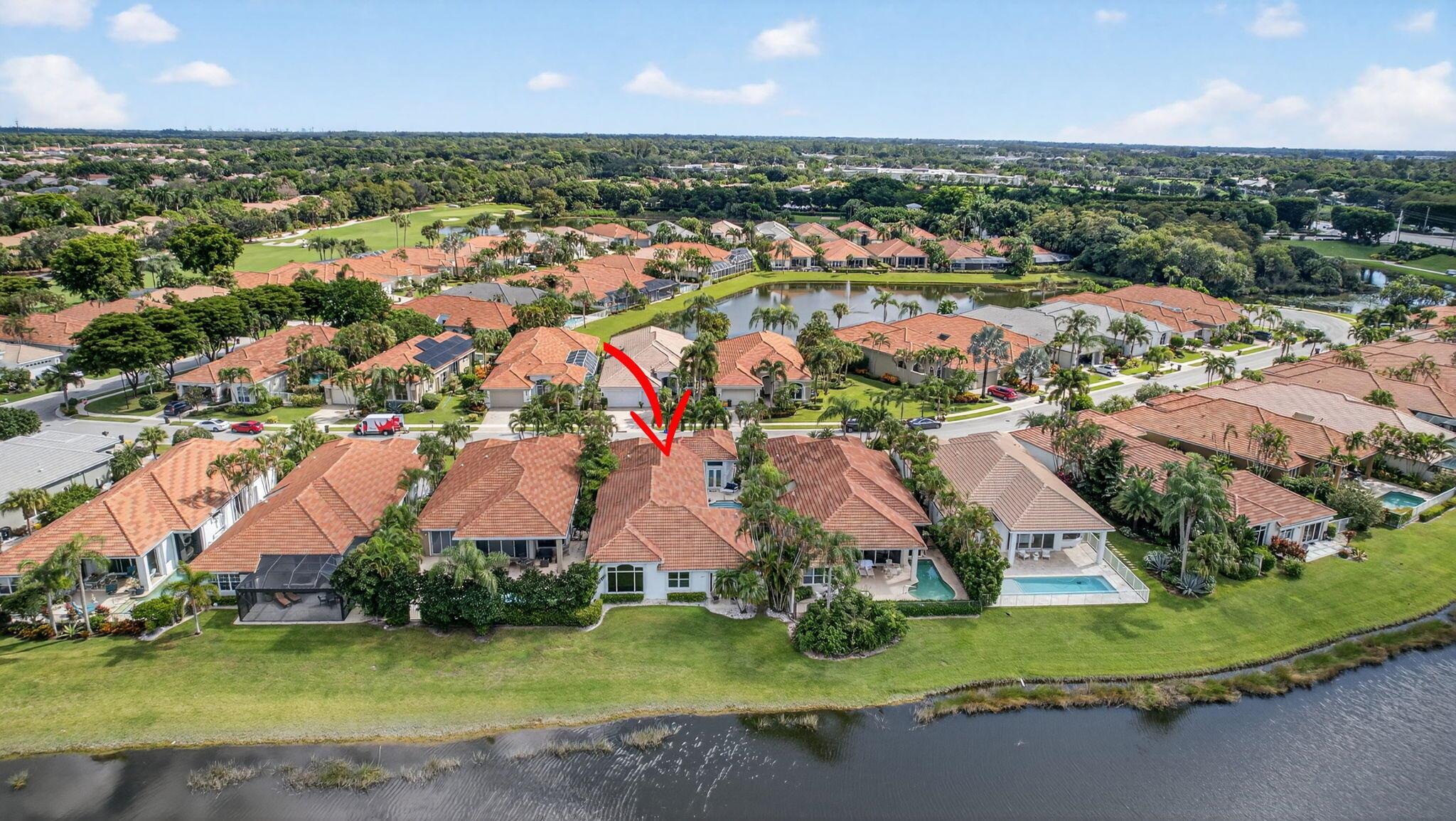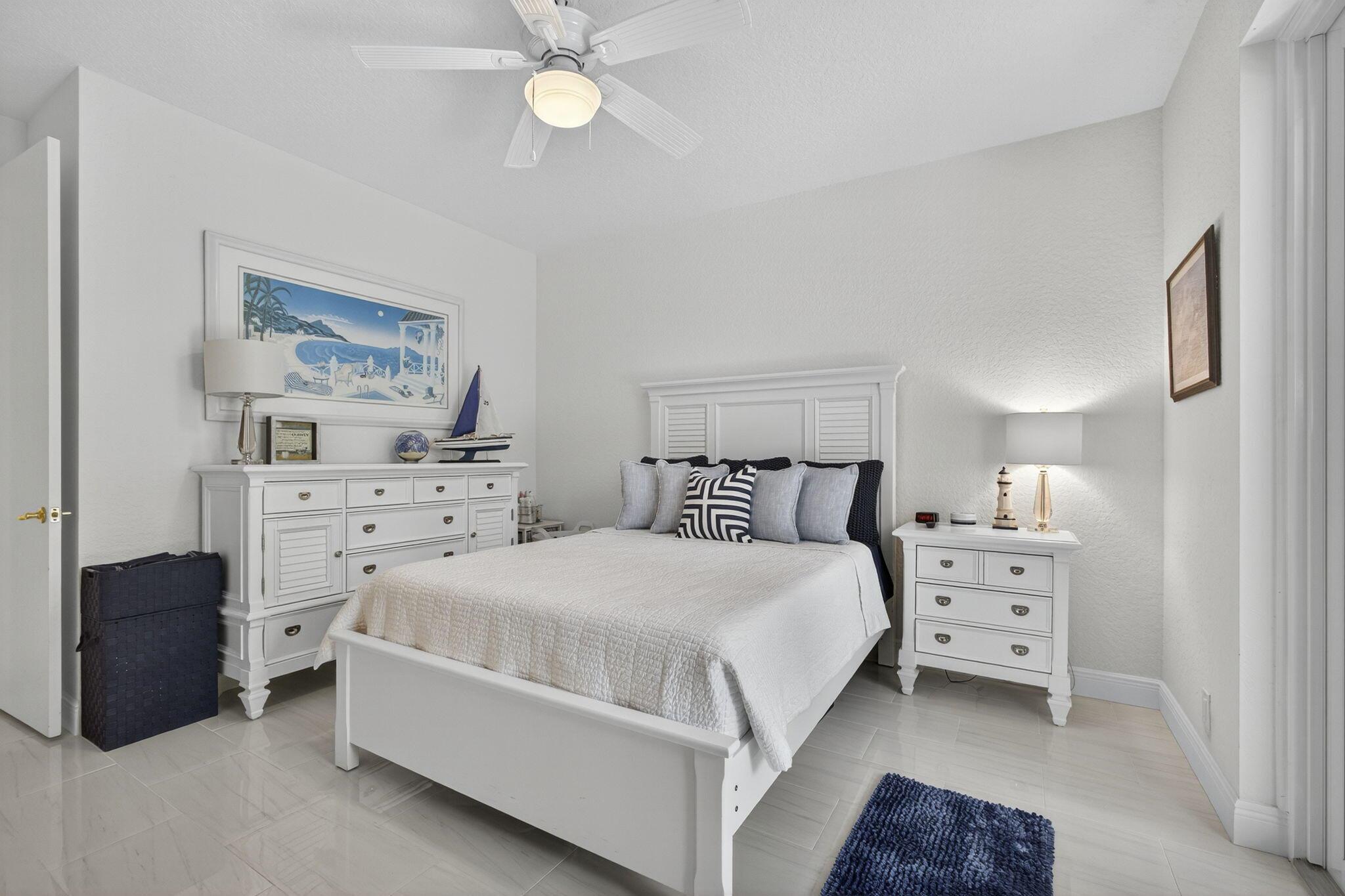 Rarely available courtyard model in Laurel Estates. This stunning home features a private courtyard w/ a large patio & pool surrounded by lush landscaping, plus an oversized 1BD/1BA guest suite with direct courtyard access, ideal for in-laws or guests. The beautifully updated kitchen offers white quartz countertops, white cabinets with pull-outs, and new appliances. Elegant gray & white French porcelain tile flows throughout. The primary suite features new impact French doors that open to the back patio with beautiful lake and golf course views. The great room and dining areas share the same scenic view. A full security system with cameras and remote access adds peace of mind, while the pool area includes a custom safety gate and tasteful blue accent decor for a tranquil outdoor retreat.