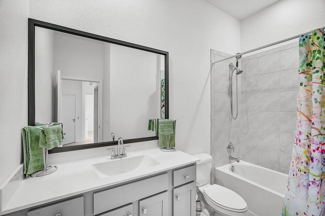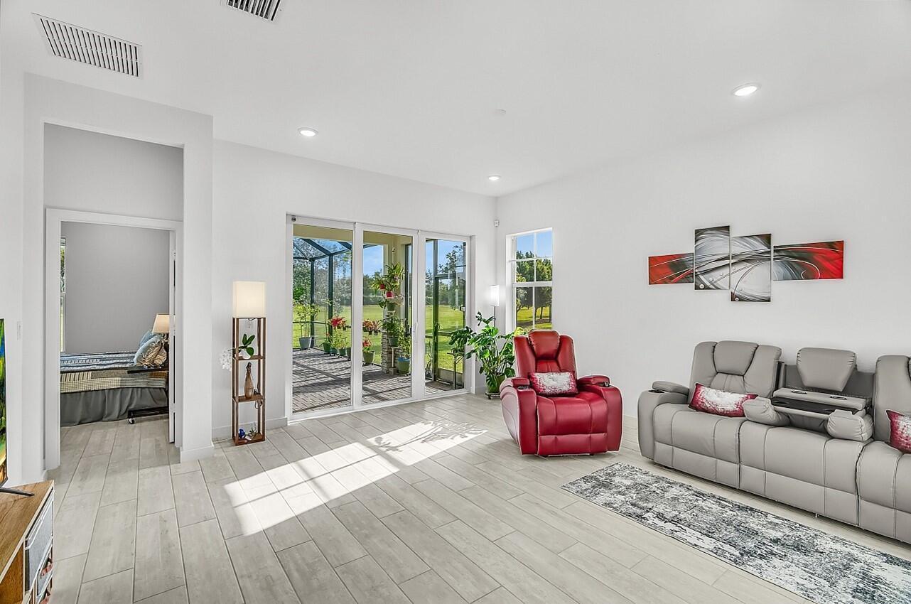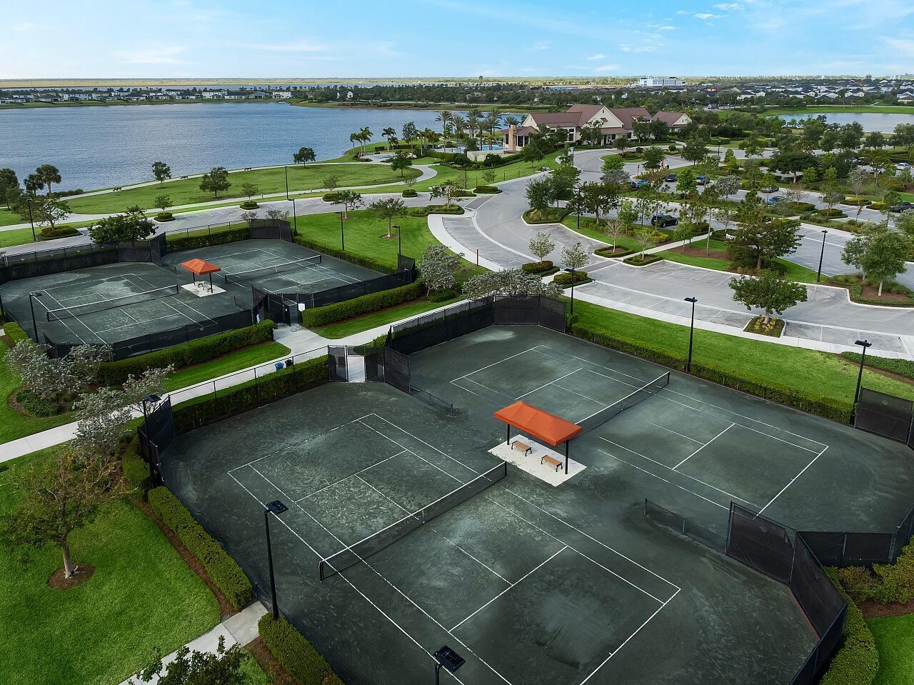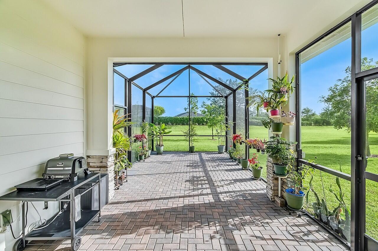 Welcome to this spotless 3-Bed + large Den, 2-Bath, 2-car garage villa on a large lot. Staggered ceramic tiles throughout (no carpets!), quartz countertops, and light kitchen cabinets create a modern and clean look. Two walk-in closets, hers with custom wardrobe cabinets, double sinks in the master, laundry room with extra cabinets. Reinforced, insulated garage door, impact windows throughout. N-S orientation, with an oversized screen-enclosed patio facing north. Large common area at the back, 20 miles of scenic trails, fishing pier, boat launch ramp, tennis, basketball, pickleball, soccer field, 2-level pool, hot tub, gym. Organic farm, new K-5 school within walking distance. Come to the resort-like community of Arden and enjoy life in a meticulously maintained, comfortable home.