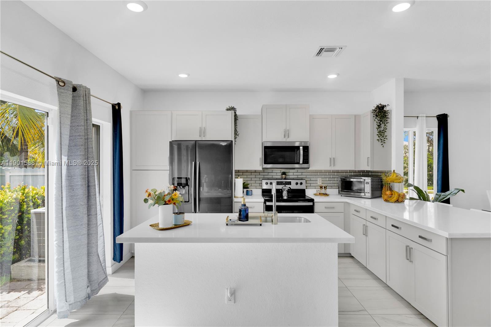 Built in 2021, this modern 3-bedroom, 2-bath home offers open-concept living and a private tropical oasis in your own backyard. Featuring a bright kitchen with quartz countertops, stainless steel appliances, and an oversized island, this home is perfect for entertaining. Natural light fills the living areas, creating a warm and inviting atmosphere. The fully fenced yard is professionally landscaped with mature palms, a covered gazebo, and space to relax or host gatherings. Located in a sought-after community near top-rated schools, shopping, dining, and major highways, this move-in ready home delivers comfort, style, and the Florida lifestyle you’ve been waiting for.