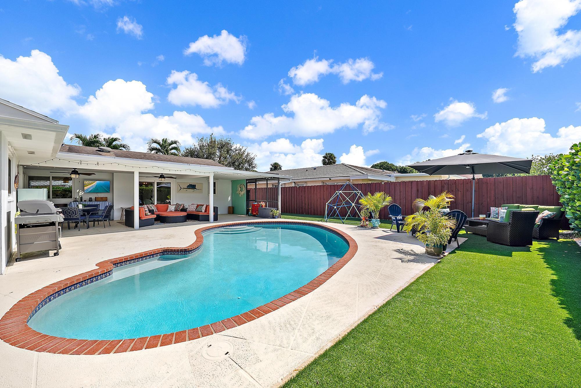 Experience the ideal blend of Florida elegance and Serena & Lily-inspired design in this light & airy Palm Beach Gardens CBS home. Featuring designer finishes throughout, this residence exudes modern sophistication & comfort with sleek, modern details such as 36'' porcelain flooring (2024), crown molding, Impact glass, new interior/exterior paint, 2024 professionally designed bathroom renovations & a 2024 customized resort-style entertainment area -- featuring an expansive covered patio, large heated saltwater pool, lush turf backyard, and plenty of space for soccer, a garden party or a backyard BBQ. Perfect for fun or relaxed Florida evenings with friends. (see more)